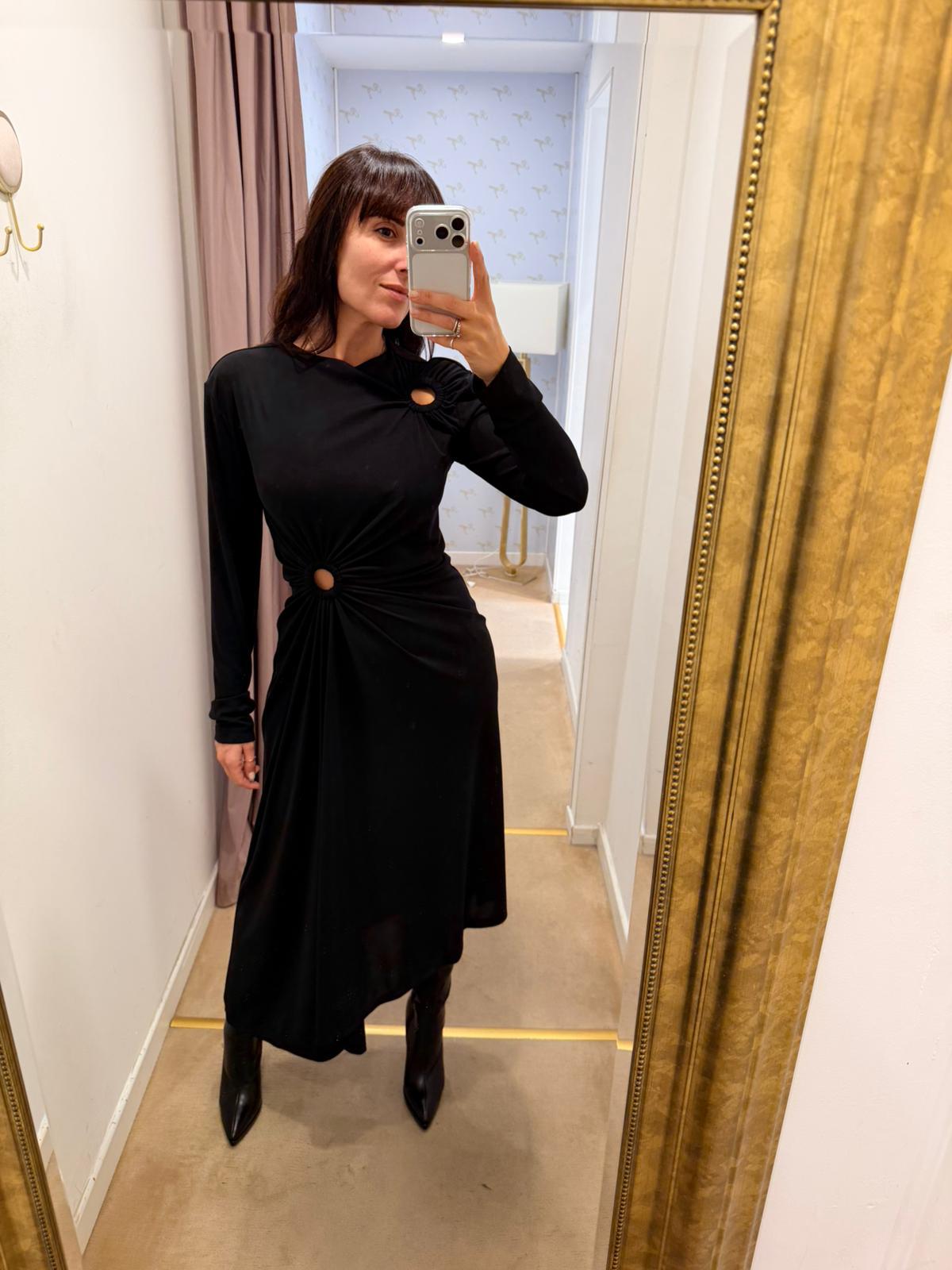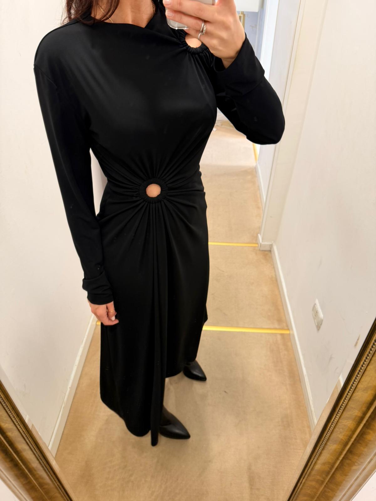 Abito lungo caratterizzato da drappeggi sofisticati e dettagli cut-out circolari. La linea asimmetrica dell’orlo e la chiusura zip posteriore enfatizzano un’estetica contemporanea e personale. Una scelta distintiva per chi ricerca modelli di tendenza e possibilità di espressione individuale attraverso il guardaroba.