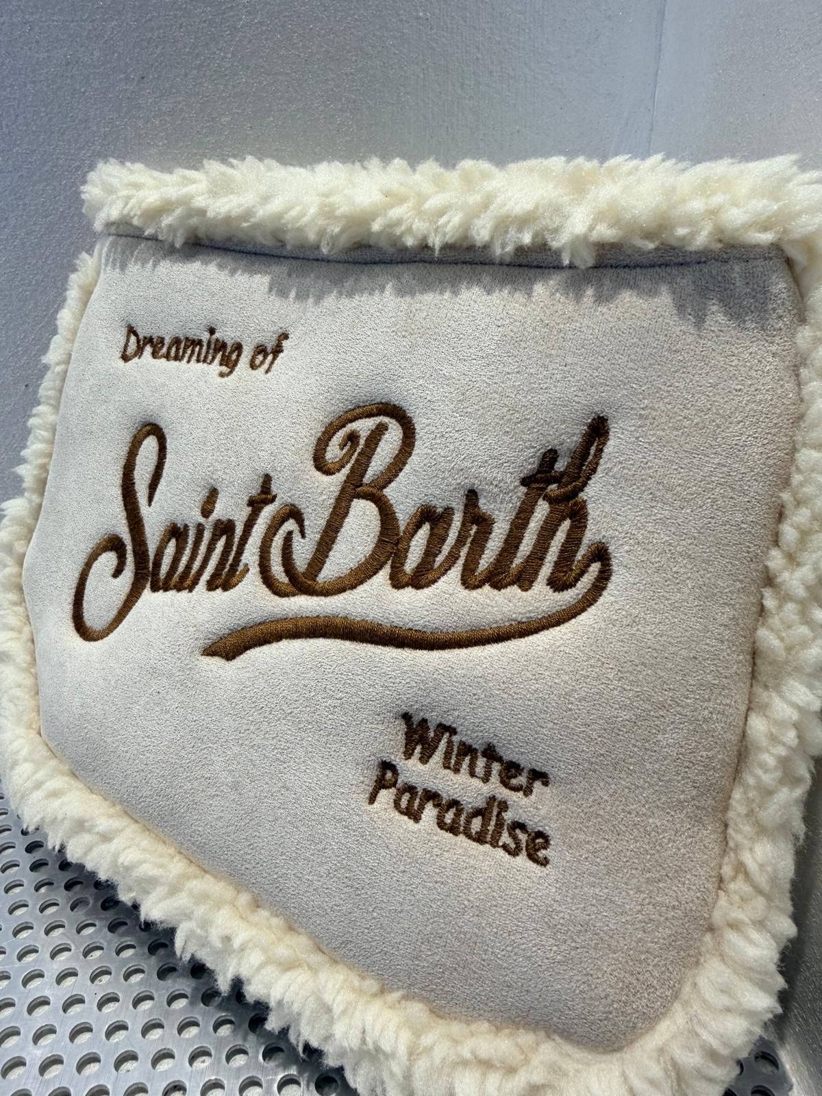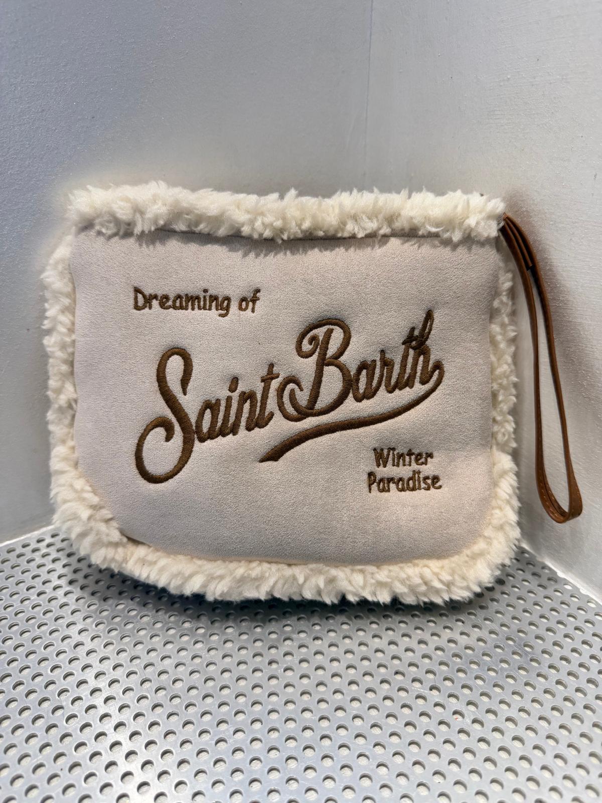 Pochette effetto suede, rifinita con bordo in morbida pelliccia sintetica. Sul lato frontale è ricamata la firma Saint Barth.