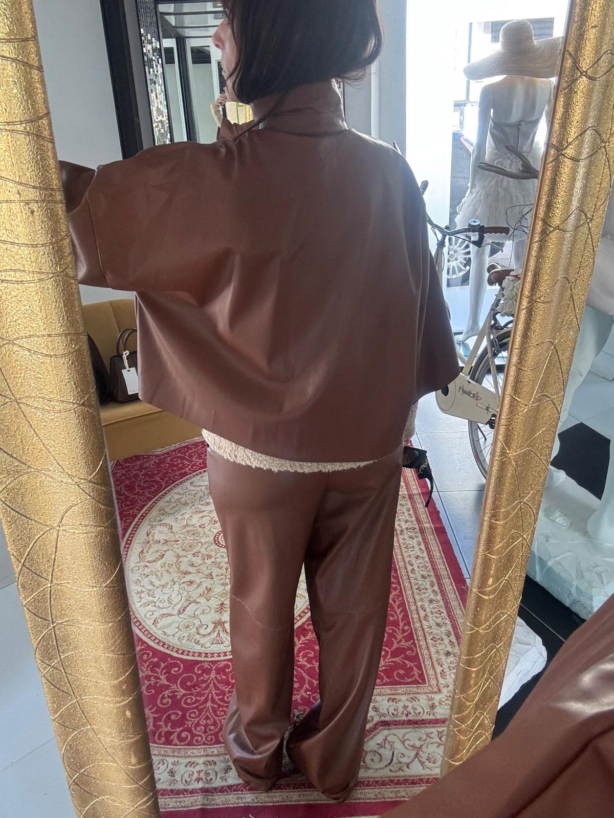 • Sotto si intravede un maglione in lana beige bouclé, che crea un bel contrasto di texture.