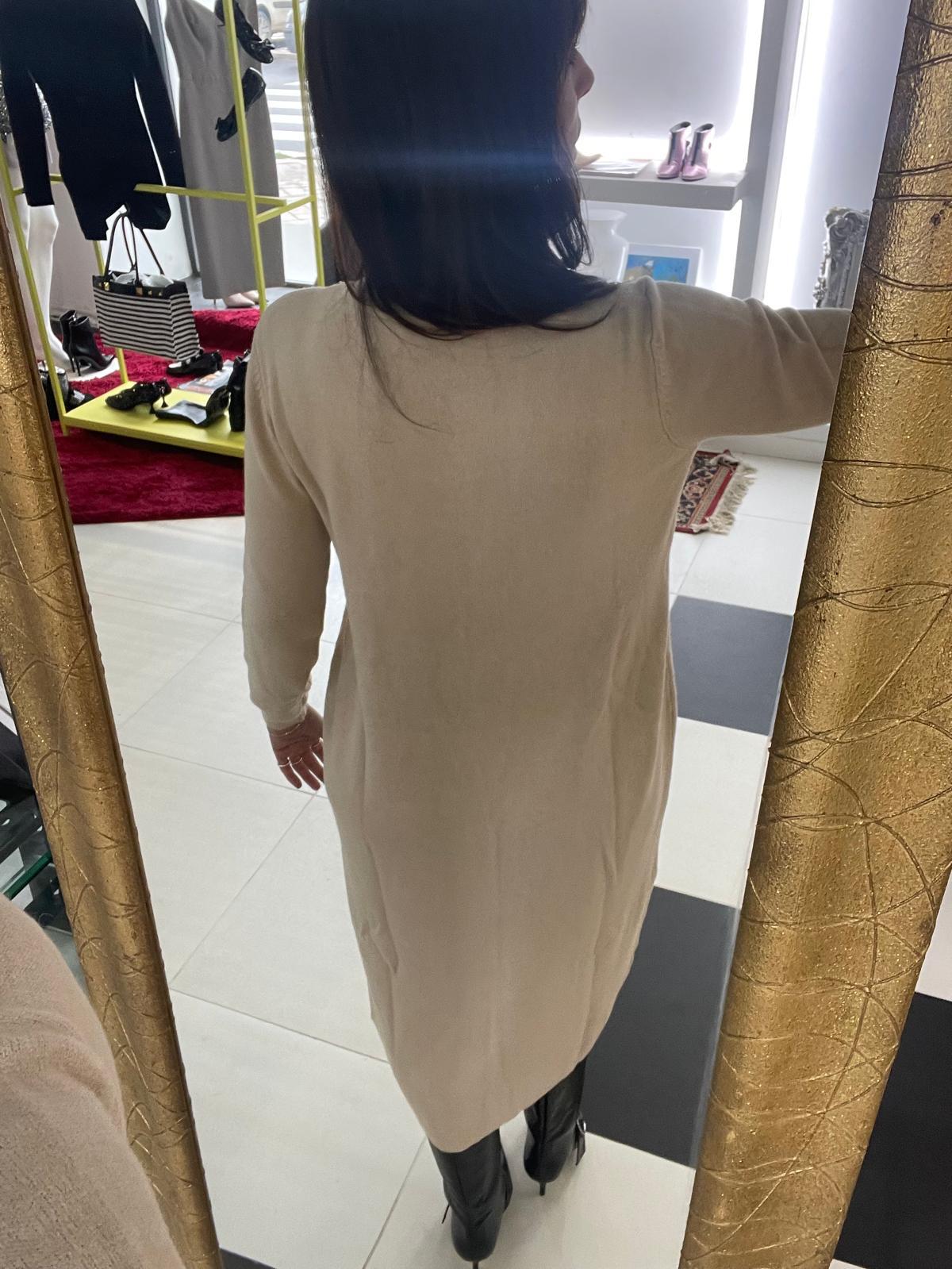 Il taglio dritto e leggermente morbido valorizza la figura senza costringerla, offrendo uno stile pulito e contemporaneo.