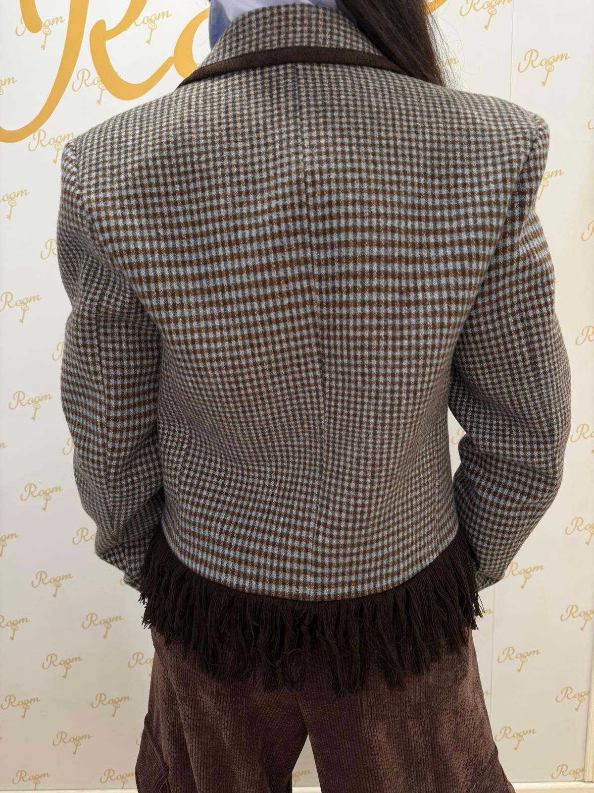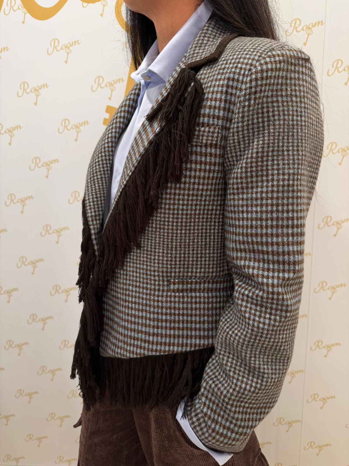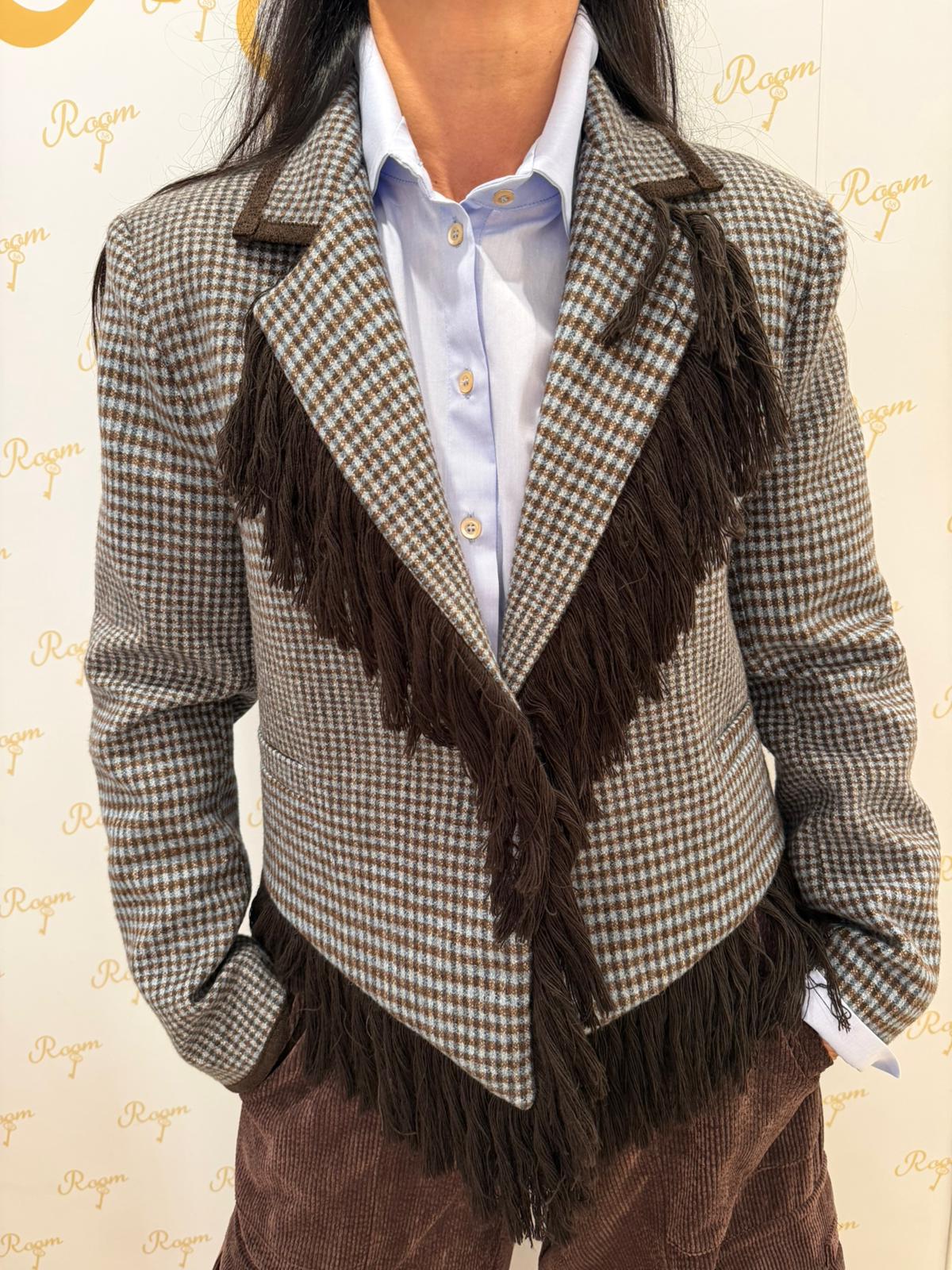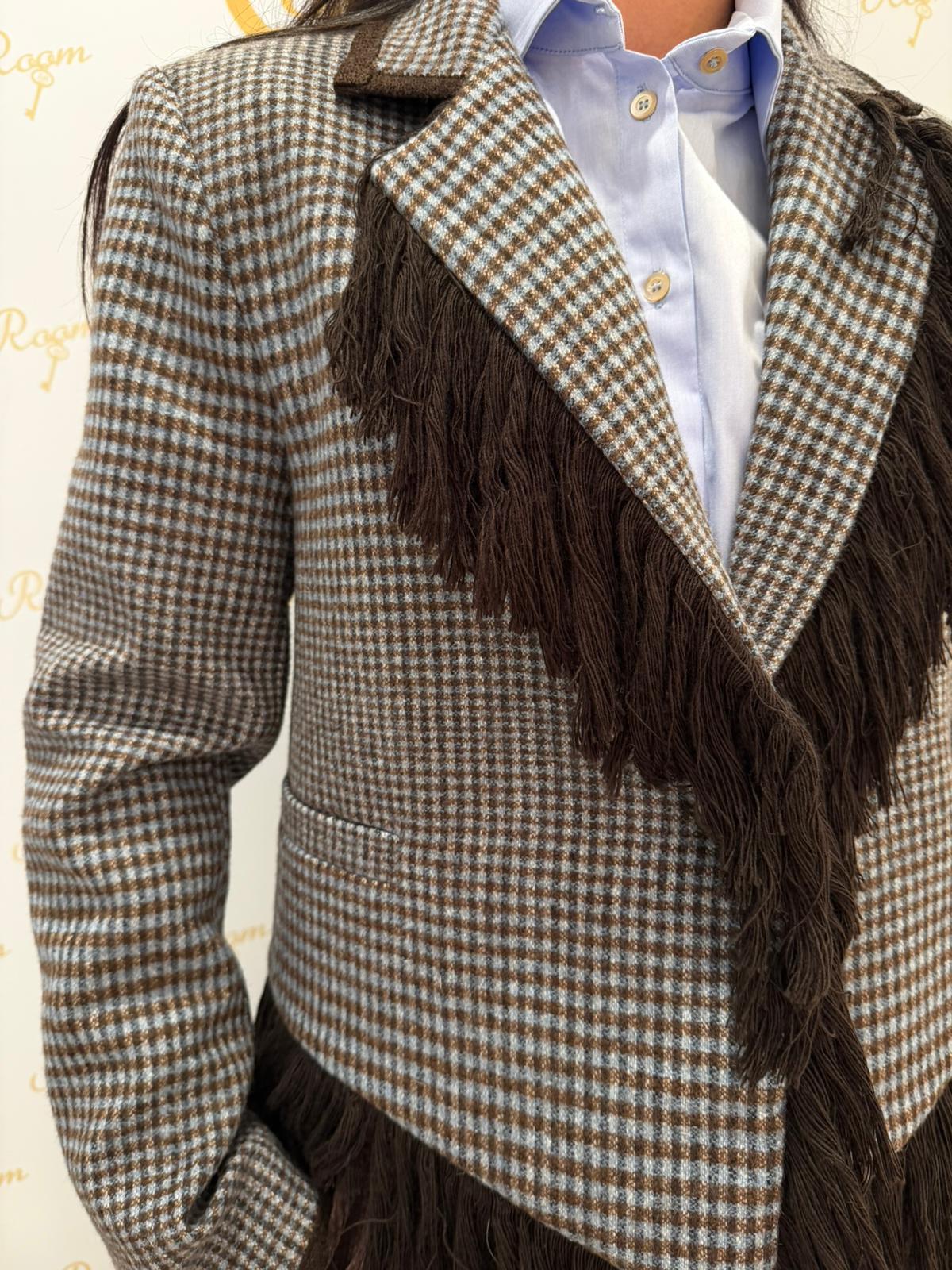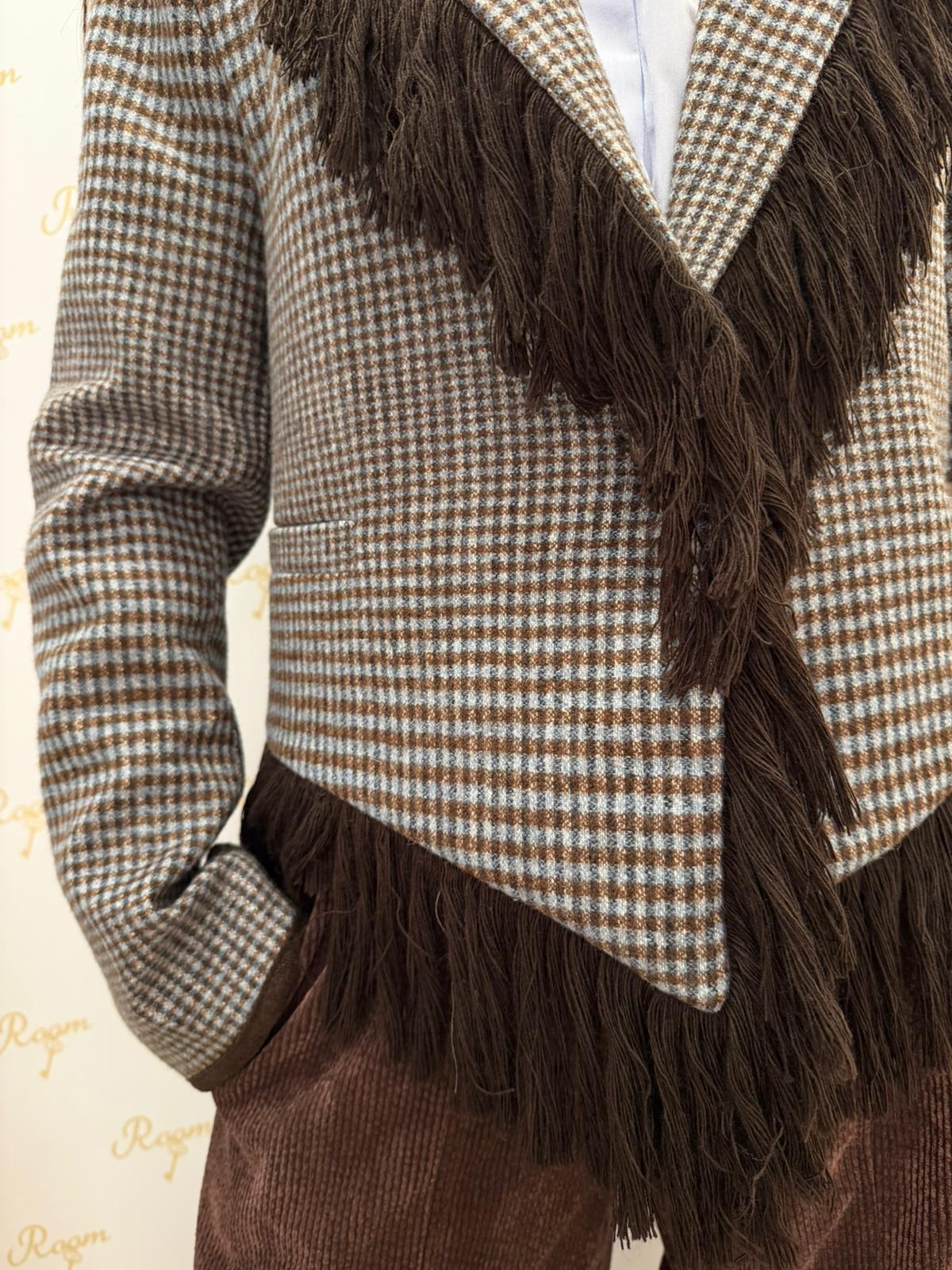 • Dettagli: Applicazioni di frange in camoscio o tessuto scuro che incorniciano il petto e l'orlo, conferendo un'estetica cowboy rivisitata.