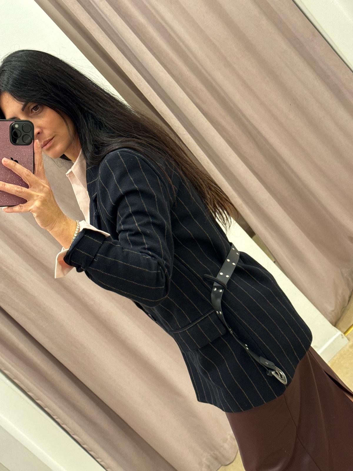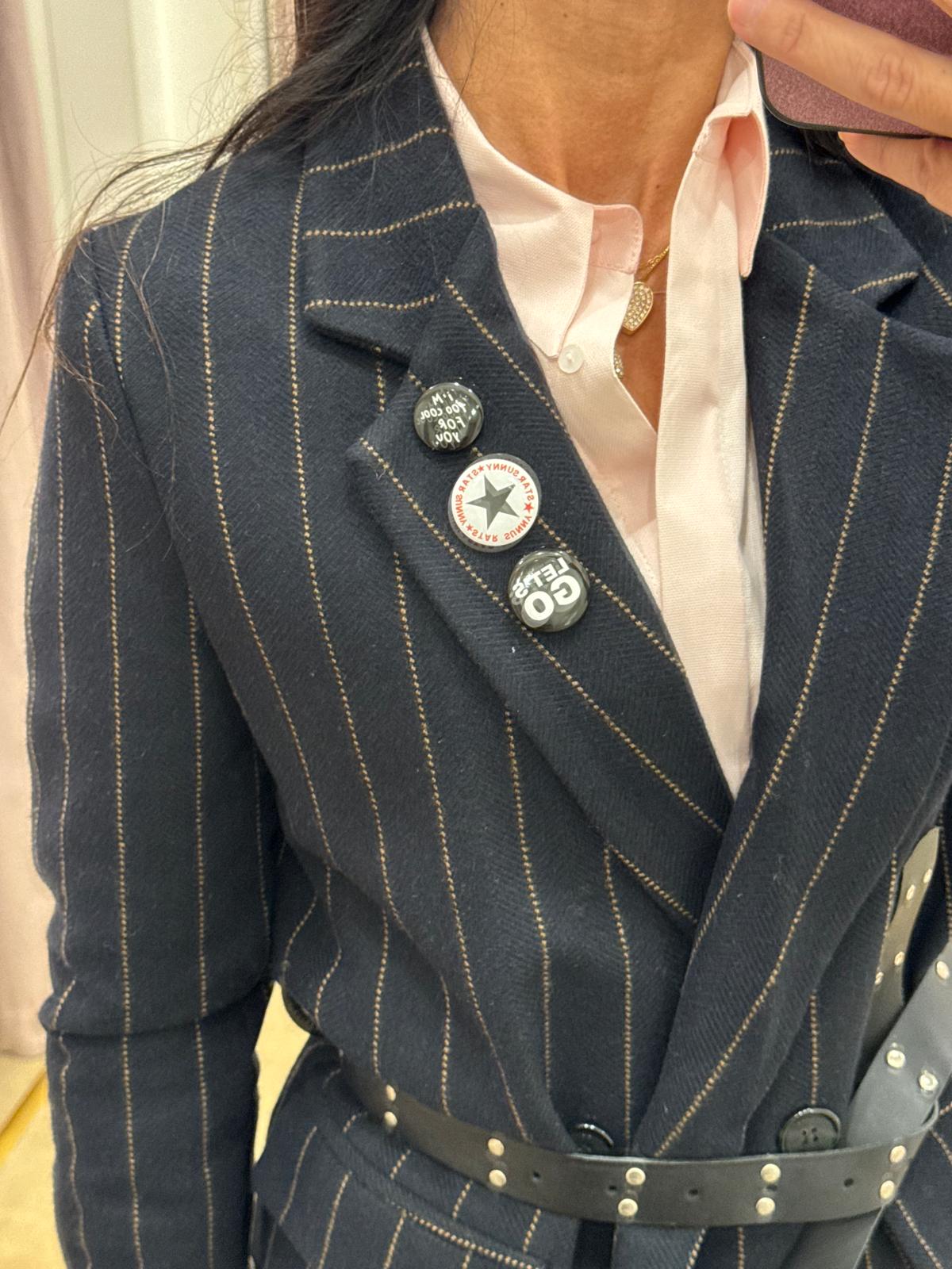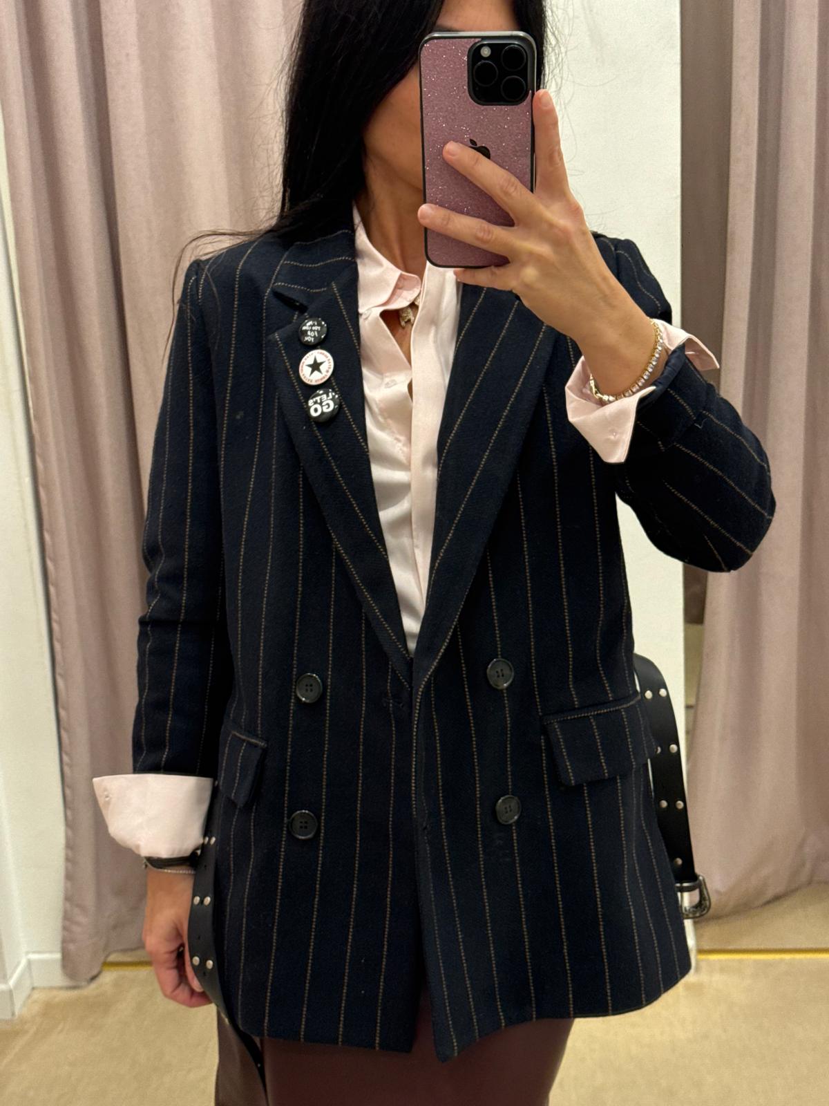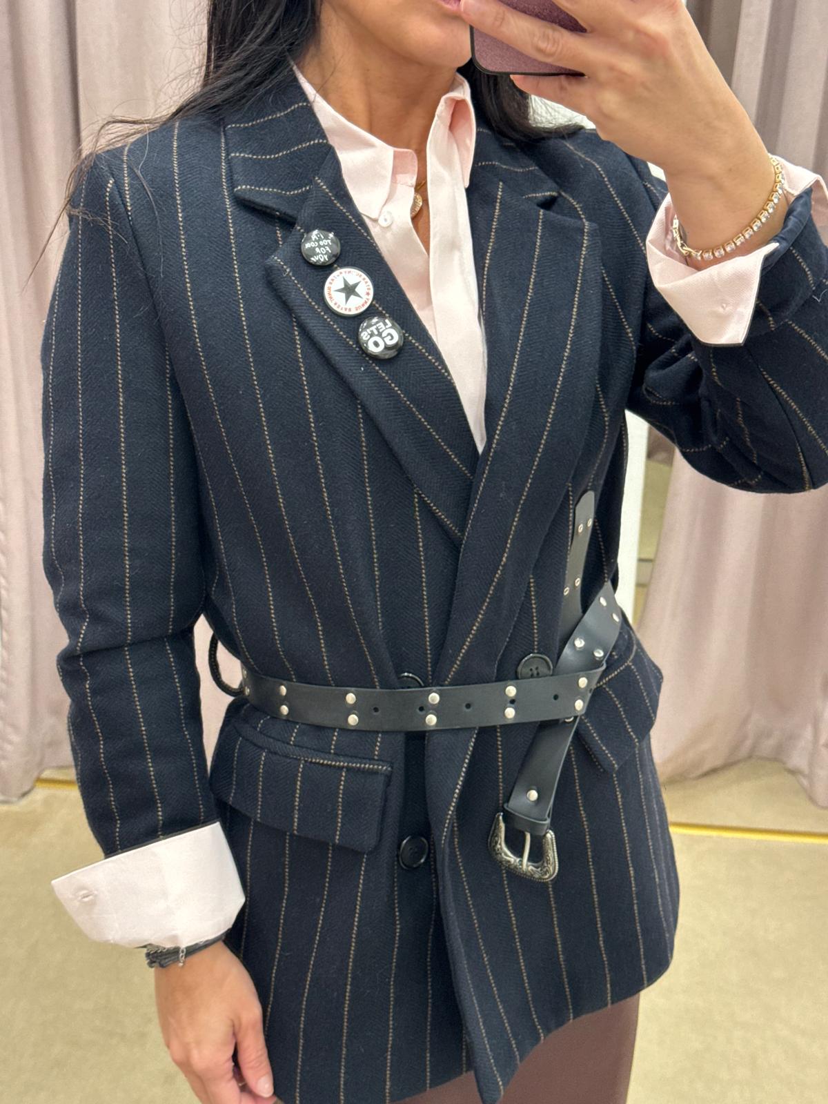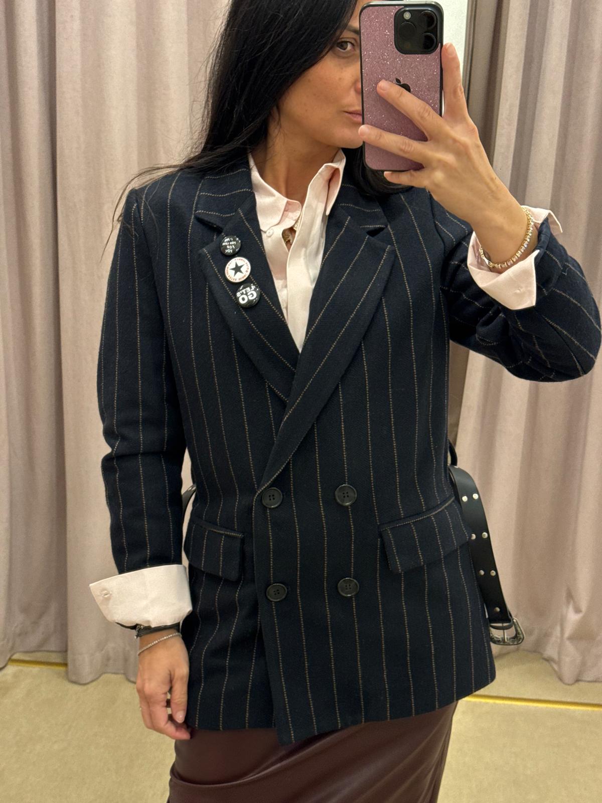 • Dettagli: Revers classici, tasche a filetto e spilla decorative applicate.