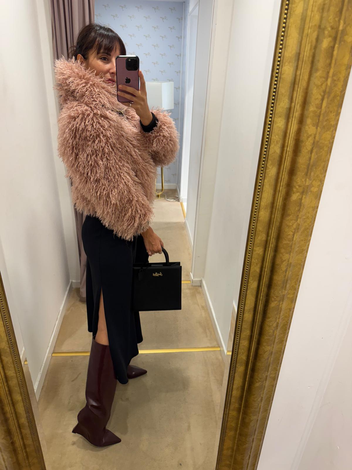 • Abbinamento nella foto: sopra un abito nero e con borsa nera strutturata — un mix chic e trendy.