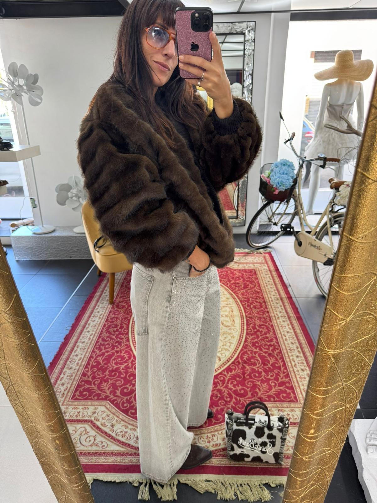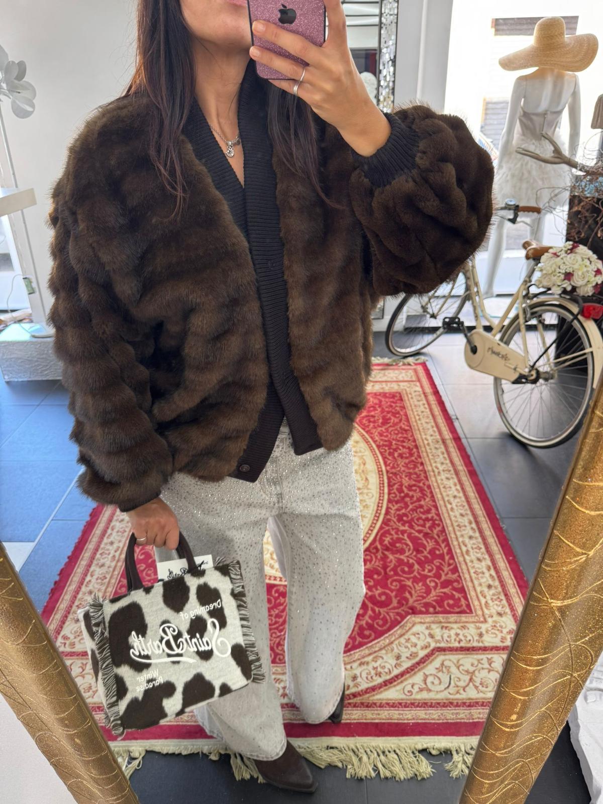 Bomber in eco-pelliccia marrone, voluminoso e abbinato a pantaloni grigio chiaro decorati con micro strass, che aggiungono luce e contrasto. Il look è completato da una borsa in tessuto maculato bianco e marrone con scritta “Saint Barth”, che dona un tocco ironico e contemporaneo.