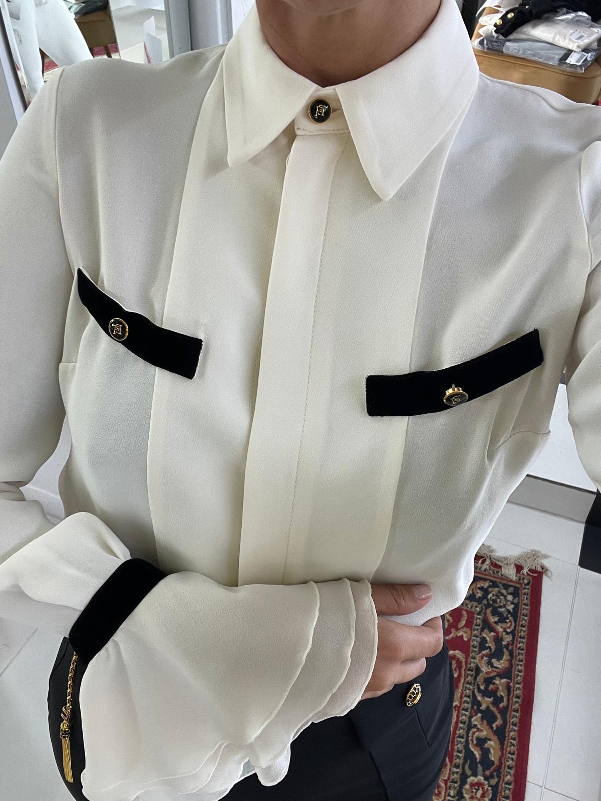 Camicia in georgette dalla vestibilità slim. Ha colletto classico e plastron sul davanti a donare struttura. Si distingue per i tripli polsi a campanella che aggiungono un'ultima nota di leggerezza al capo. Impreziosita dai bottoni smaltati con logo.