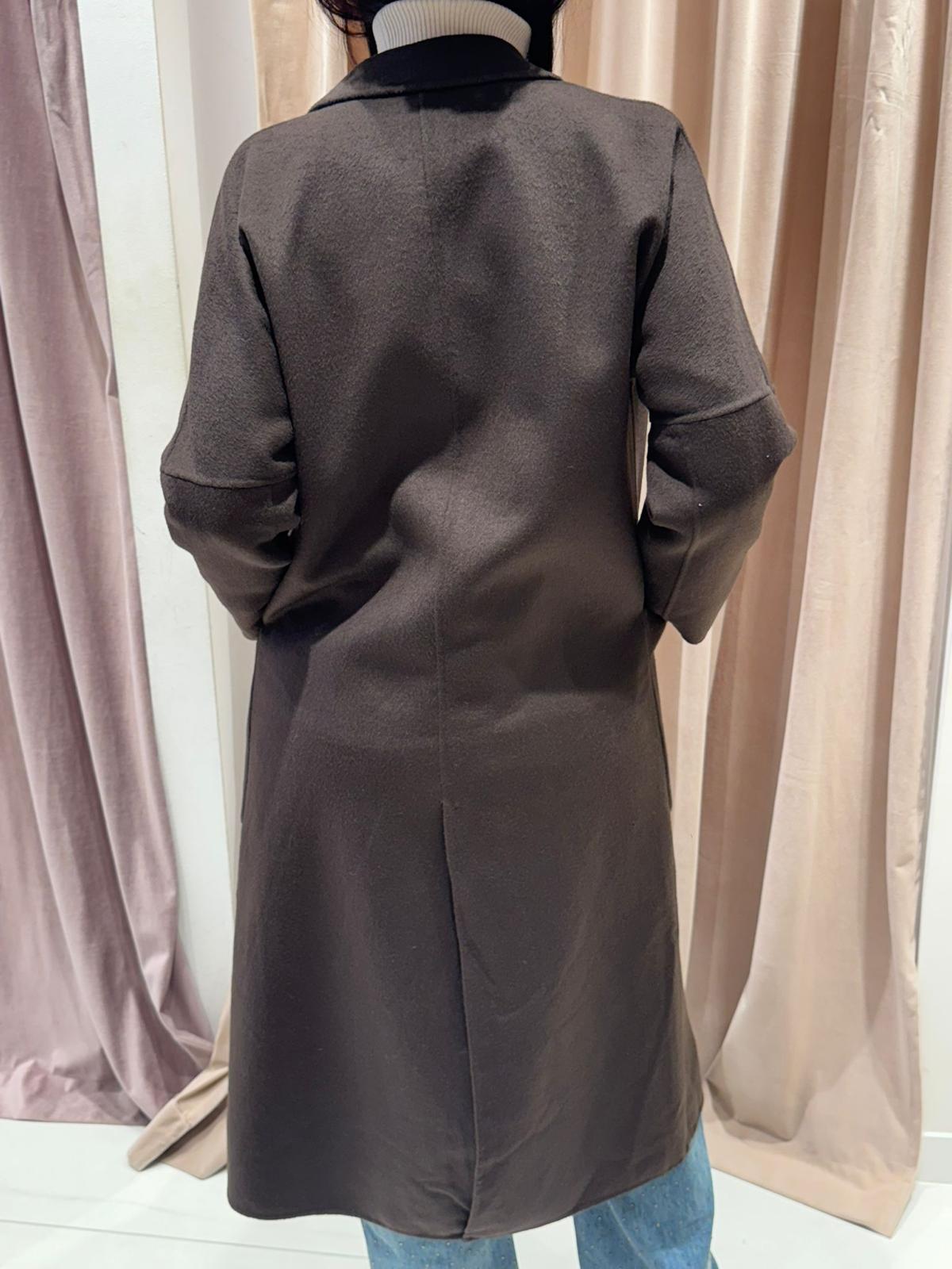 Questo cappotto in panno cioccolato ha una linea dritta e leggermente sciancrata, con doppia abbottonatura e tasche applicate.