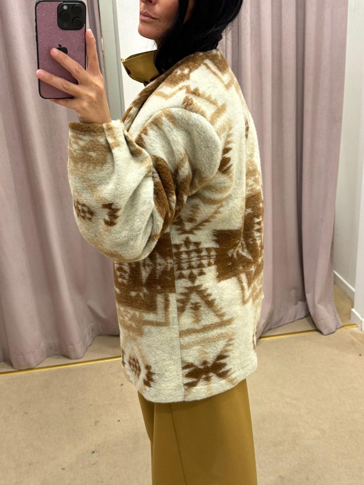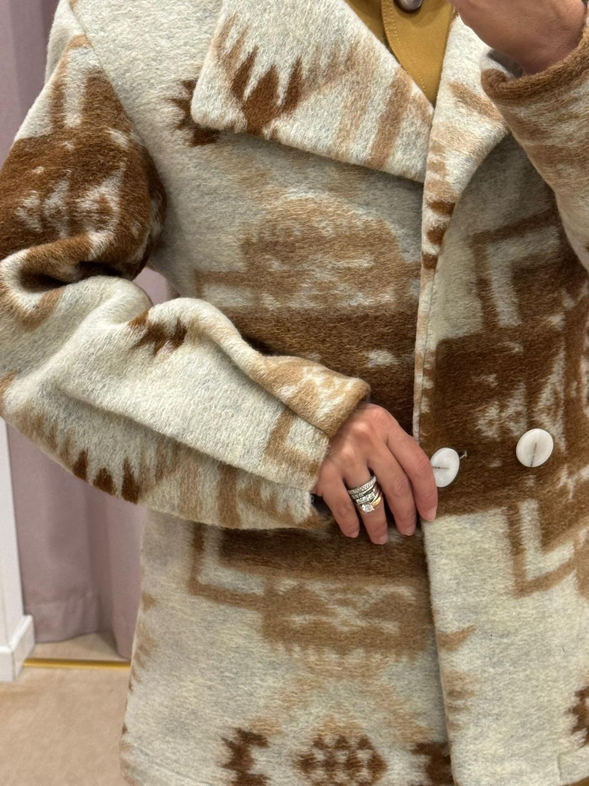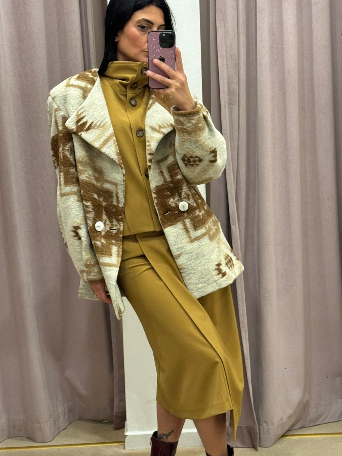 Un capospalla dal design sofisticato e accogliente. Il cappotto in morbido tessuto effetto lana presenta una fantasia geometrica nei toni del beige e del cammello, con maxi revers e bottoni frontali. Perfetto per completare look autunnali con stile e personalità.