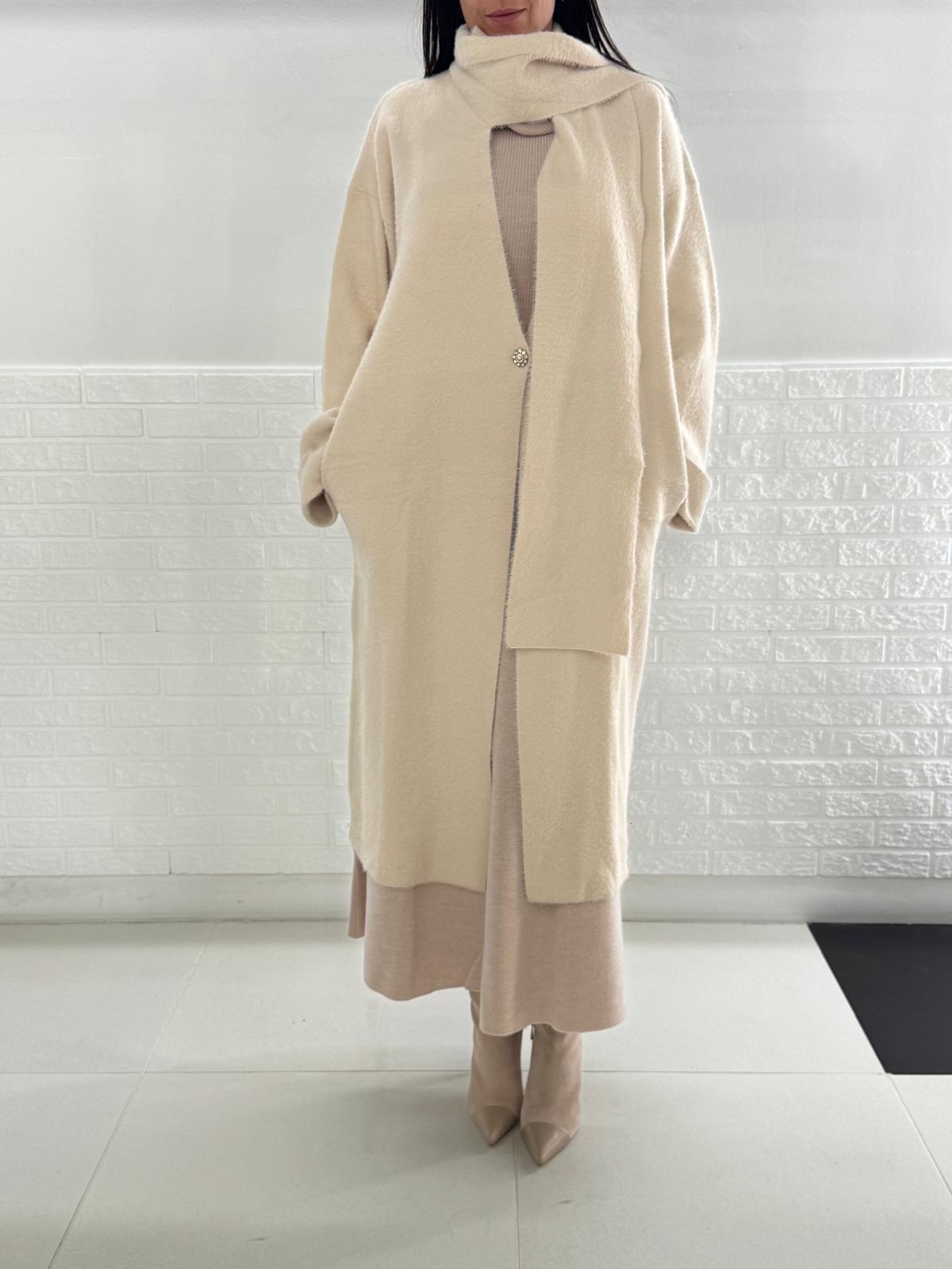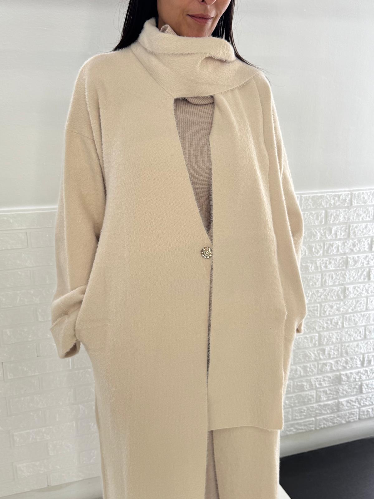 Le maniche ampie con risvolto e i profili in viscosa a contrasto completano un design di grande impatto, perfetto da indossare anche come alternativa al cappotto nelle prime giornate fresche.