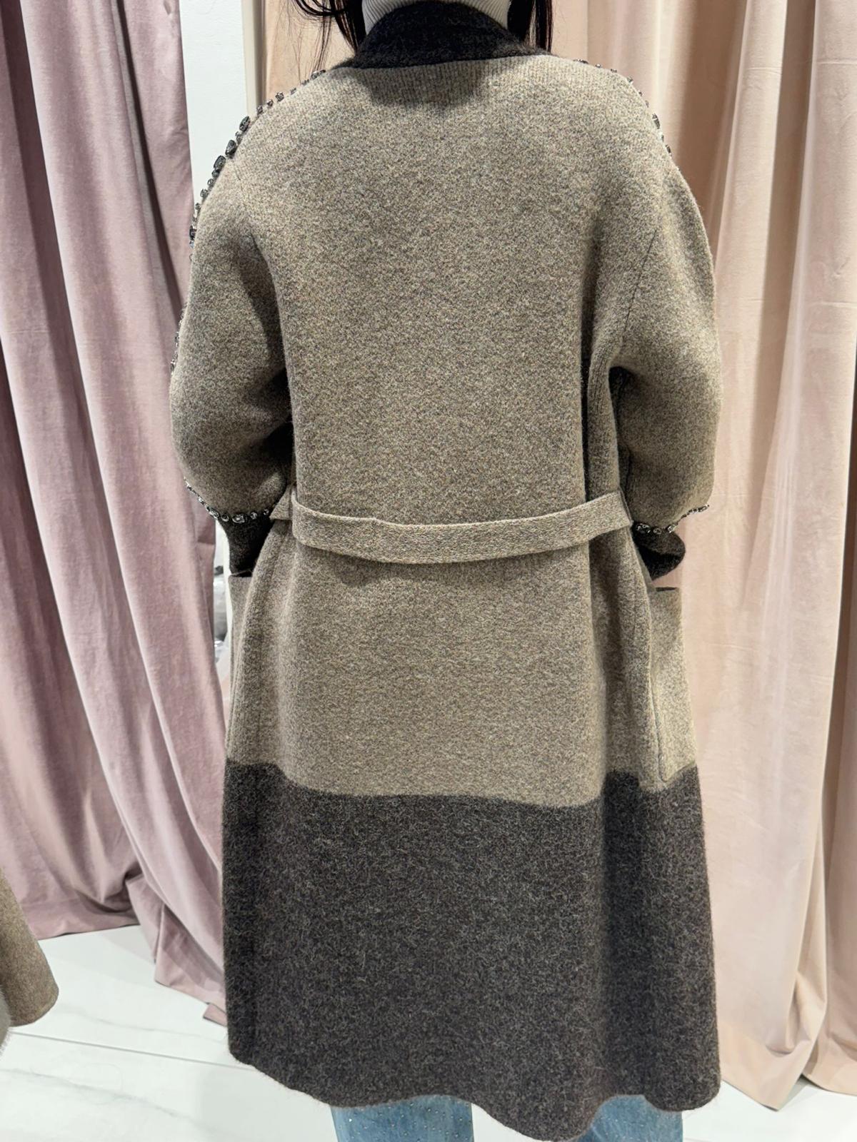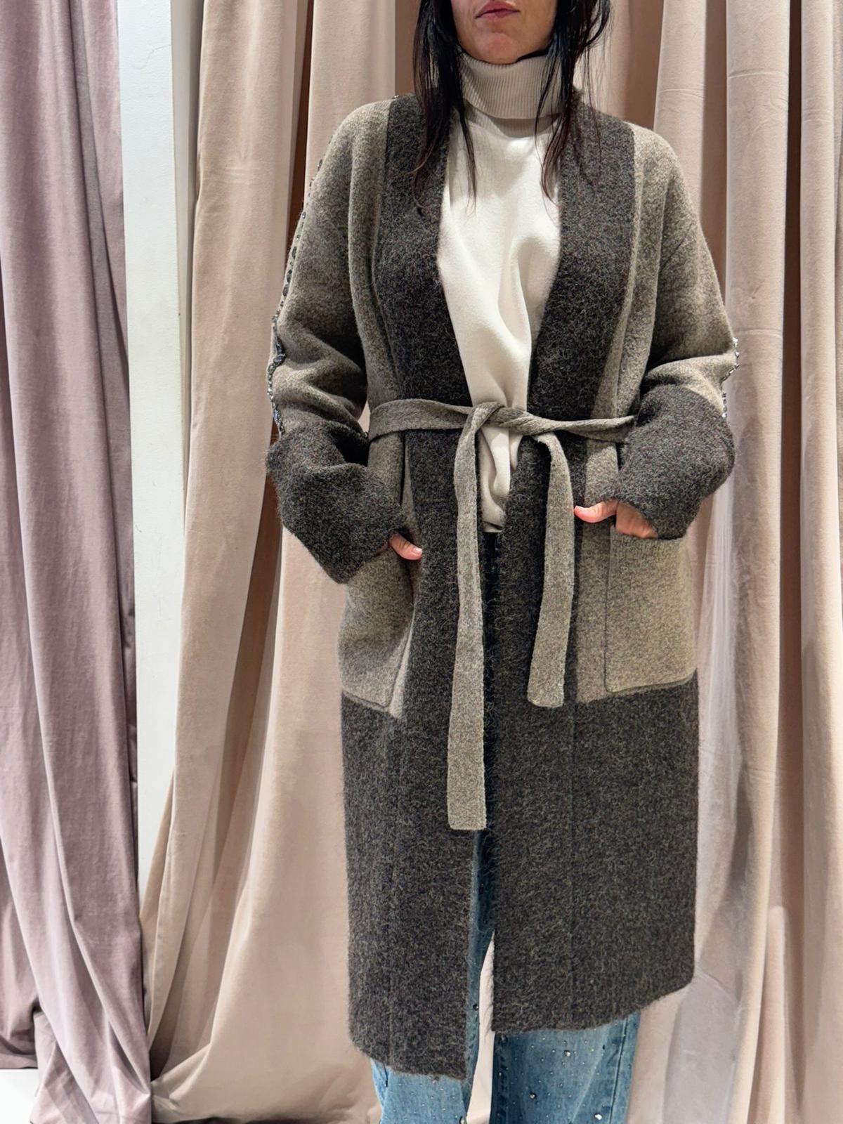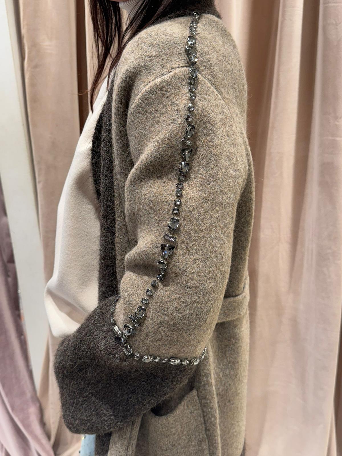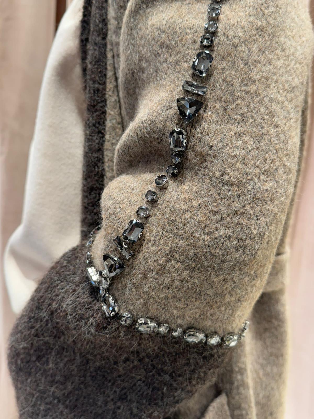 Questo cardigan lungo in maglia mélange gioca con sfumature di grigio e tortora, e si distingue per i dettagli di perline tono su tono applicati lungo le maniche, che donano luminosità e un tocco sofisticato.