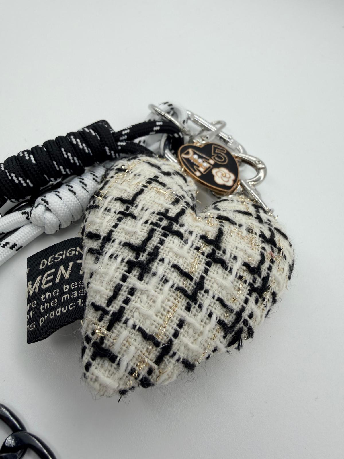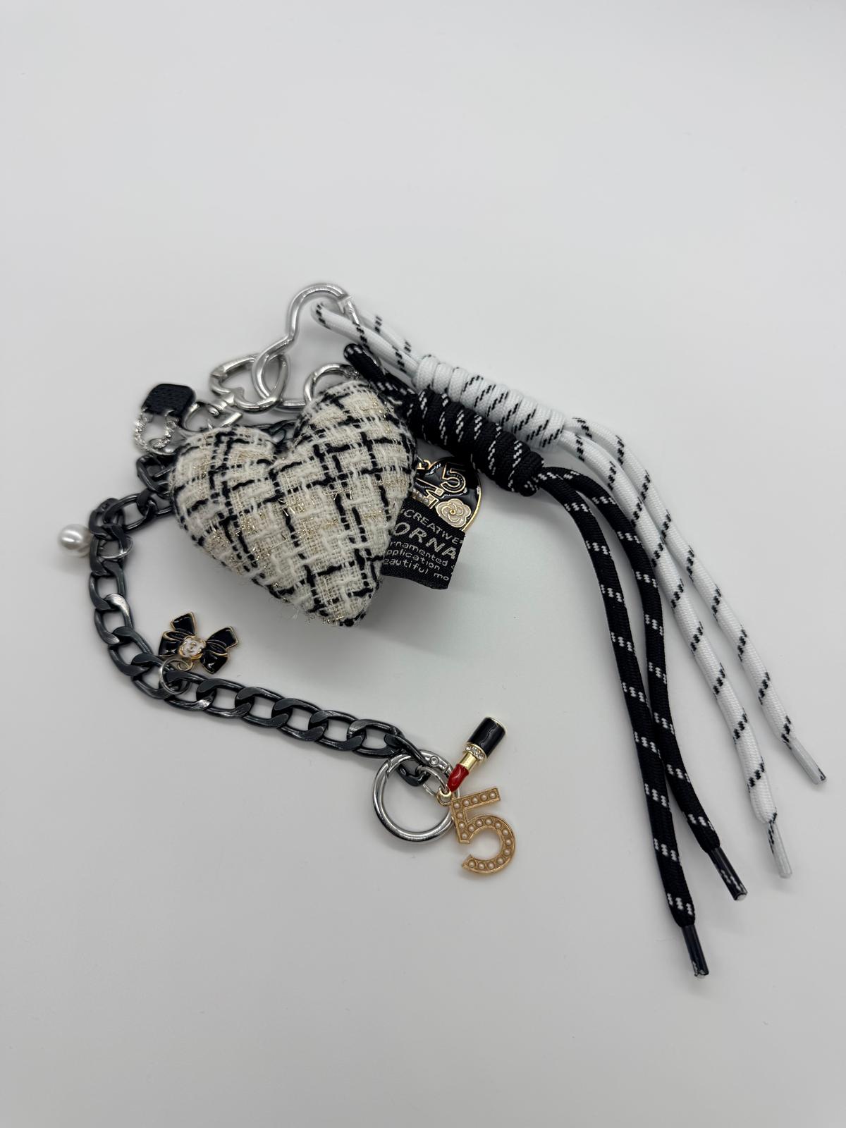 Un charm/portachiavi decorativo per borsa. È composto da vari elementi: un cuore imbottito in tessuto con fili colorati intrecciati, catene nere e argento, cordini bianchi e neri intrecciati, oltre a ciondoli metallici dorati a forma di cuore, fiocco e altri dettagli. Lo stile è moderno e ricercato, con un mix di materiali e texture.