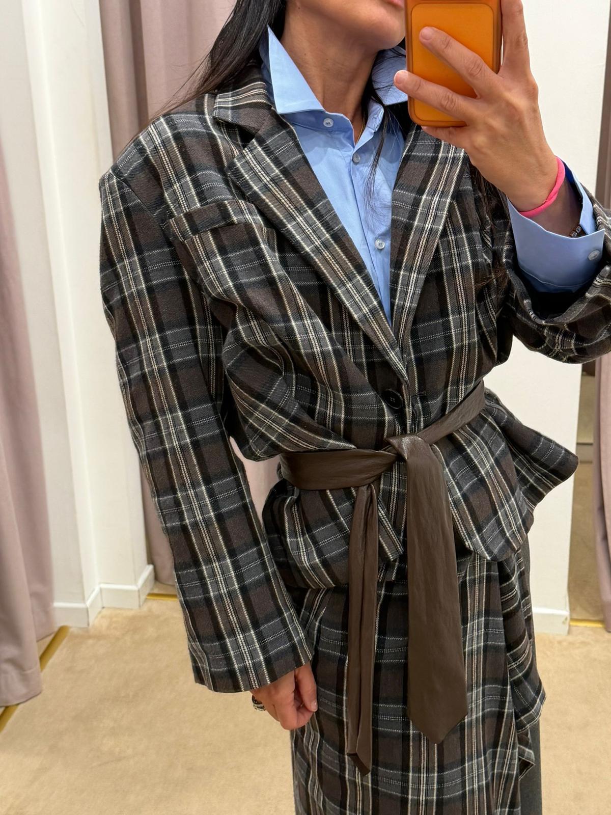 Giacca sartoriale a quadri nei toni del marrone, grigio e blu, realizzata in tessuto misto con mano morbida e struttura leggera. Linea leggermente over, spalle definite e revers classico. La chiusura è sostituita da una cintura effetto cravatta in tessuto liscio, che valorizza il punto vita e aggiunge un tocco contemporaneo e creativo al look.
