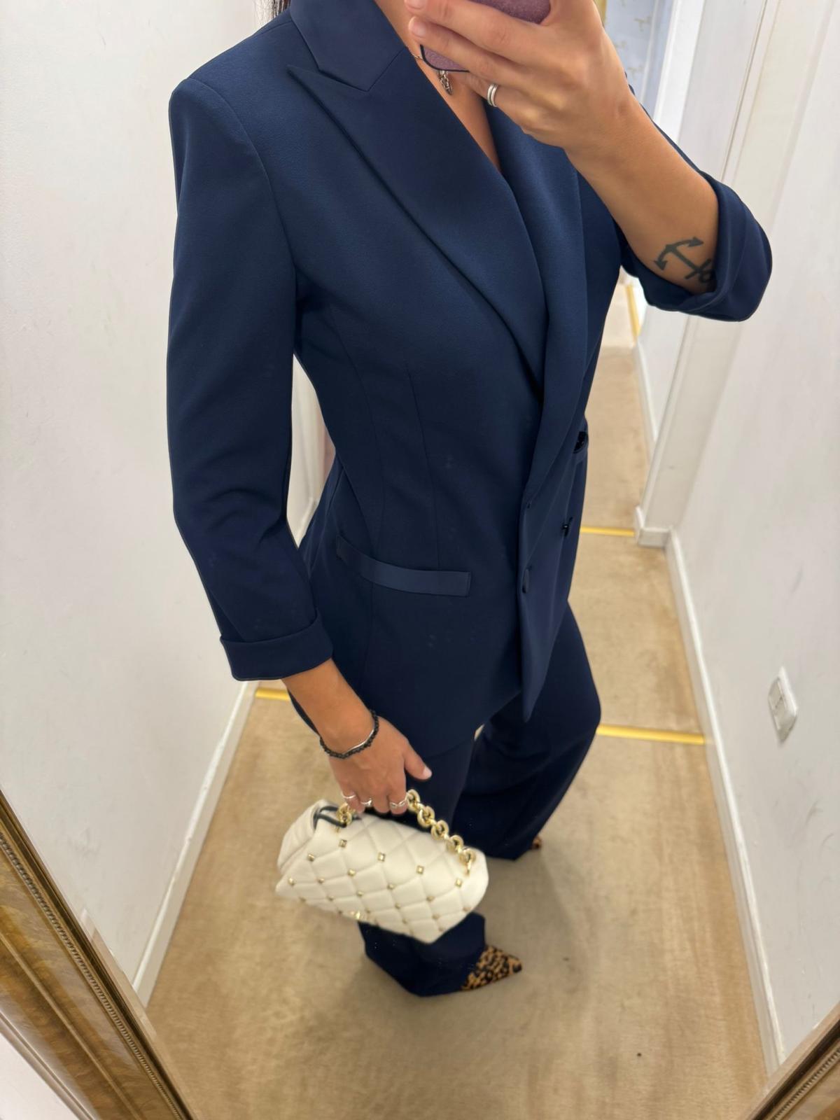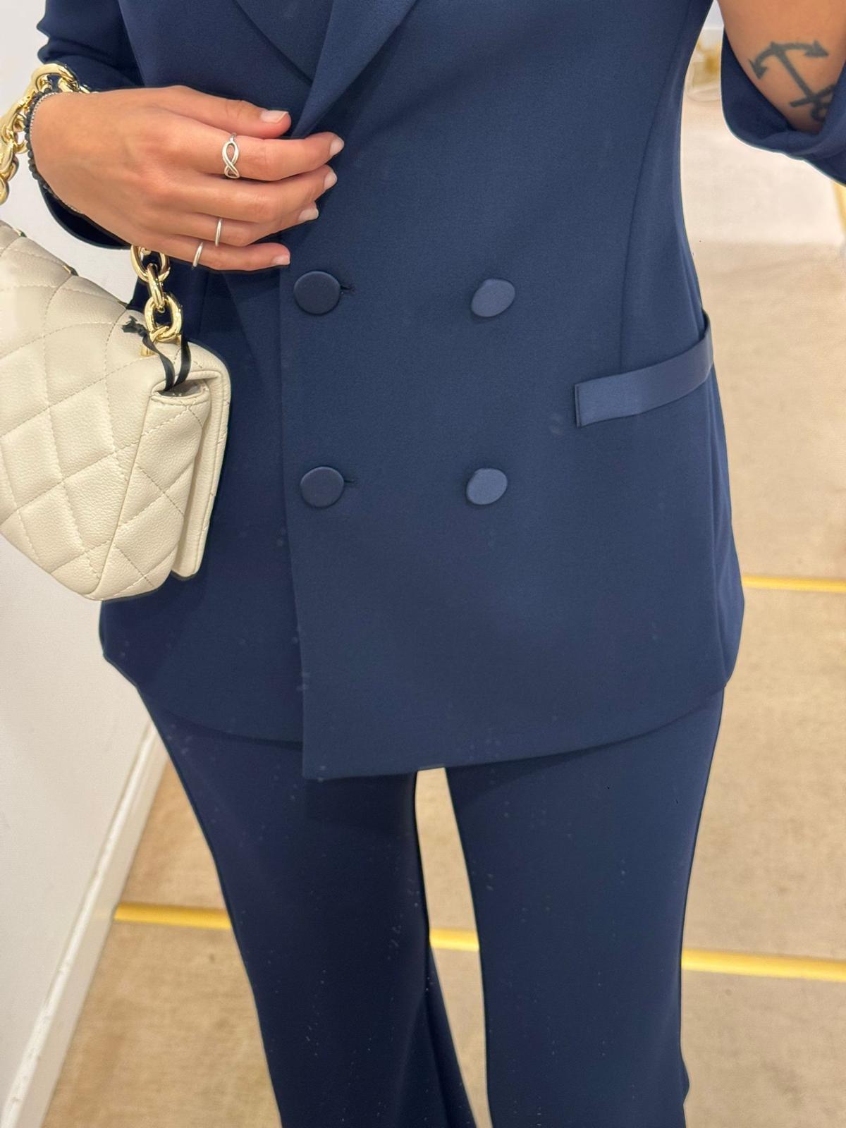• Stile: doppiopetto, con quattro bottoni visibili (due per lato) e chiusura asimmetrica.