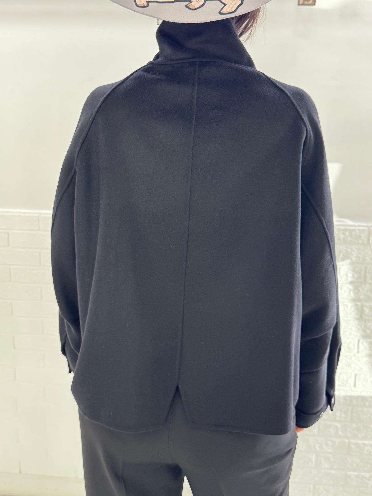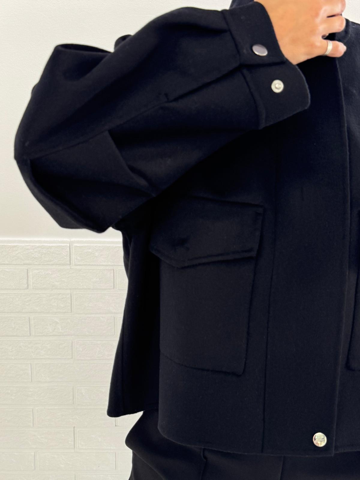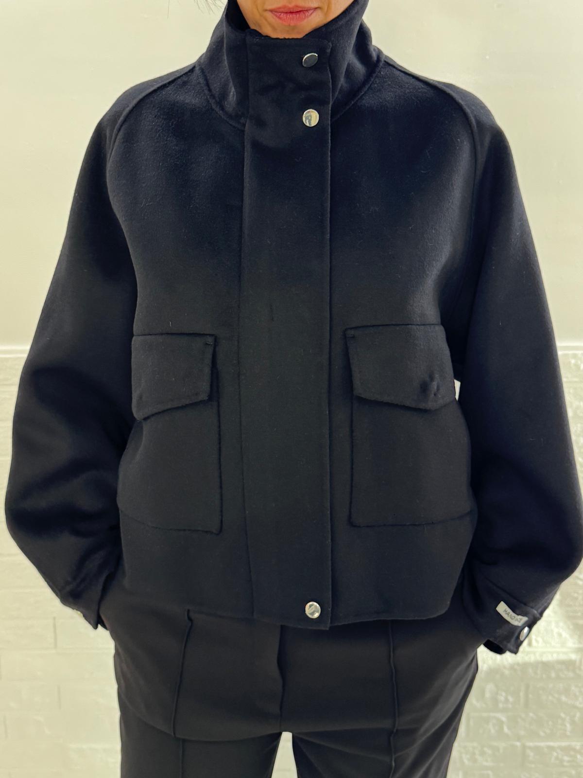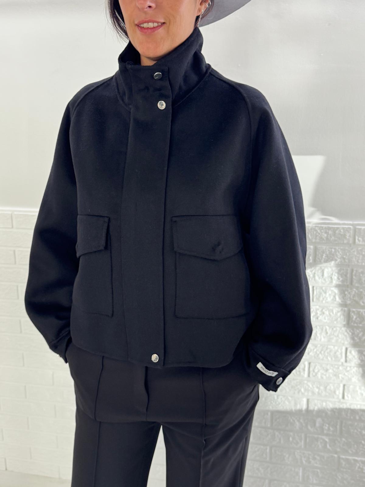 Un modello minimal e contemporaneo, con collo alto e chiusura a bottoni automatici. Il tessuto strutturato e le grandi tasche applicate le conferiscono un'aria moderna e pulita, adatta a look metropolitani o business casual.