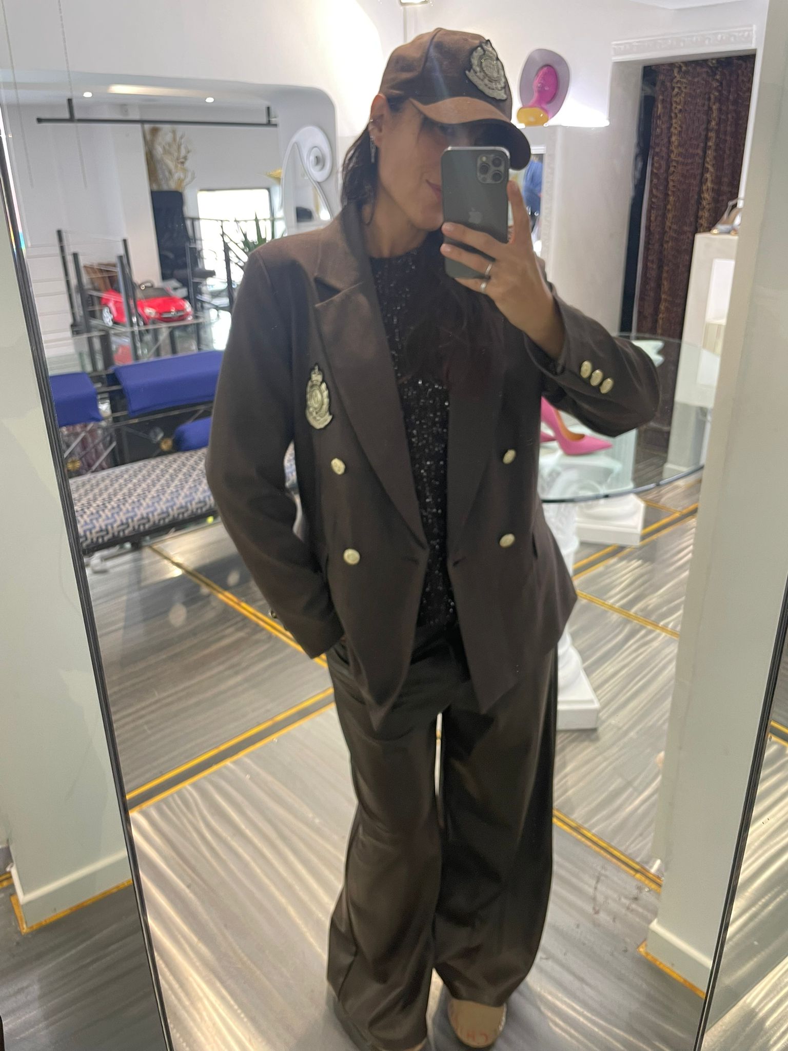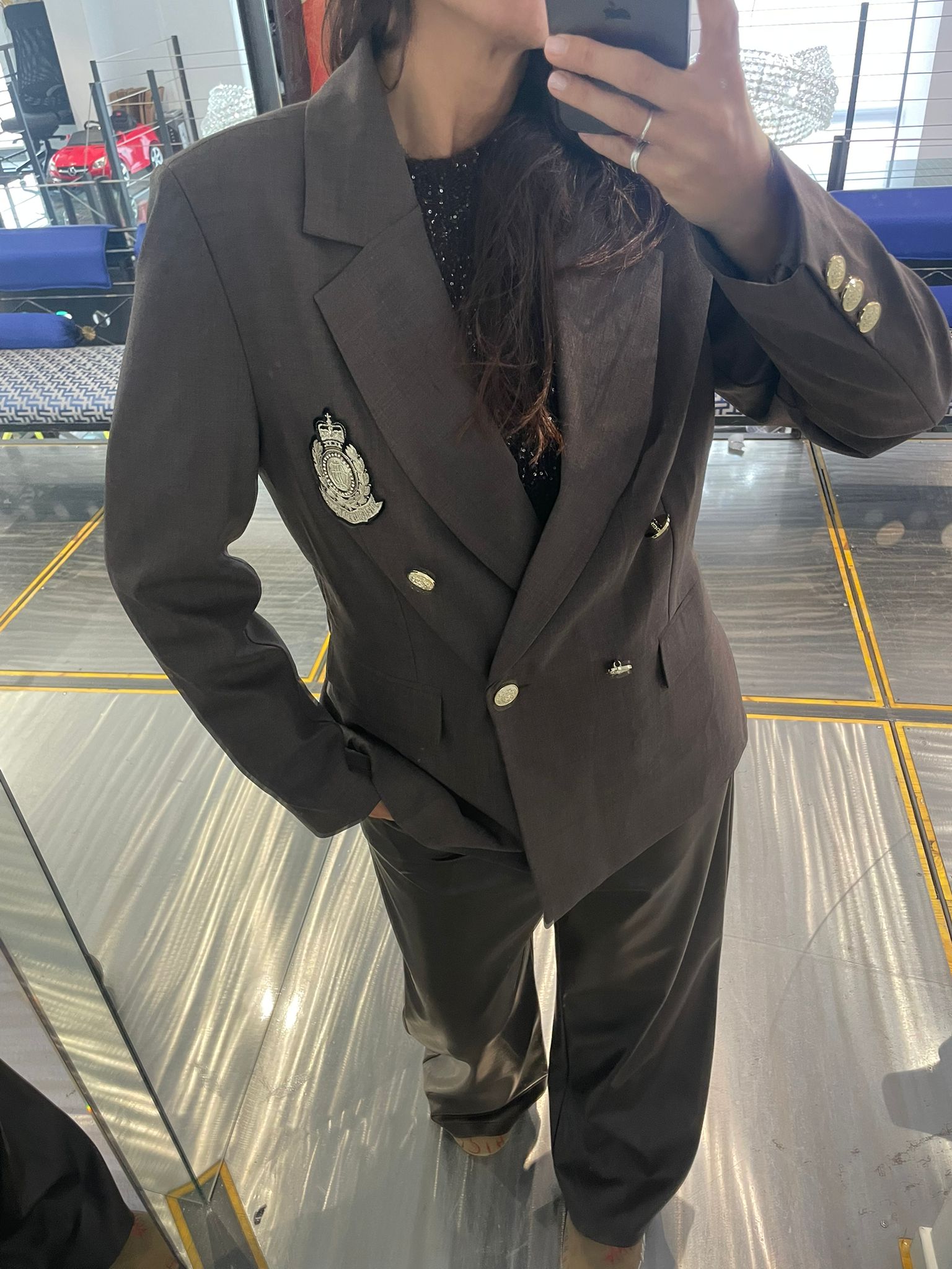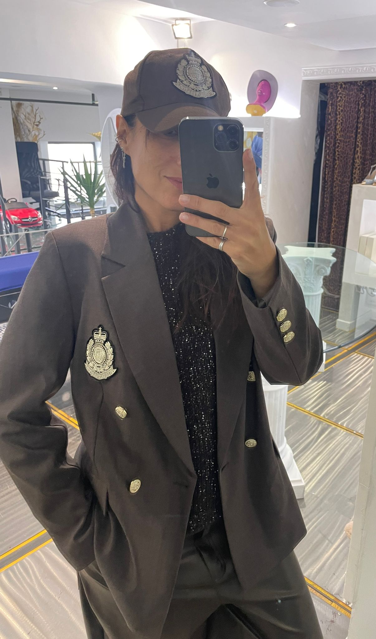 • Dettaglio distintivo: uno stemma ricamato sul petto lato sinistro, che richiama lo stile collegiale/militare.