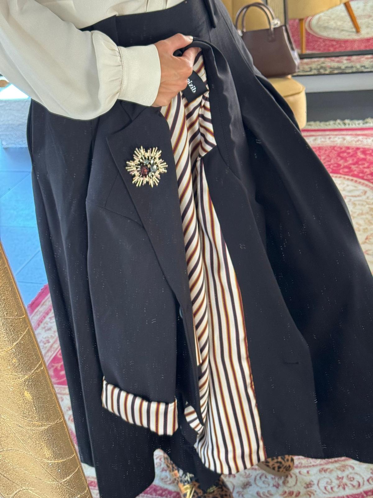 • Maniche lunghe con interno a righe marrone/beige, visibile grazie al risvolto del polsino.