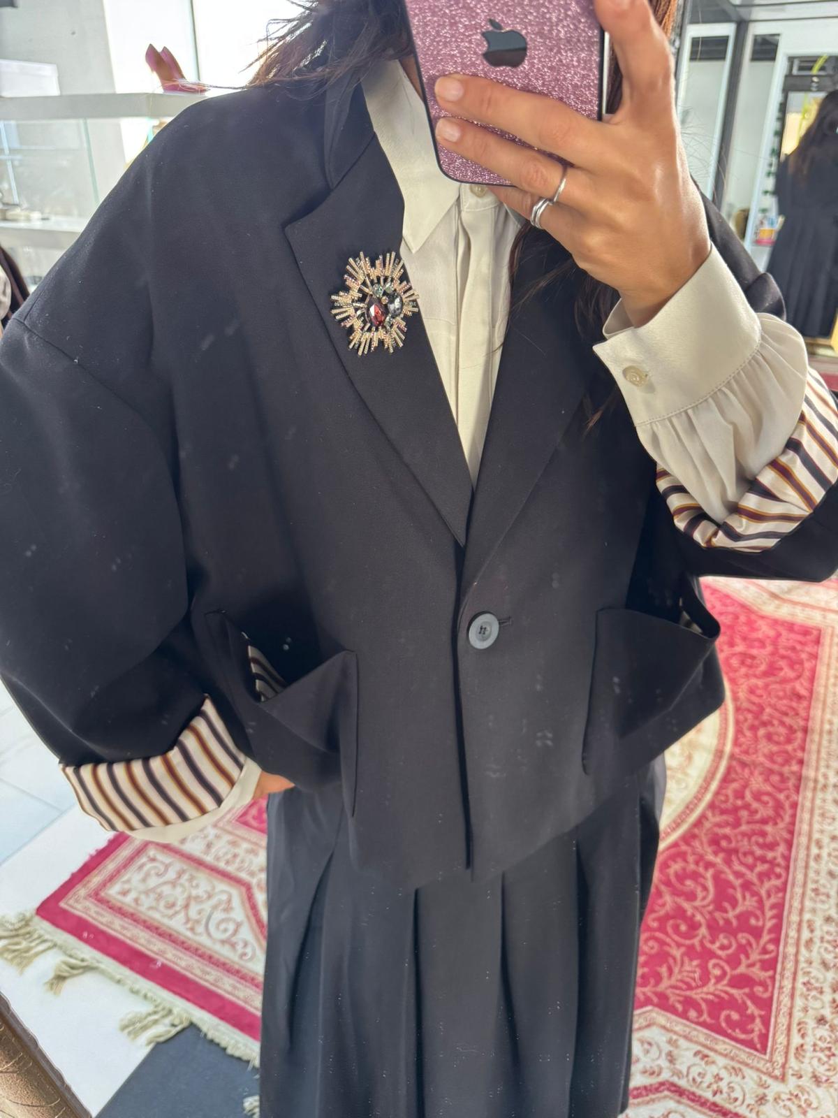 • Accessoriata con una spilla gioiello a forma di fiore o stella, che aggiunge un tocco luminoso ed elegante.