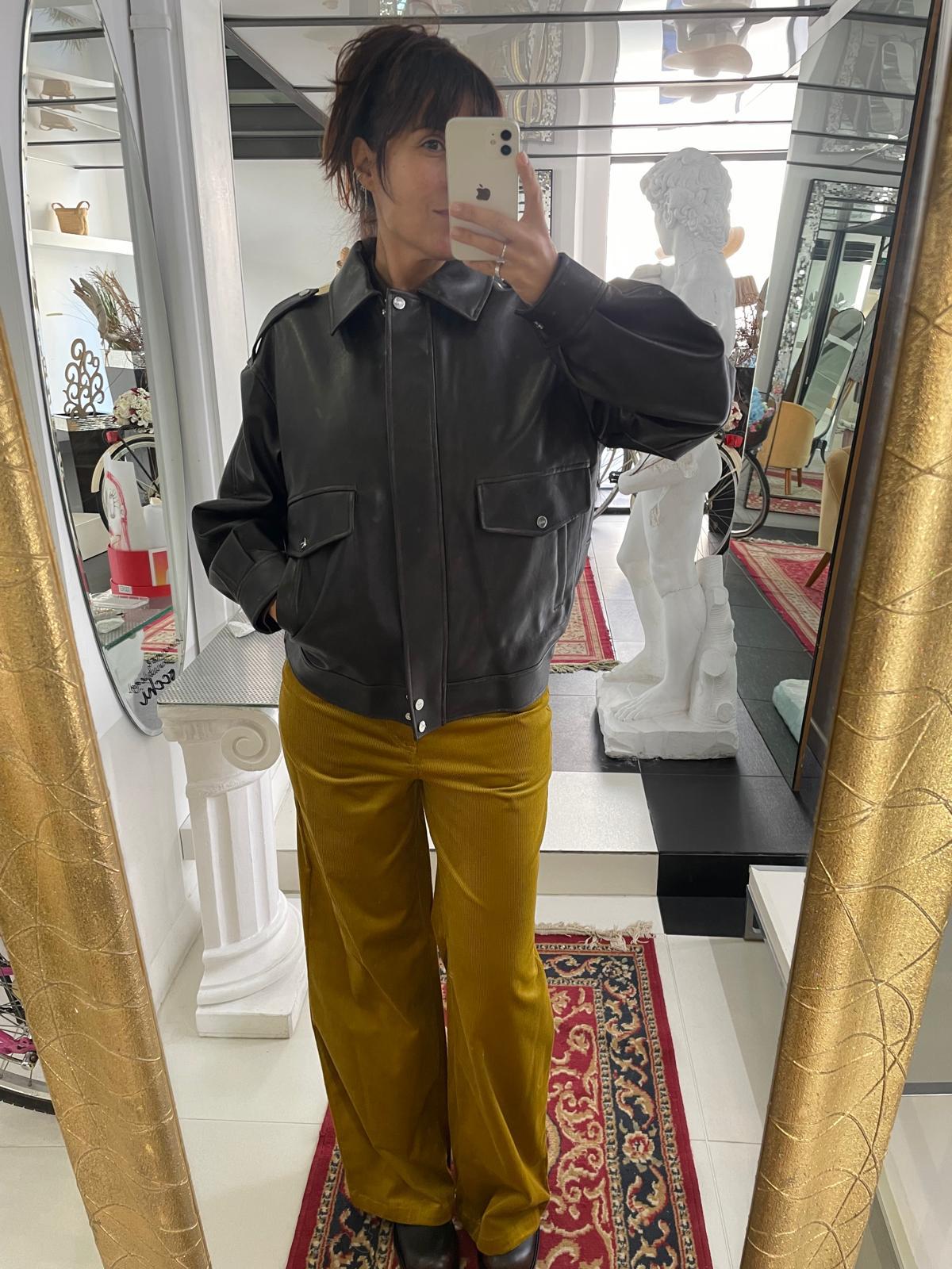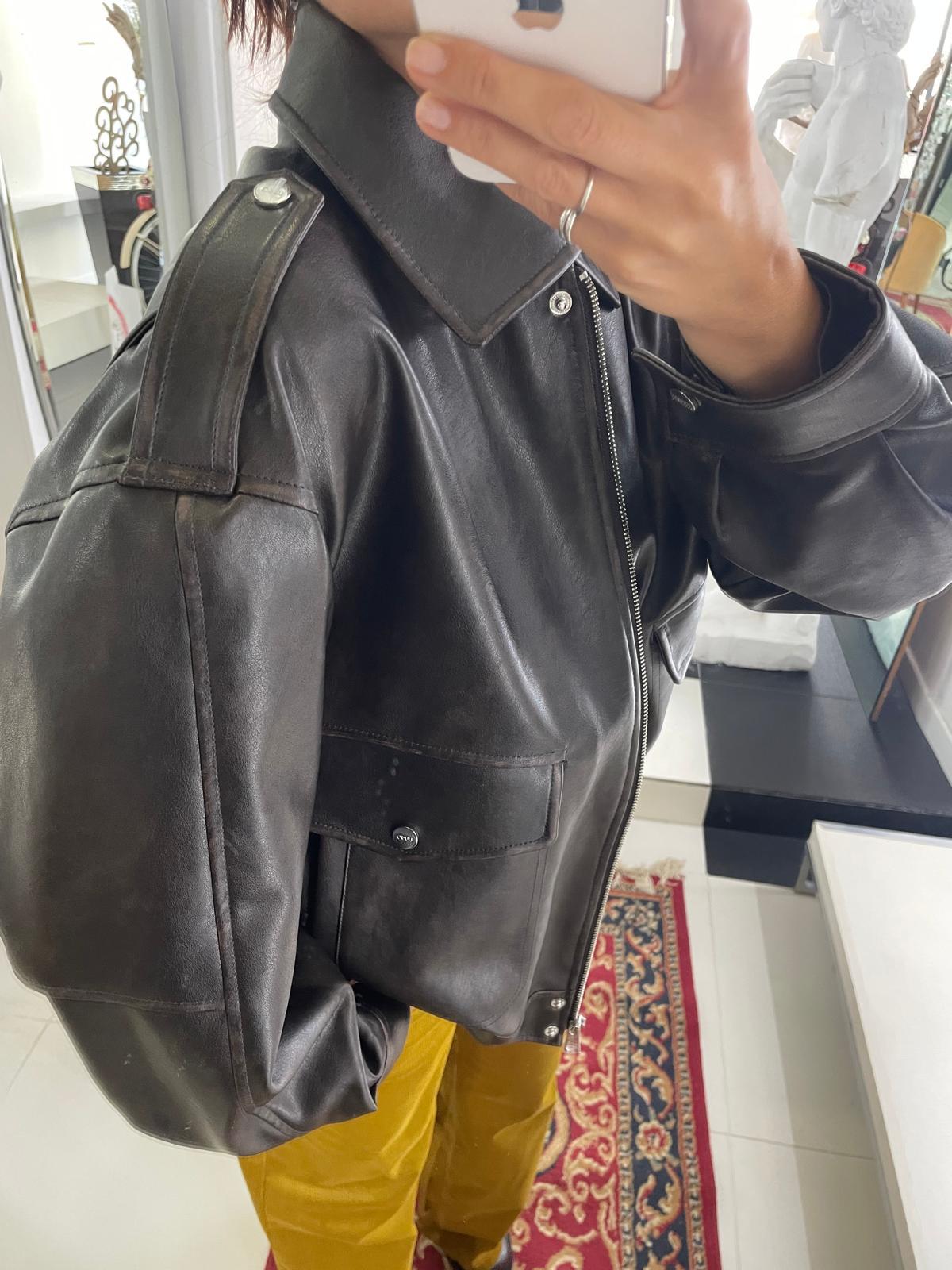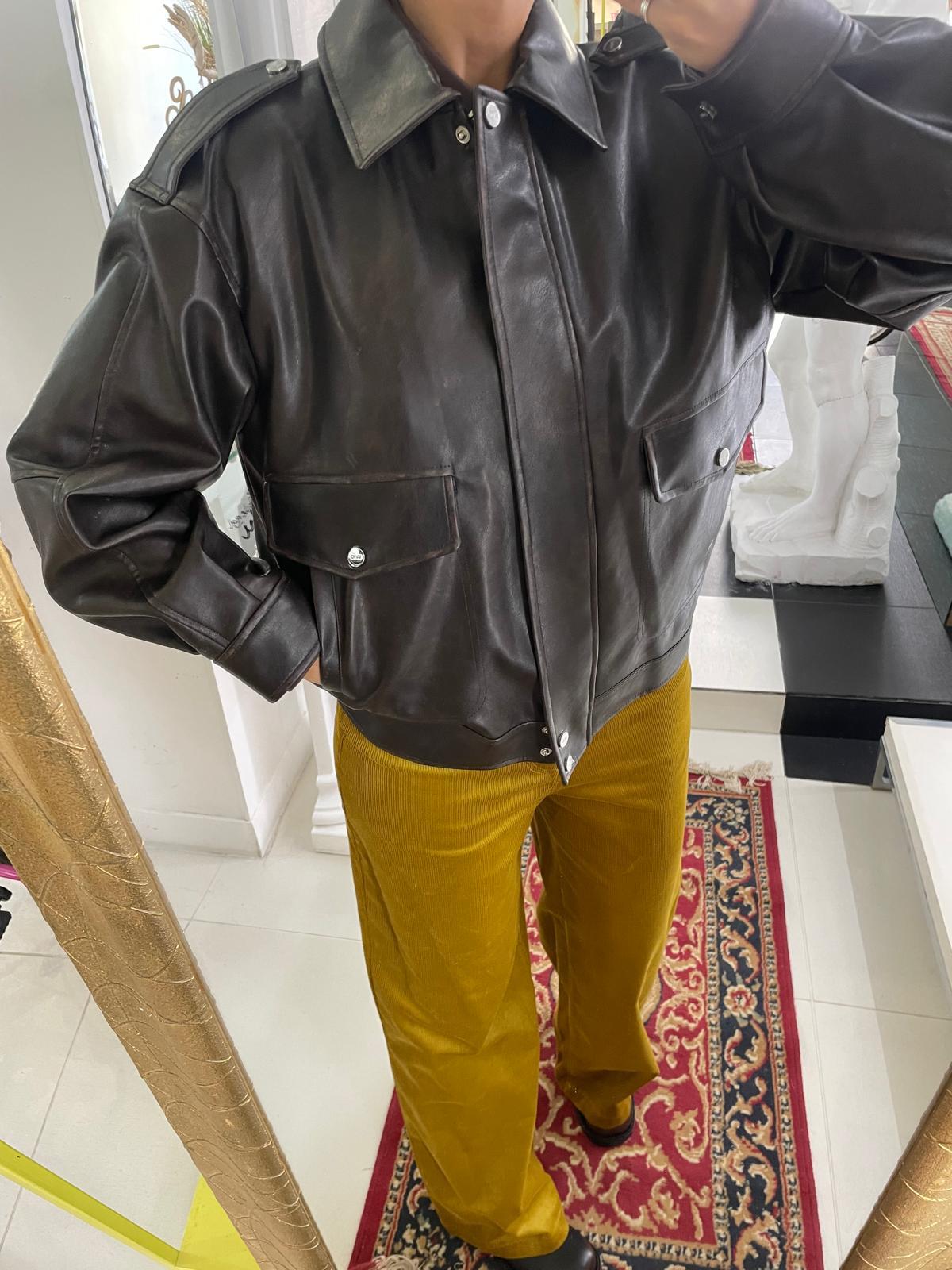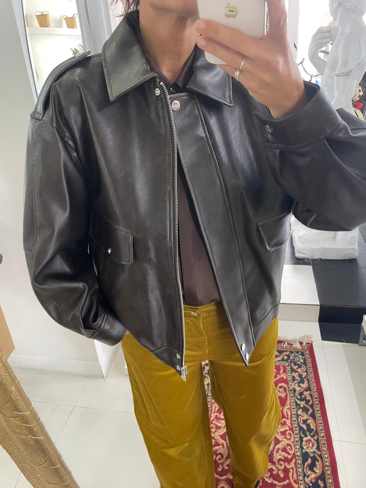 Giubbino cioccolato chiaro, ha un colletto classico, alamari sulle spalle, tasche con patta e chiusura con zip e bottoni nascosti.