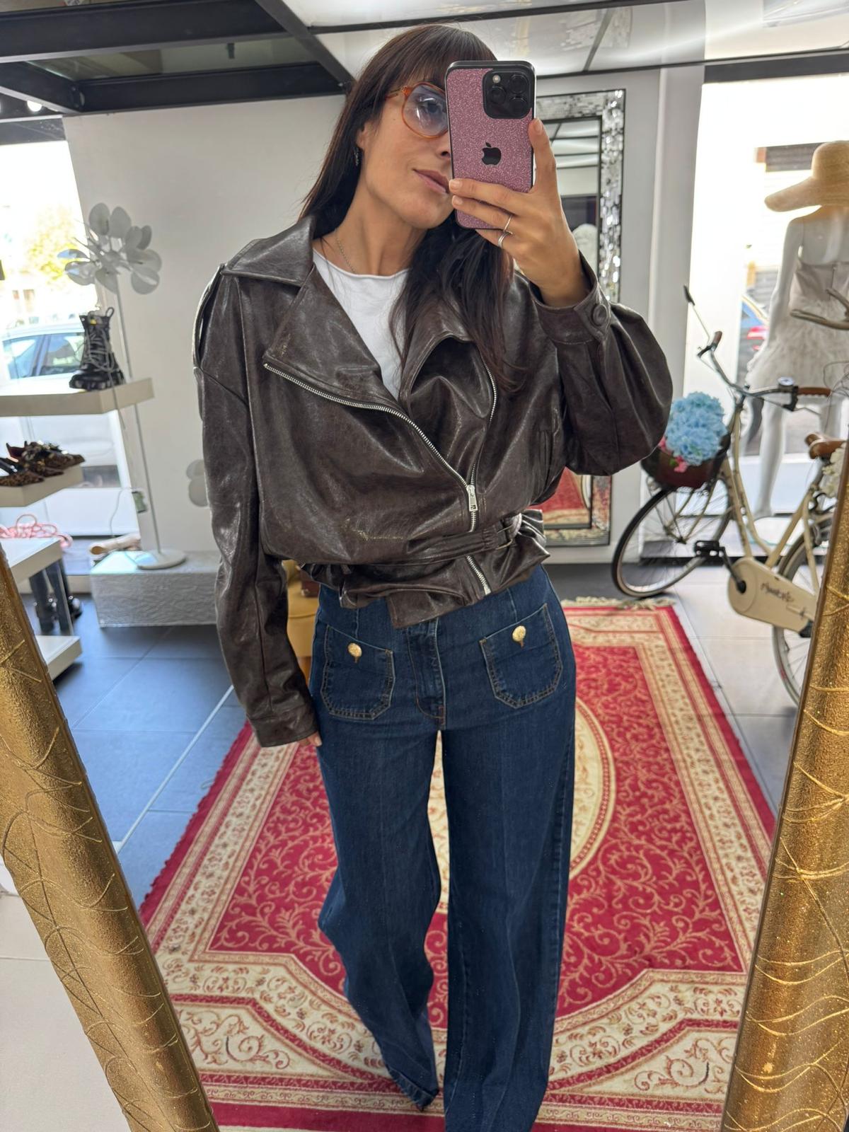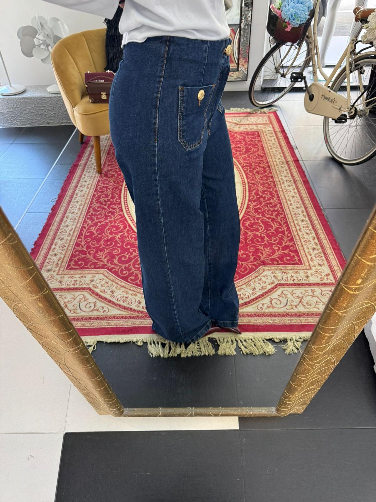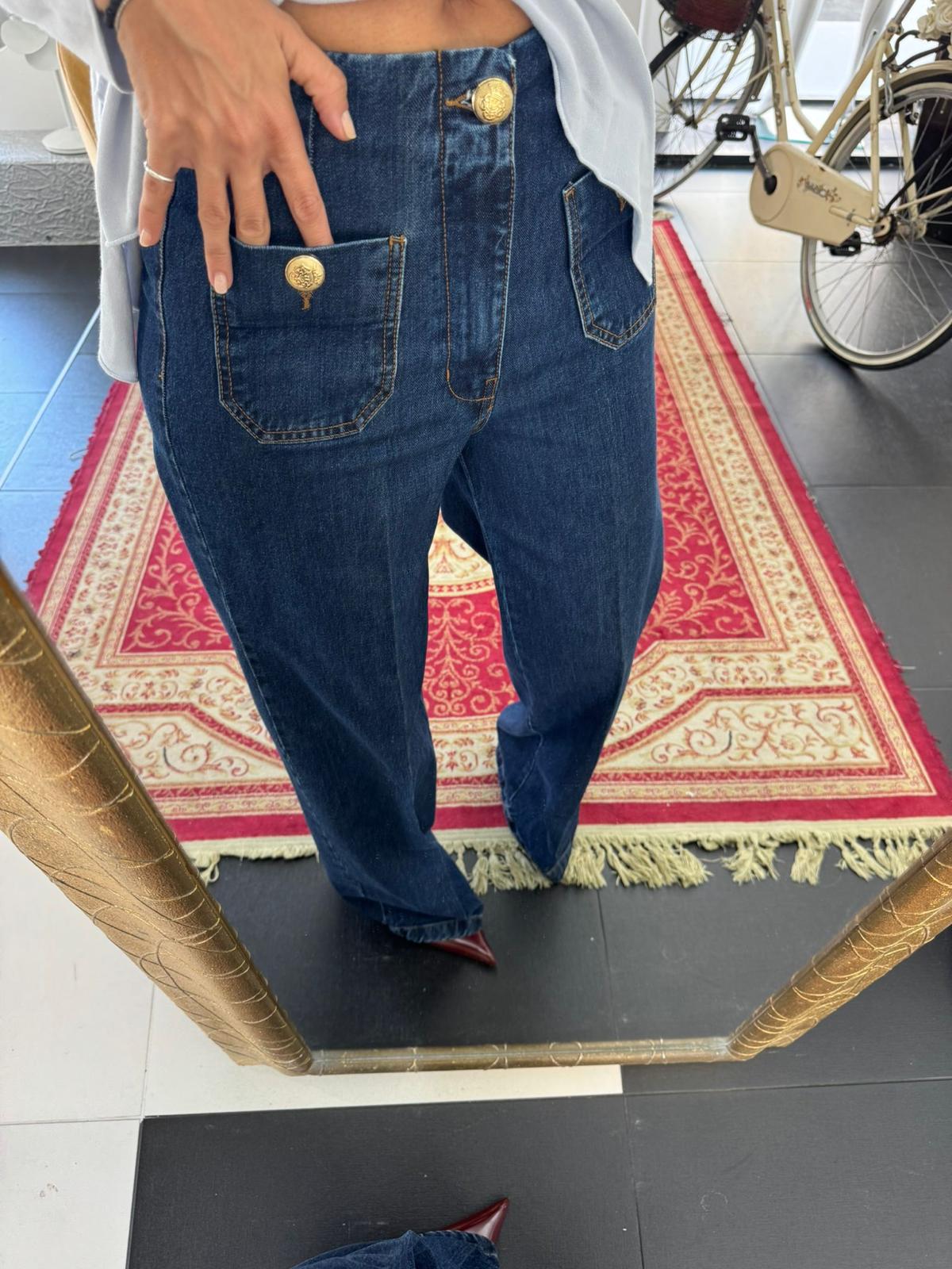 • Dettagli: due grandi tasche frontali con bottoni dorati decorativi e piega centrale cucita.