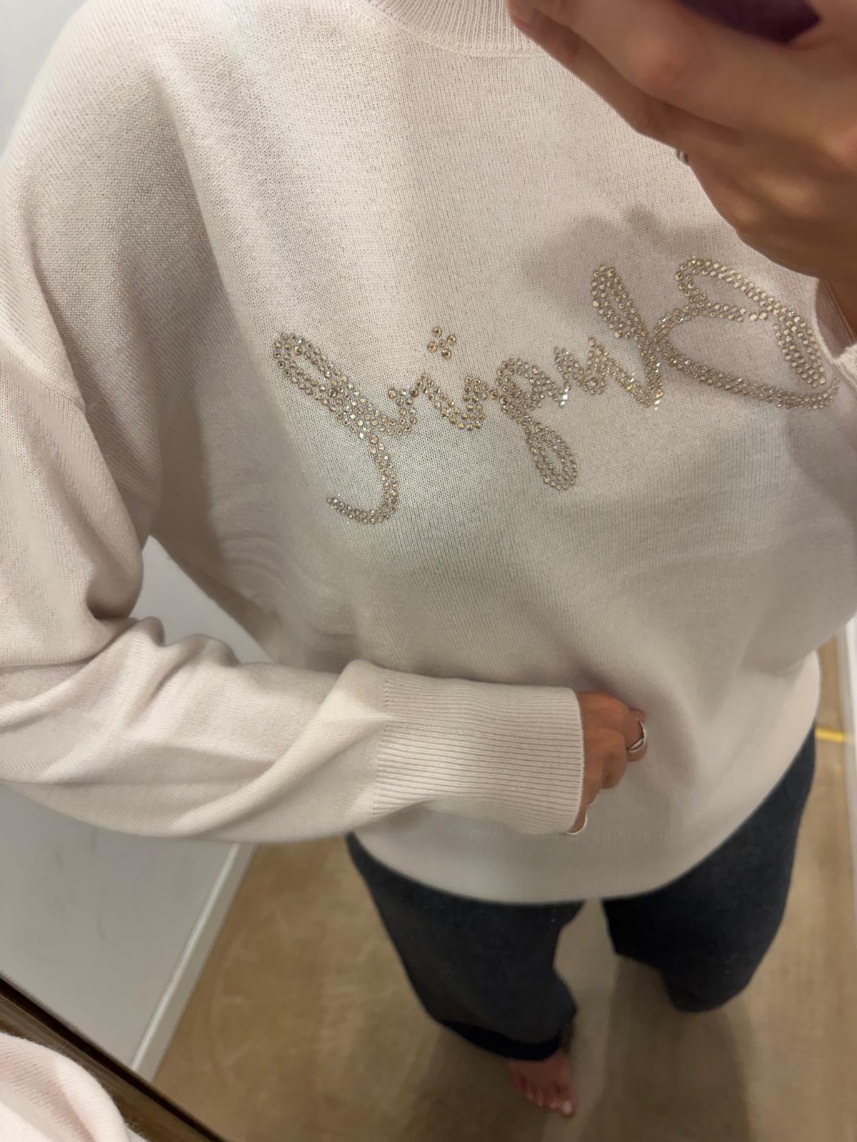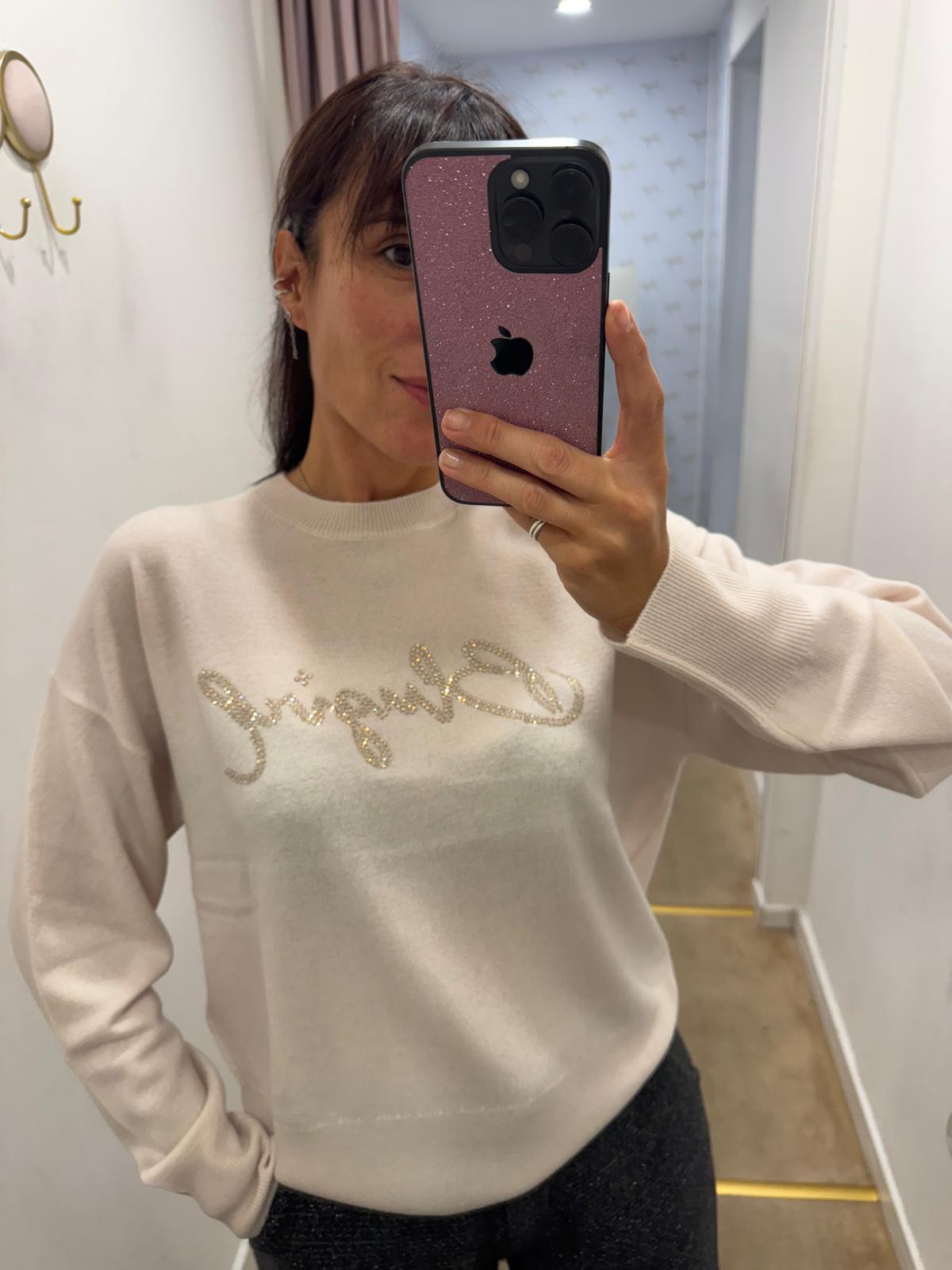 Il logo lettering impreziosito da cristalli termoadesivi aggiunge una nota luminosa e distintiva.