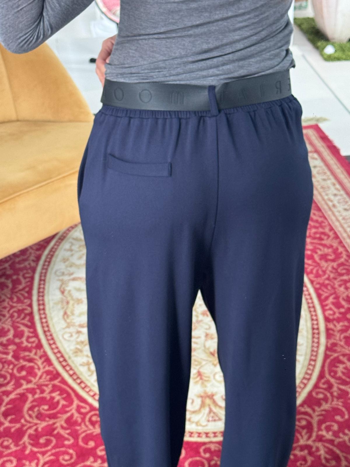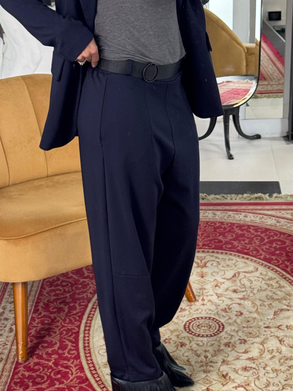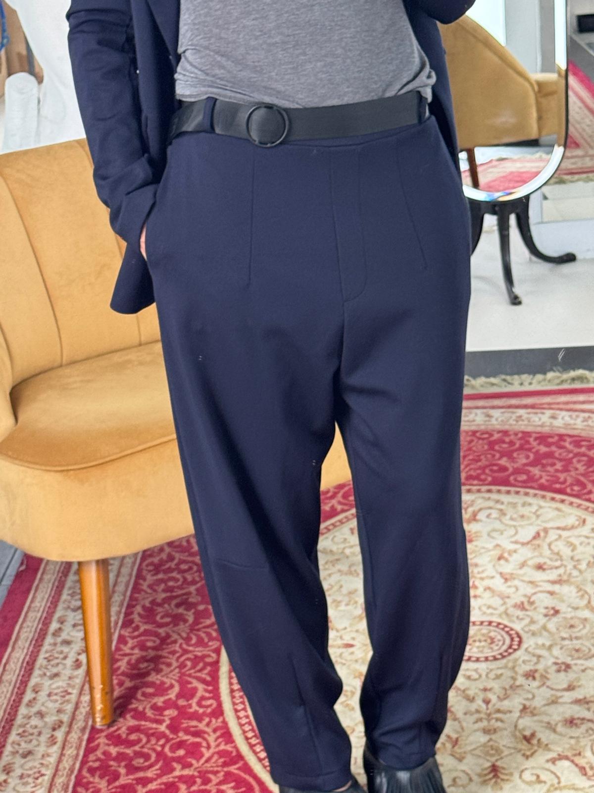 Pantalone dal taglio carrot, caratterizzato da una linea morbida sui fianchi che si restringe leggermente verso il fondo. Realizzato in tessuto blu notte con piega centrale che slancia la figura e dona un tocco raffinato. Il modello presenta vita alta, tasche laterali e passanti per cintura, ideale per look eleganti o casual chic.