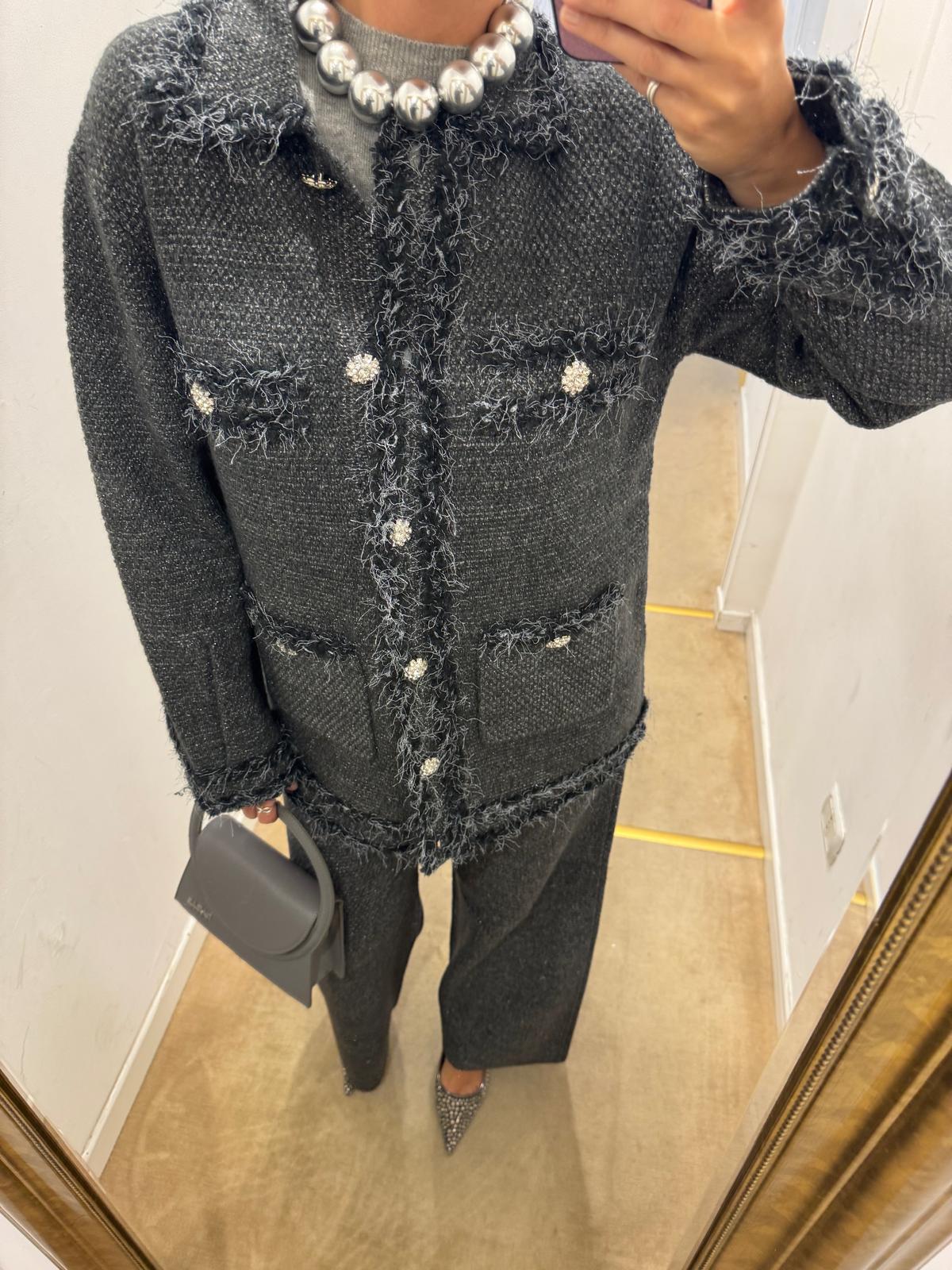 Completano il design le quattro tasche applicate e le maniche lunghe con spacco e bottone gioiello, per un’eleganza disinvolta ma curata nei dettagli.