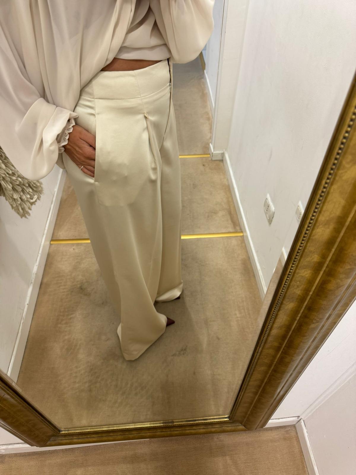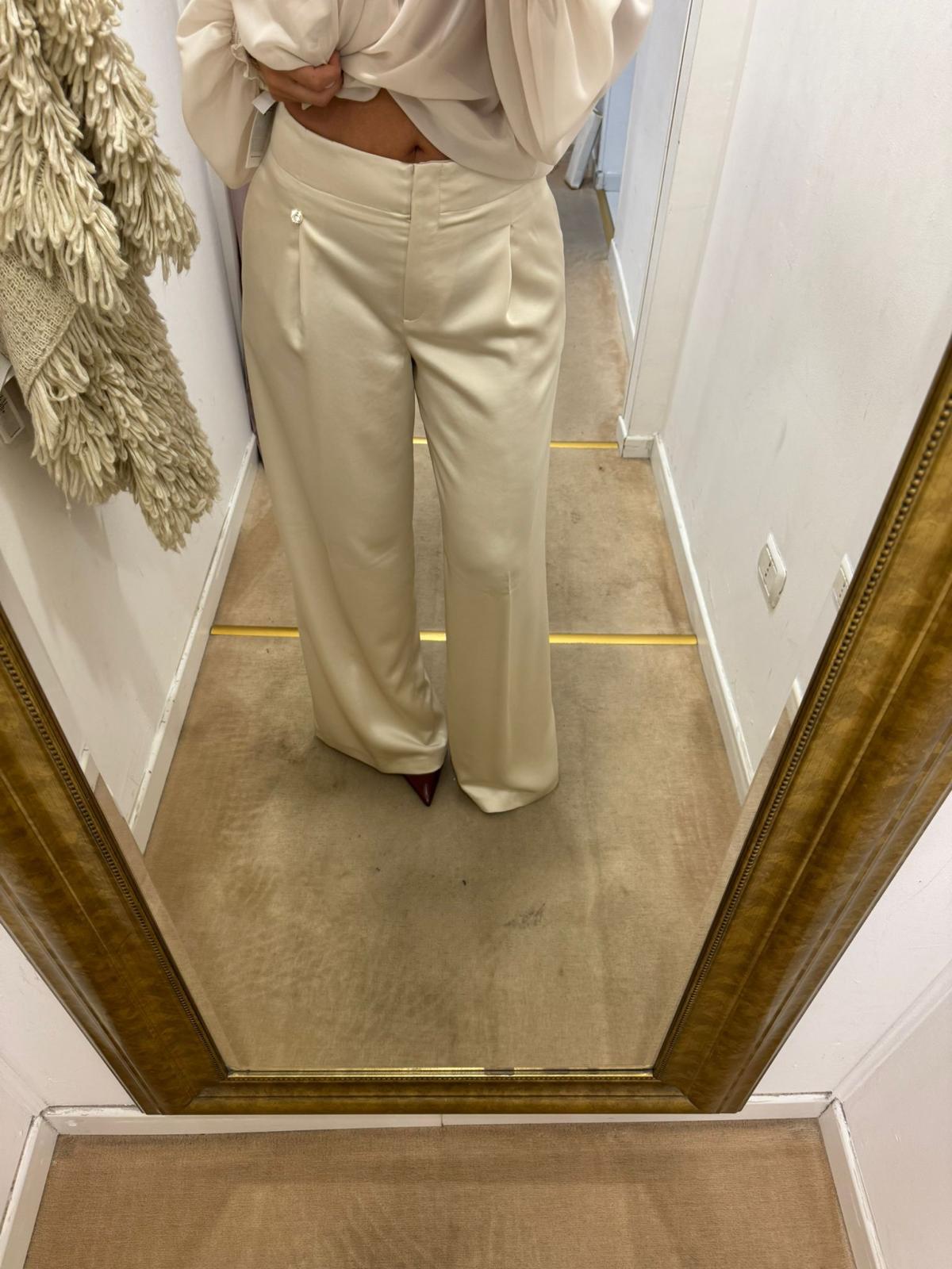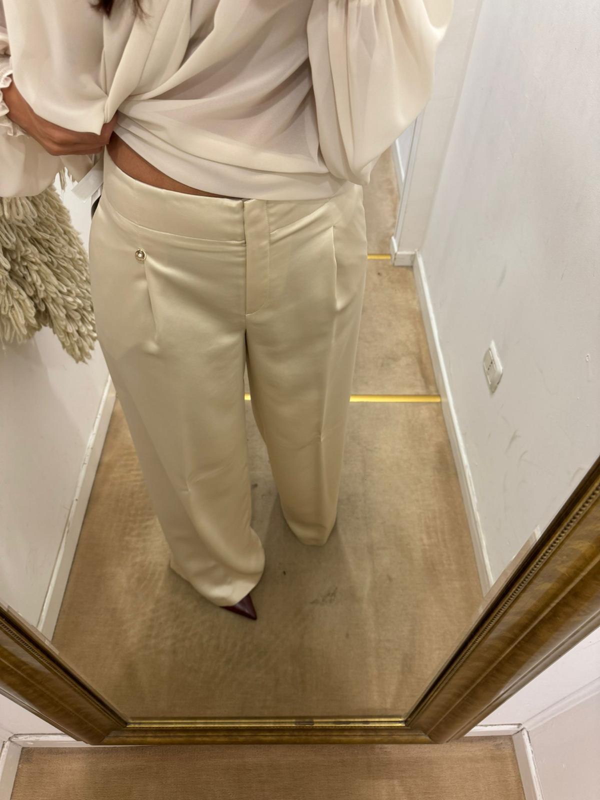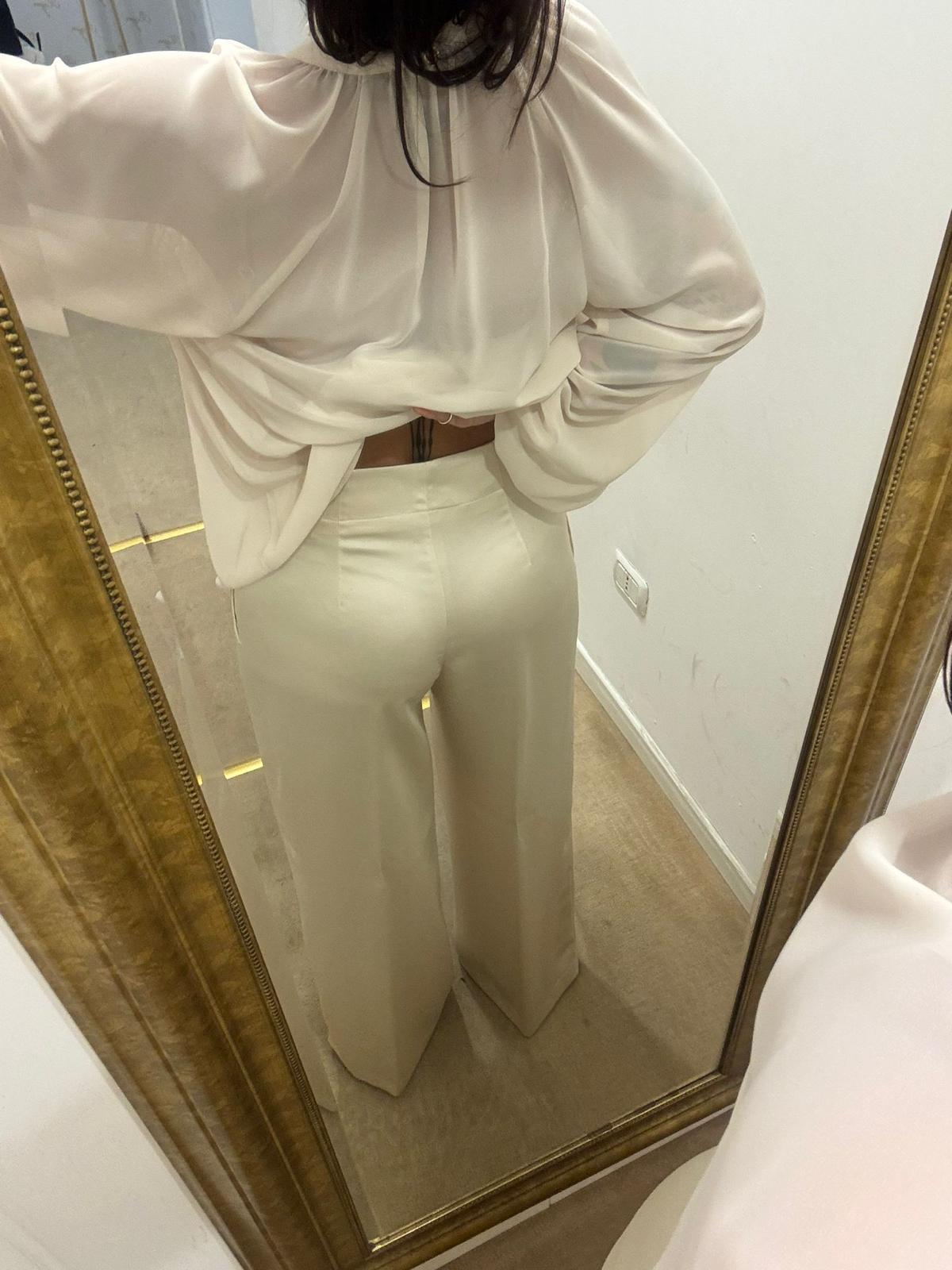 Sul davanti presenta delle piccole pince che aggiungono volume e struttura, e una chiusura piatta con bottone e zip nascosti. È rifinito con un bottone decorativo visibile su un lato, che aggiunge un tocco raffinato.