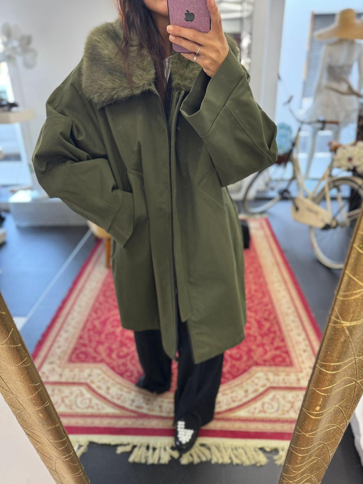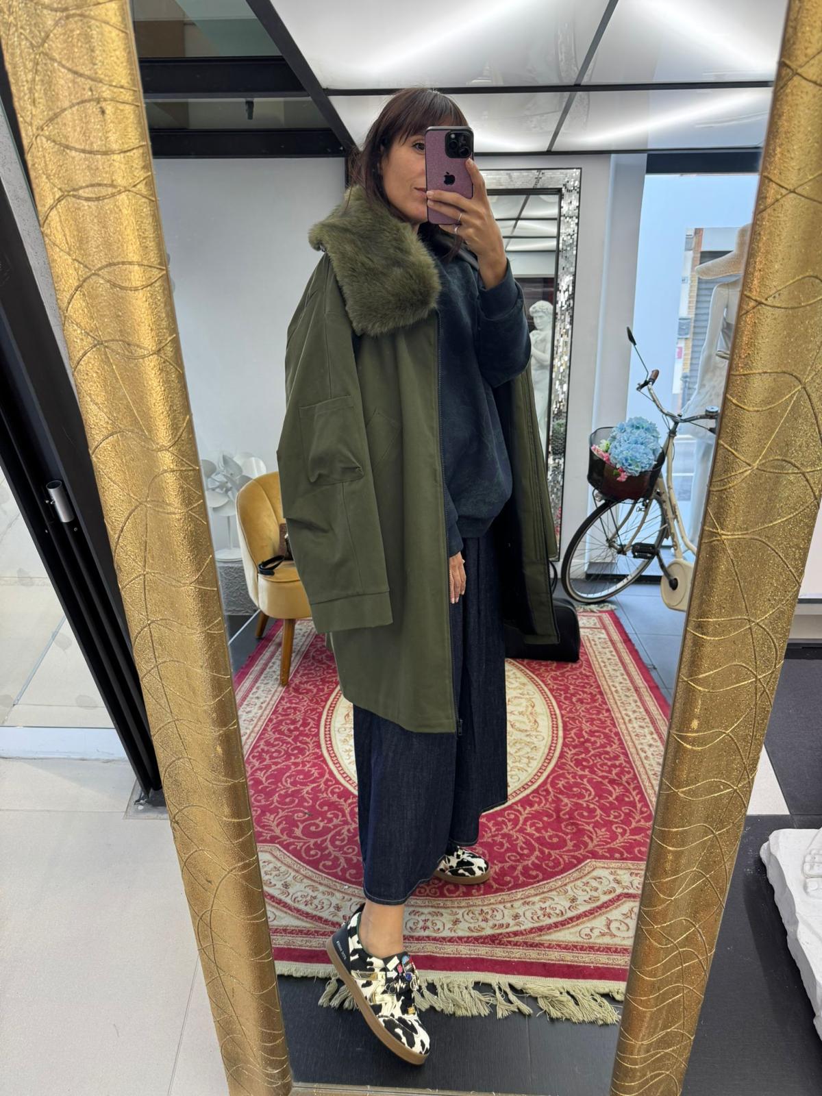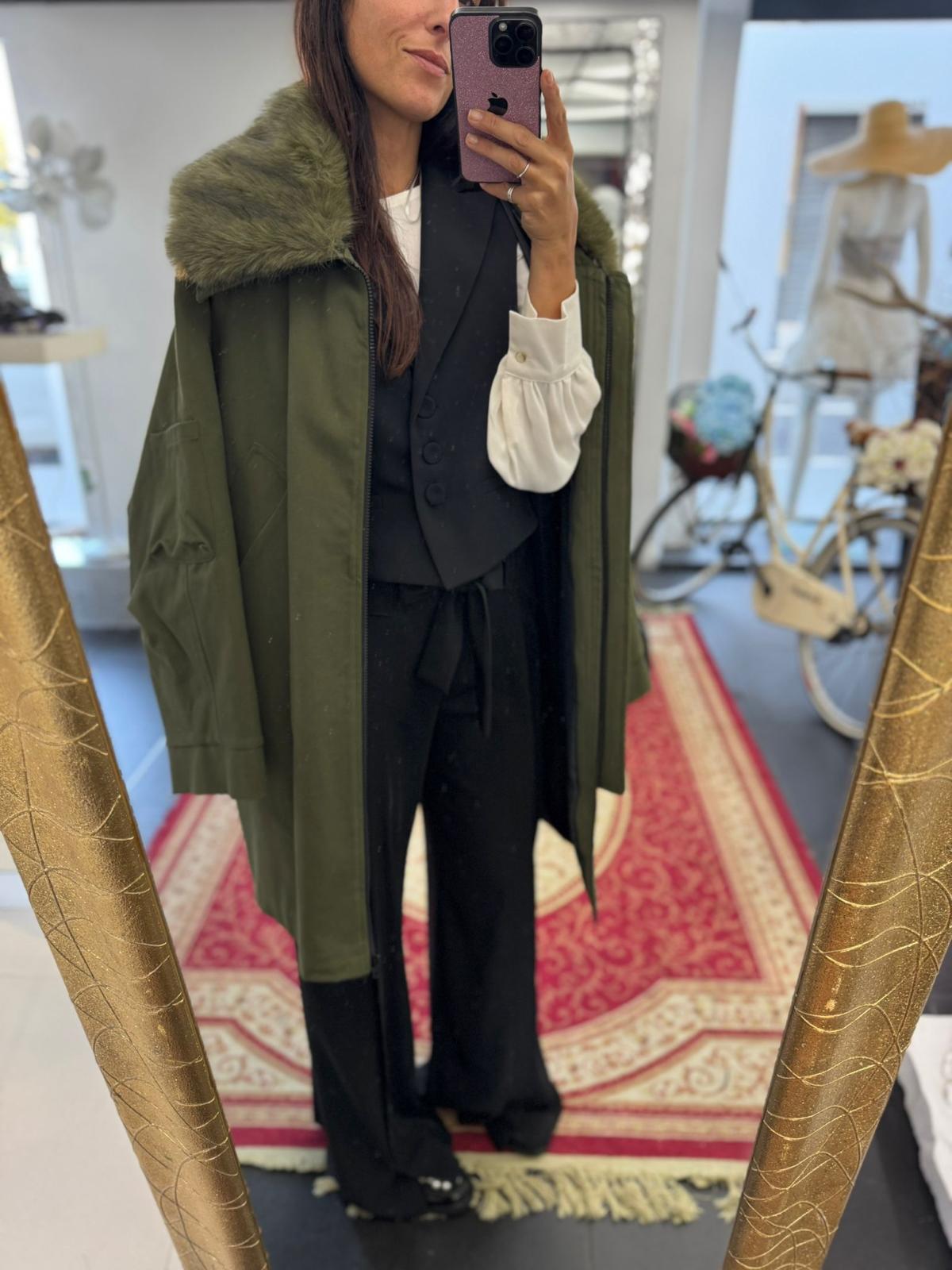 • Collo ampio in pelliccia ecologica color verde salvia.