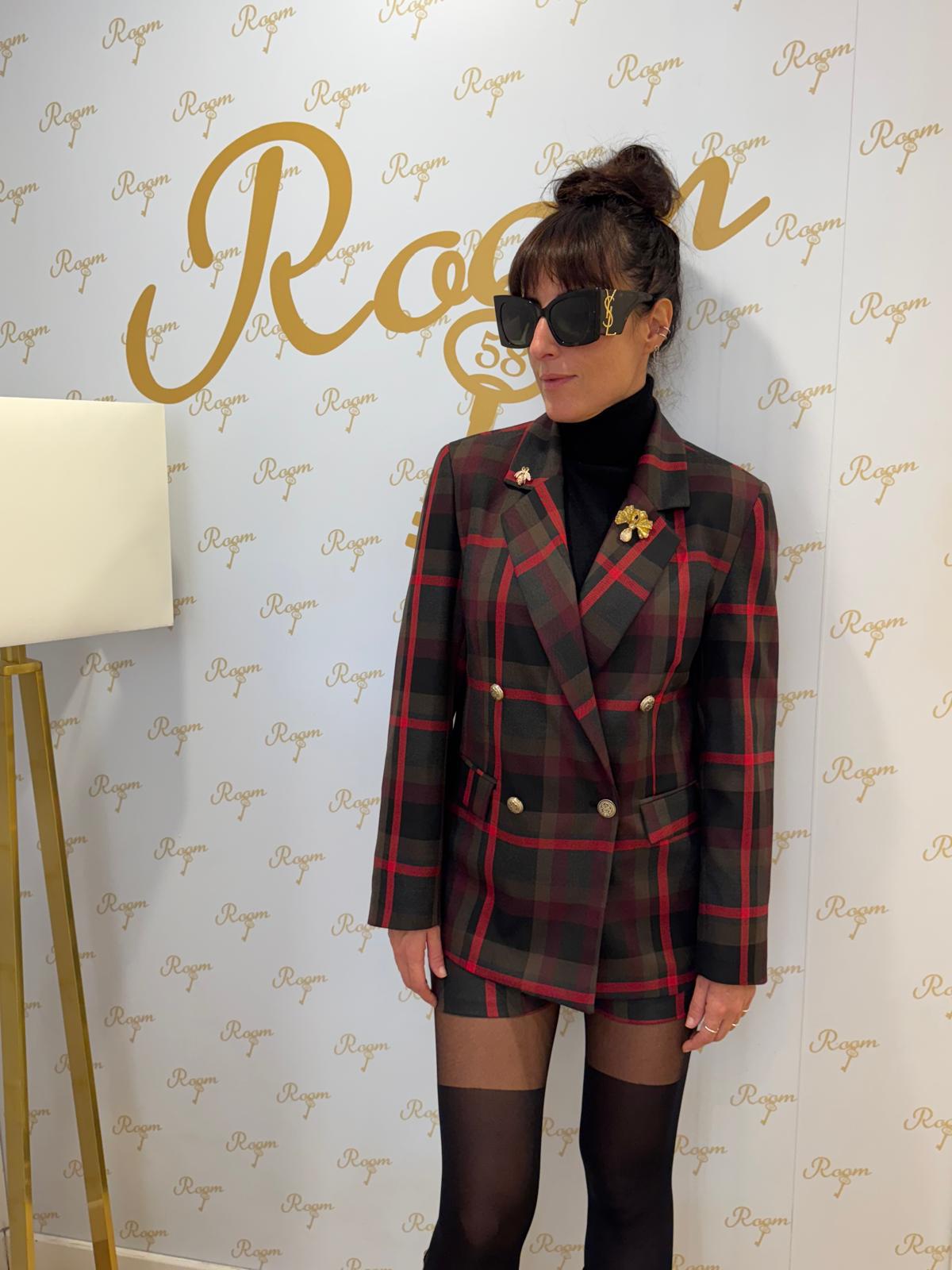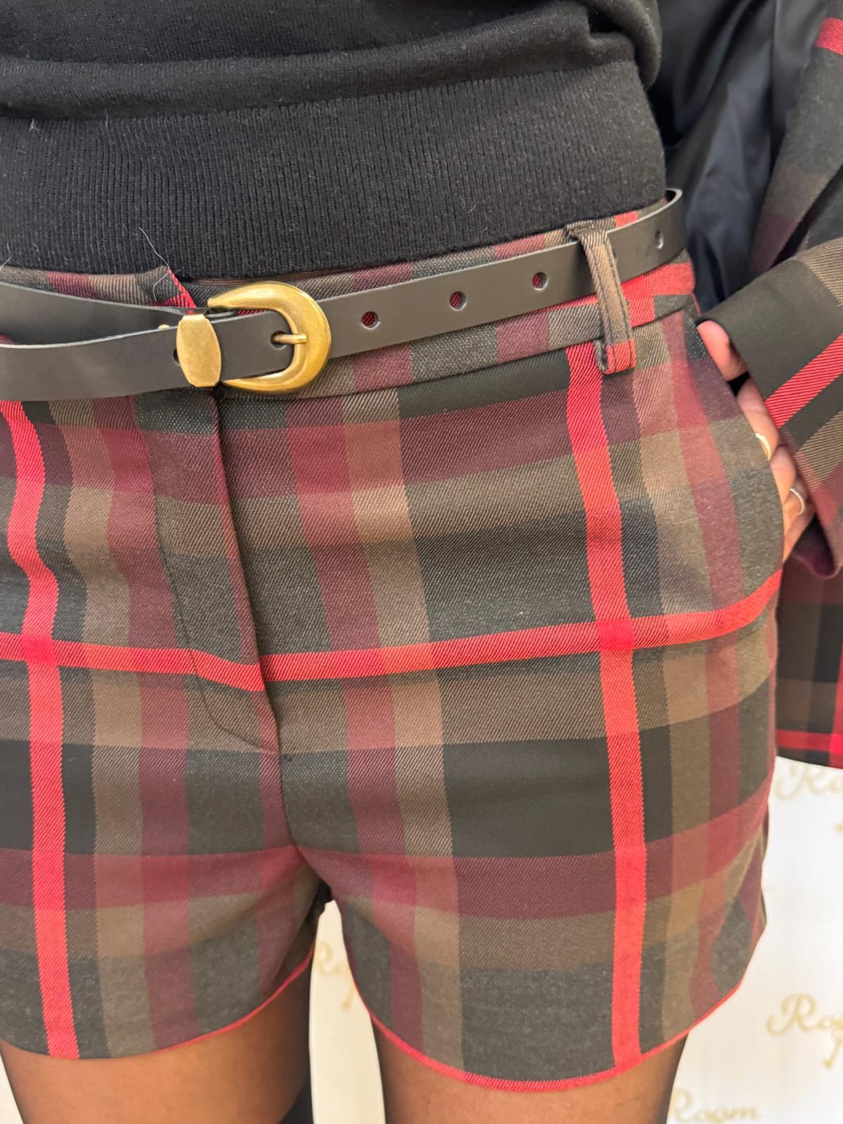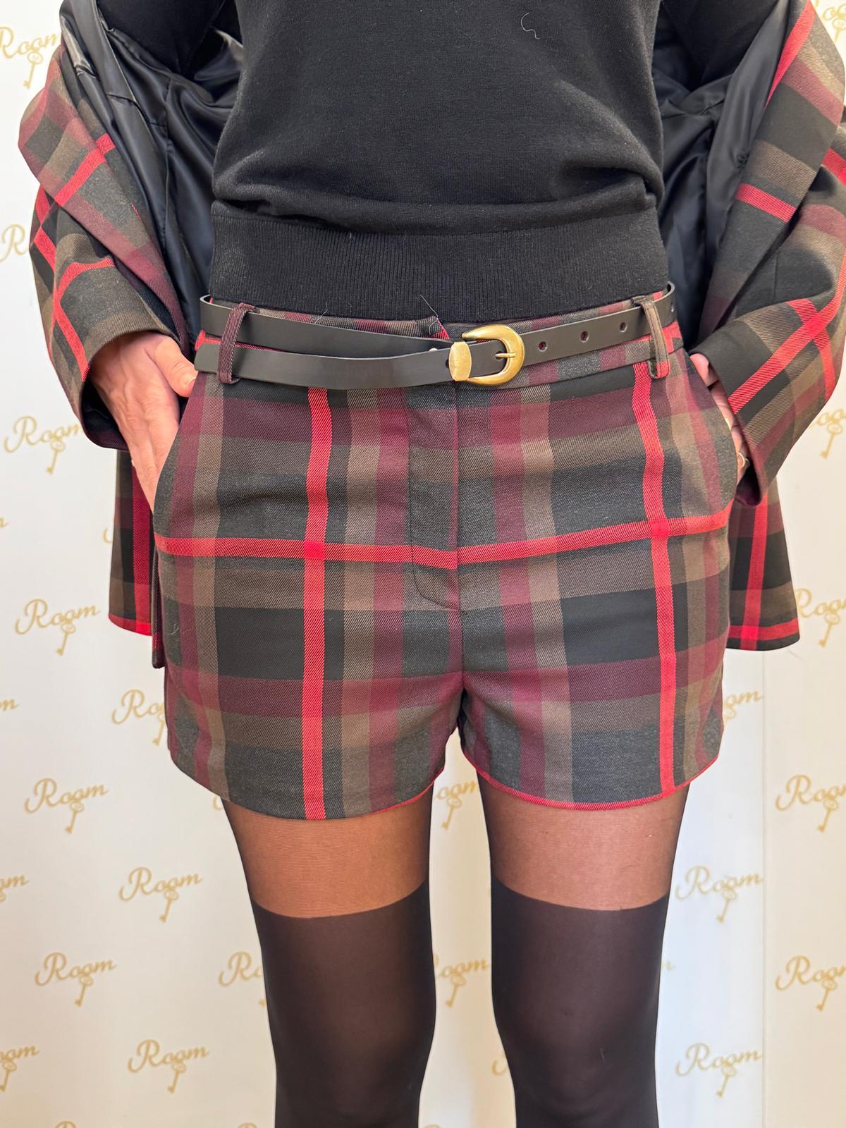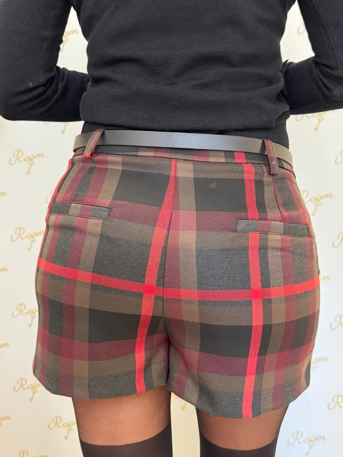 Realizzato in tessuto strutturato con motivo tartan nei toni del bordeaux e tortora, presenta una vita media, tasche laterali e passanti per cintura.