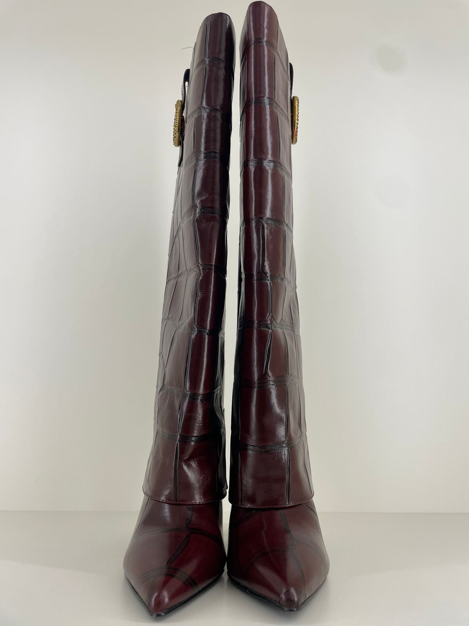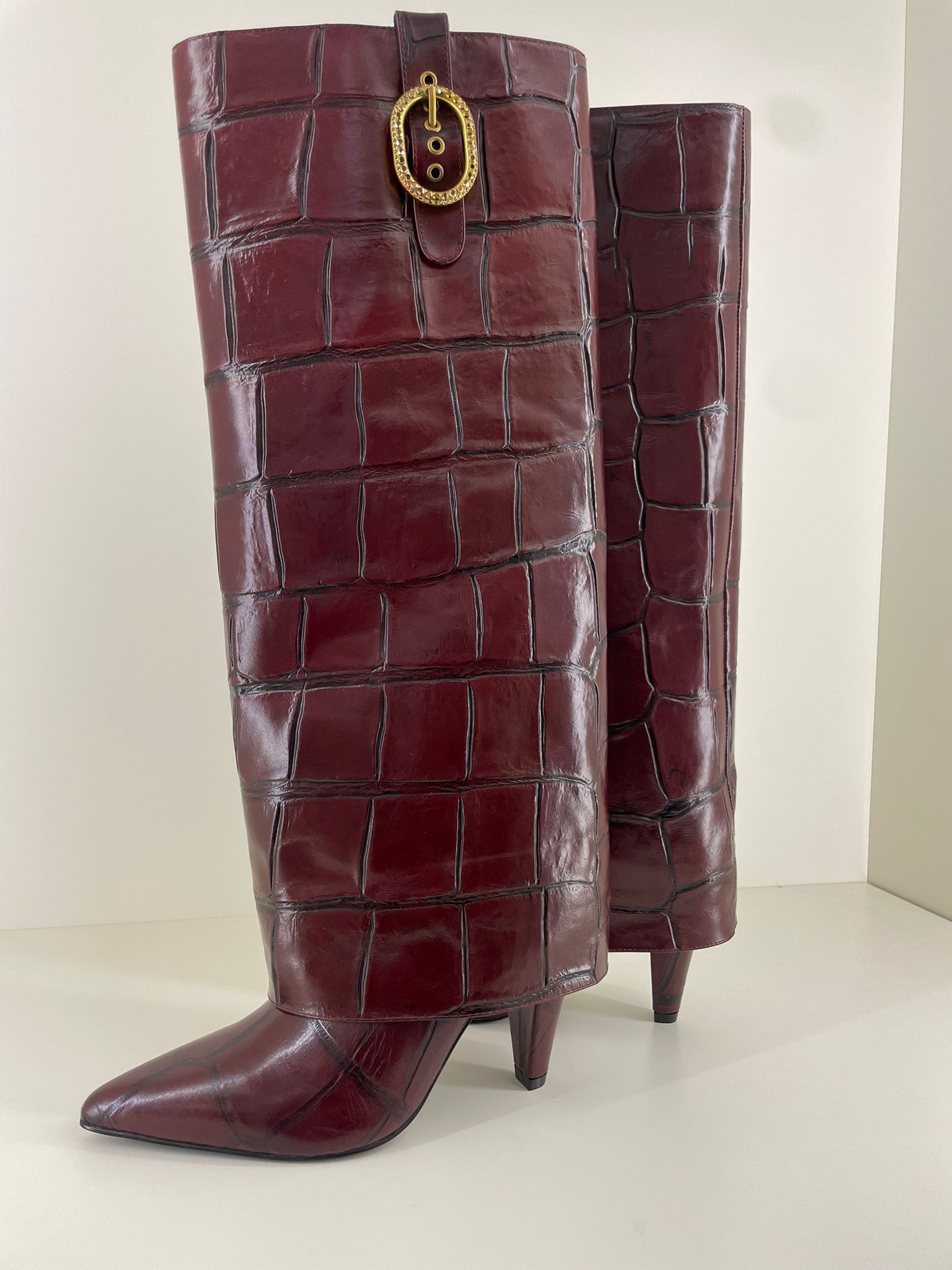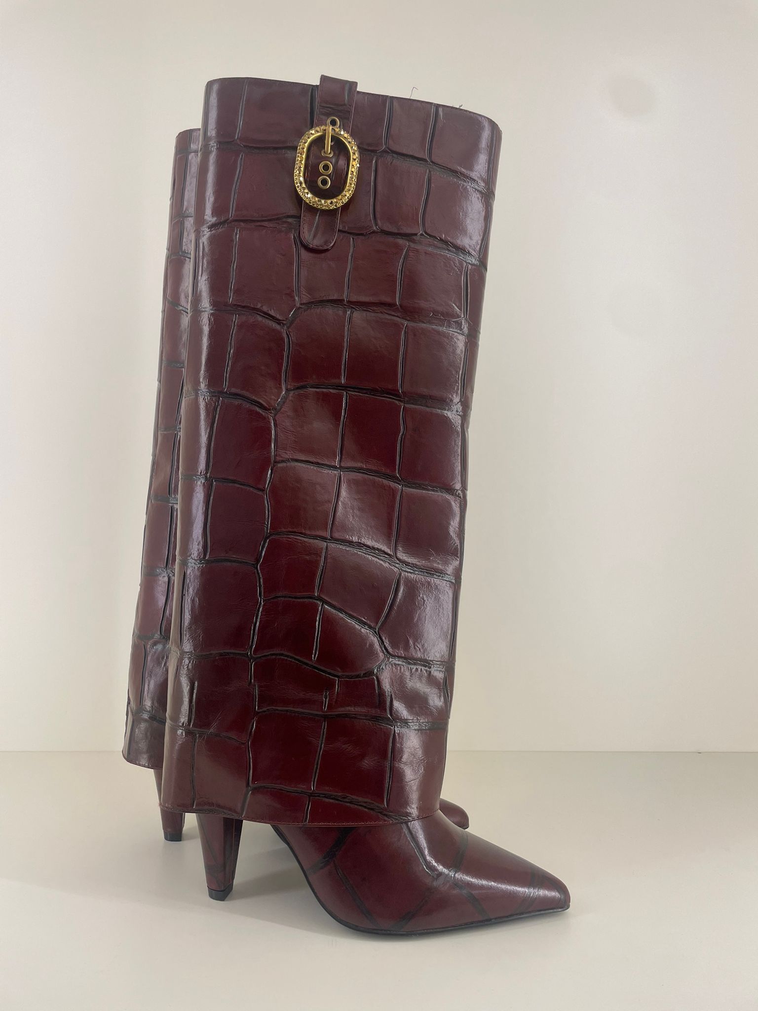 Questo stivale alto con risvolto presenta un gambale alto con stampa coccodrillo ingrandita. Presenta una fibbia in ottone anticato sul lato esterno della caviglia e il tacco è a cono.