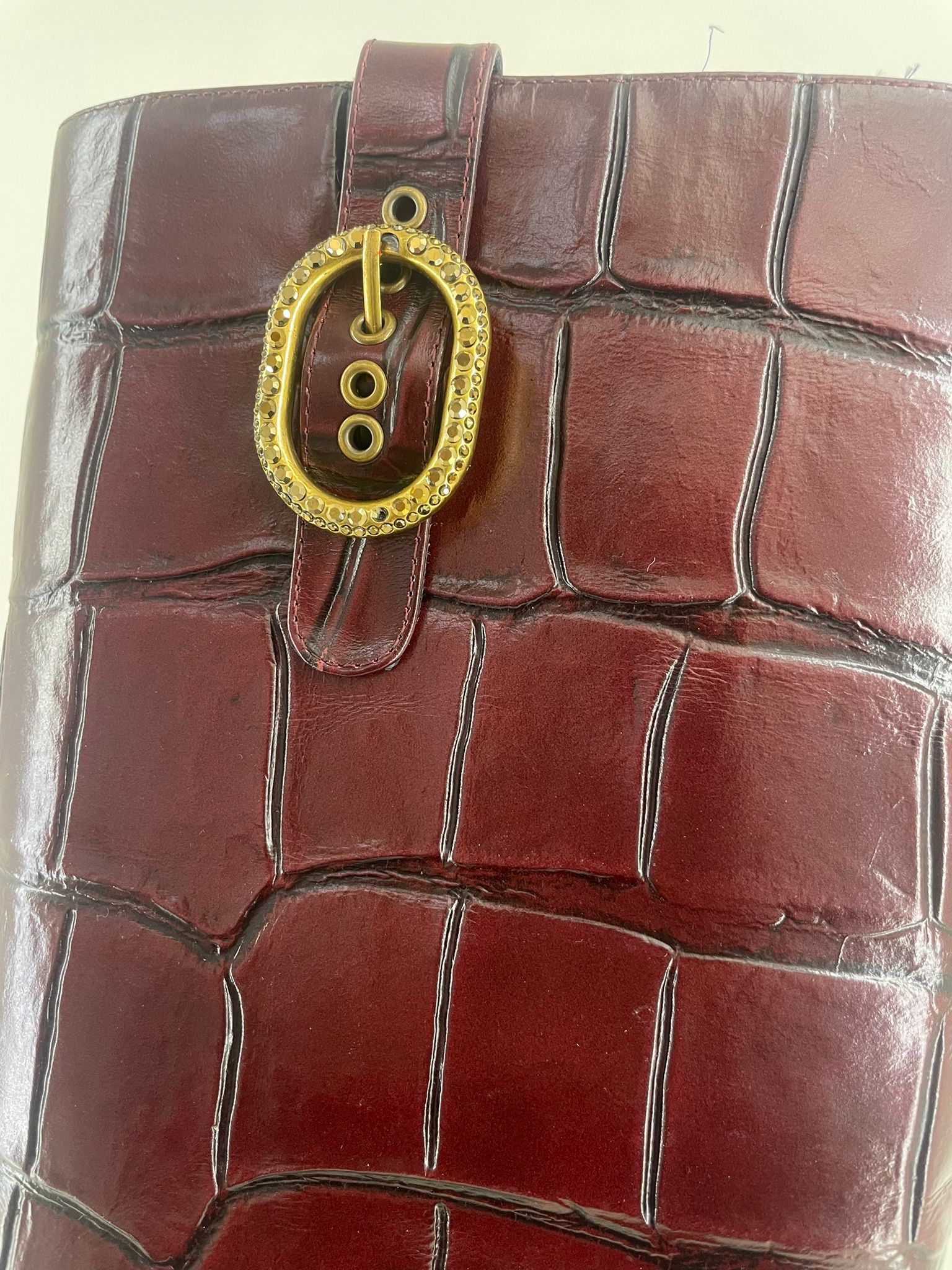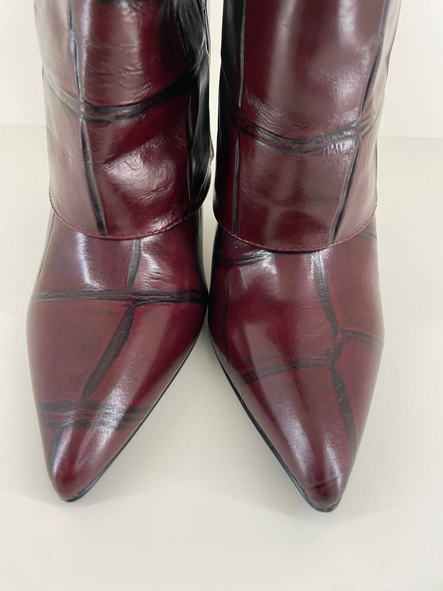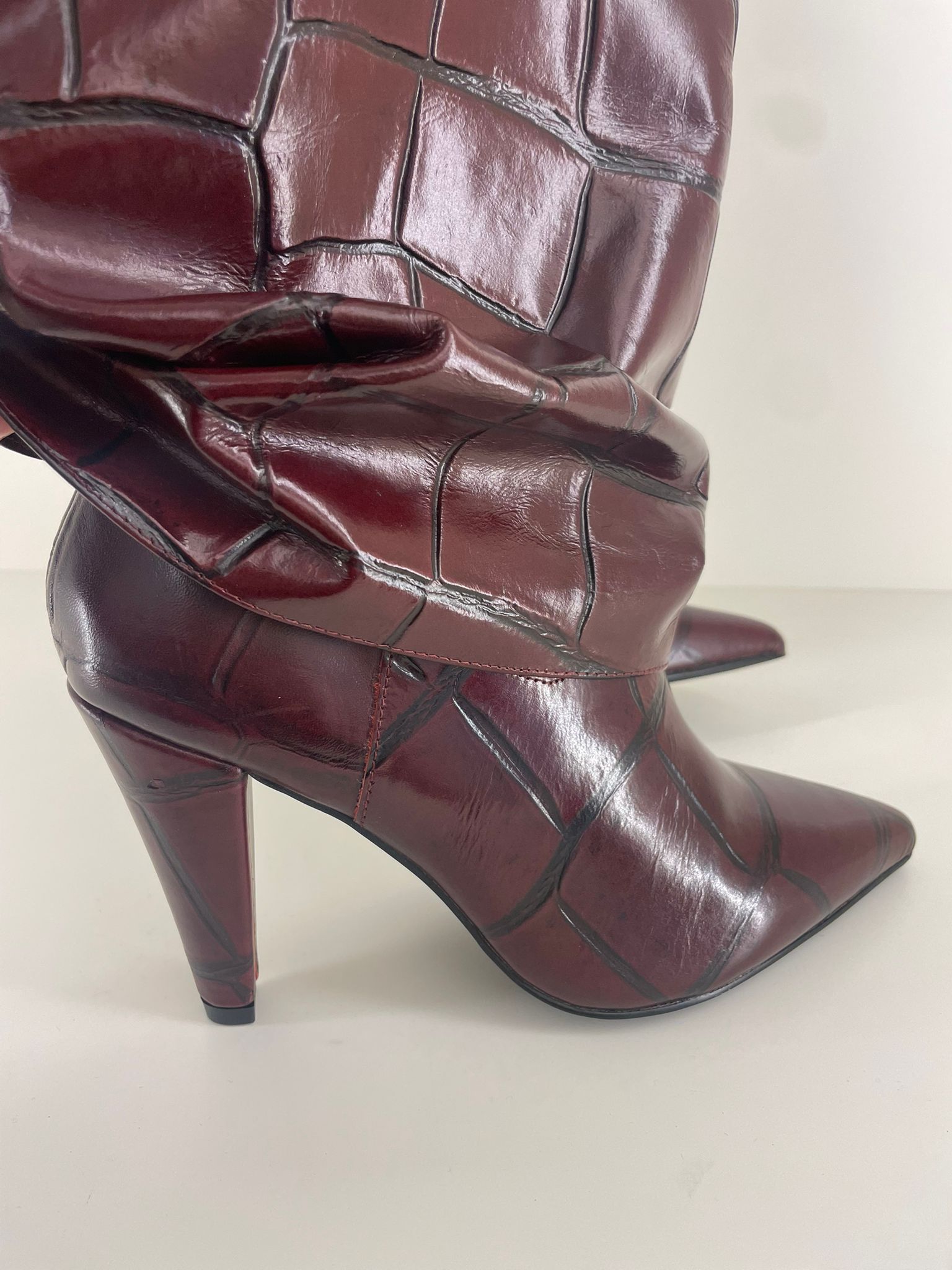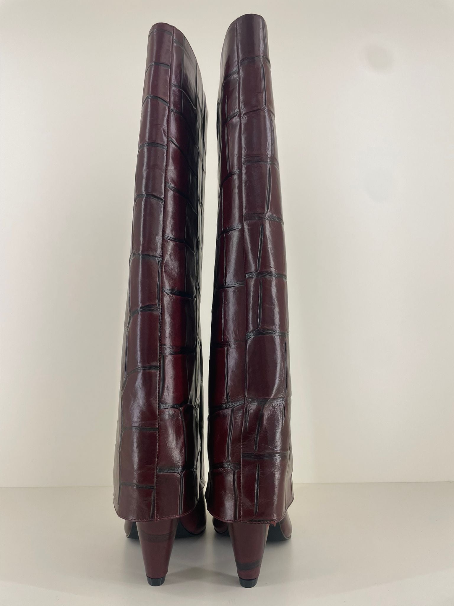 Questo stivale alto con risvolto presenta un gambale alto con stampa coccodrillo ingrandita. Presenta una fibbia in ottone anticato sul lato esterno della caviglia e il tacco è a cono.