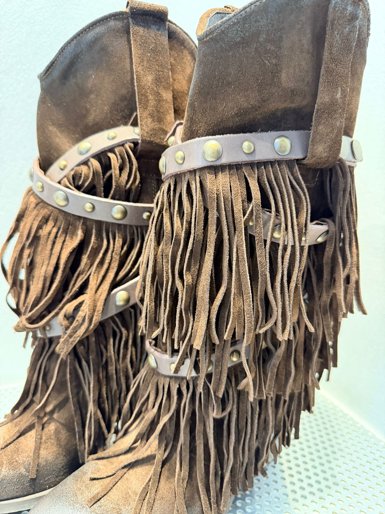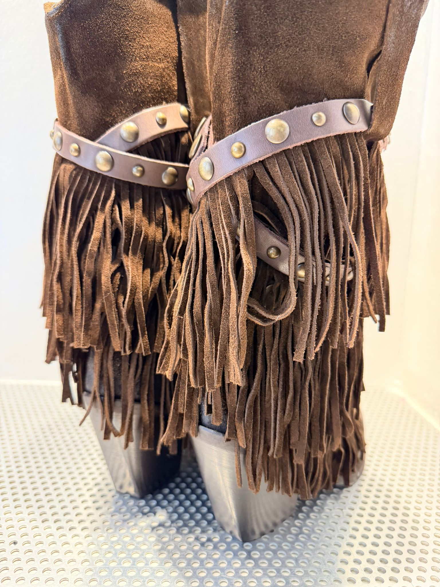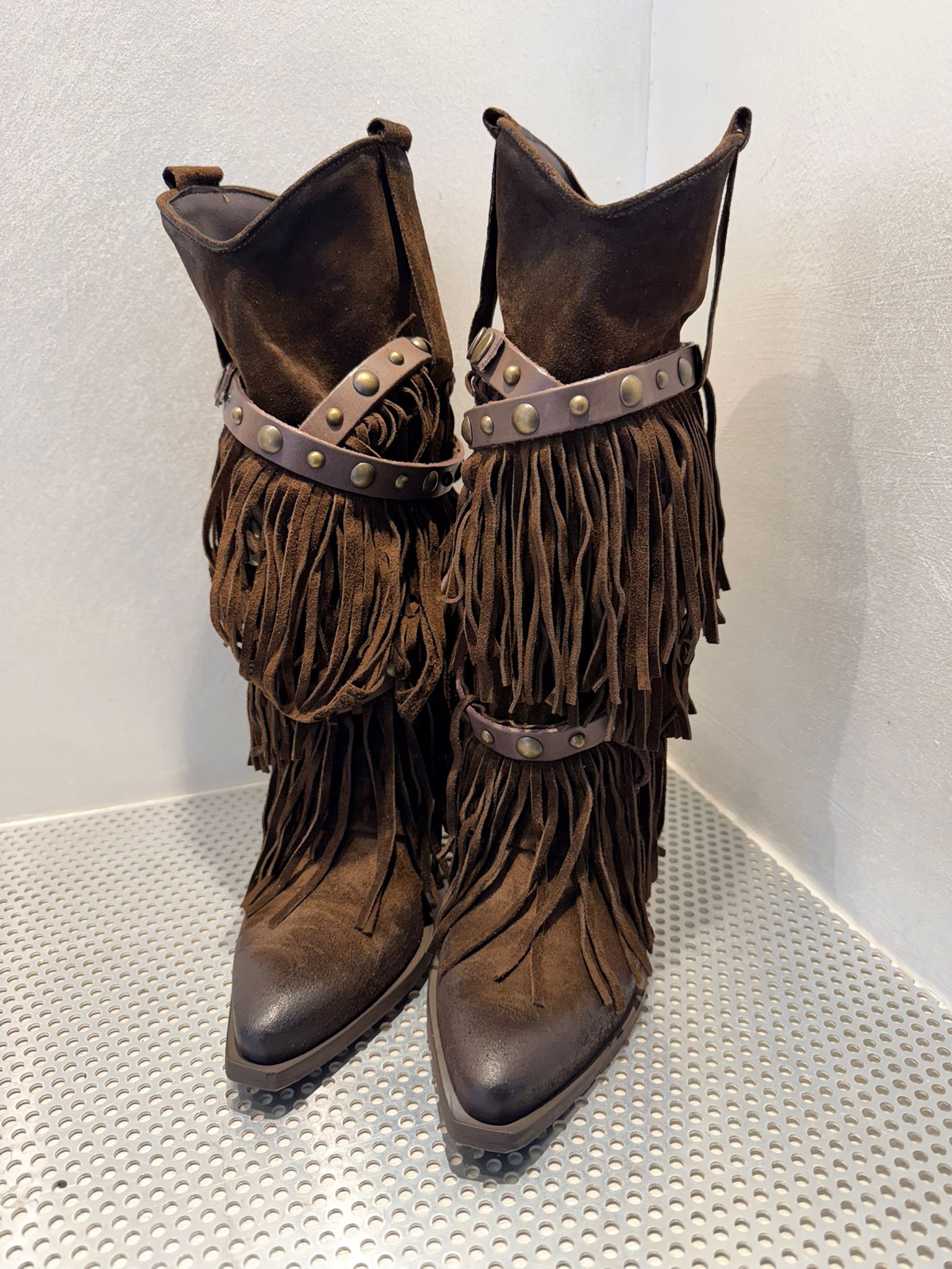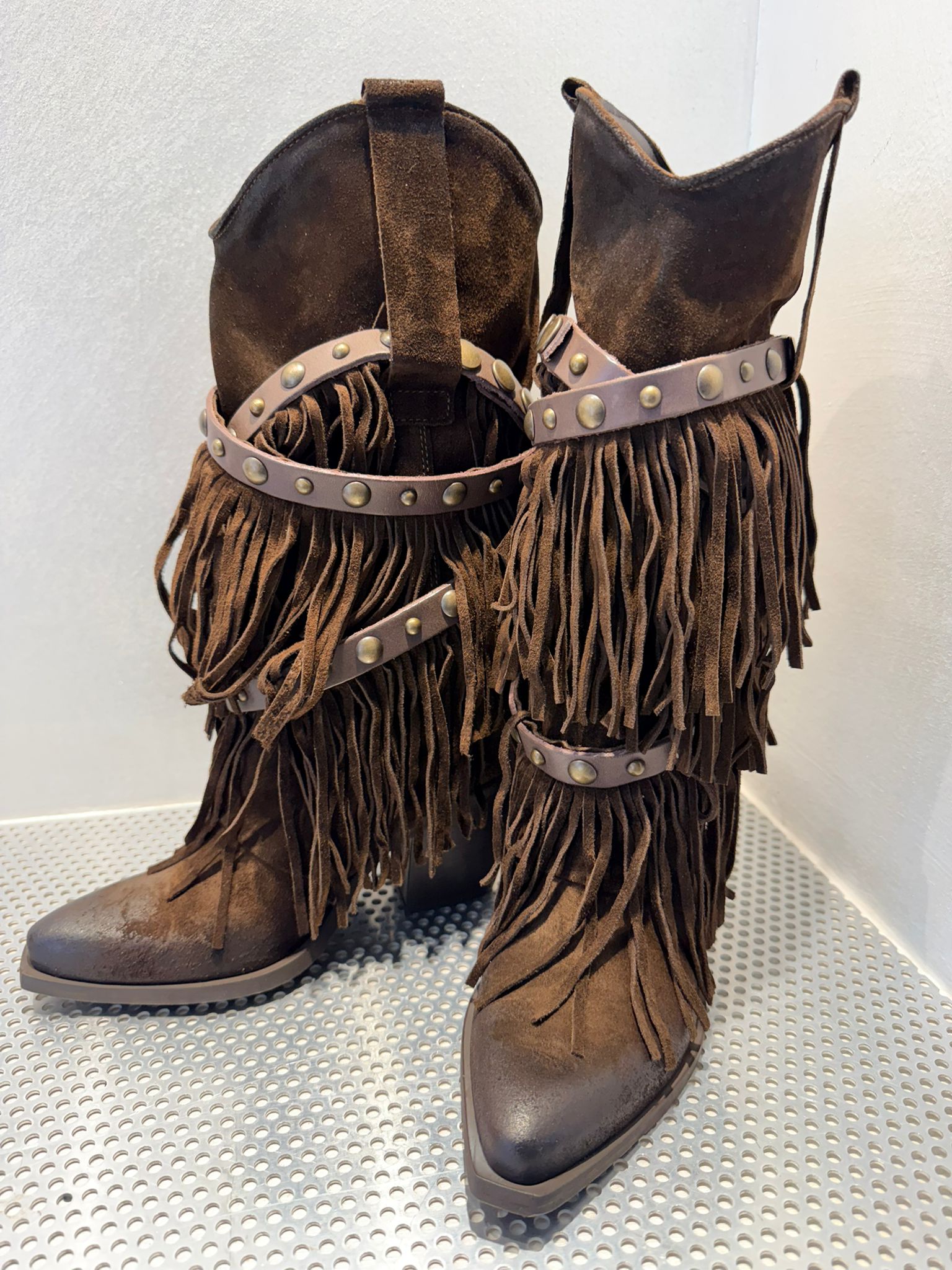 • Design: Modello alto con frange abbondanti su tutto il gambale e dettagli decorativi in pelle liscia con borchie in metallo bronzato.