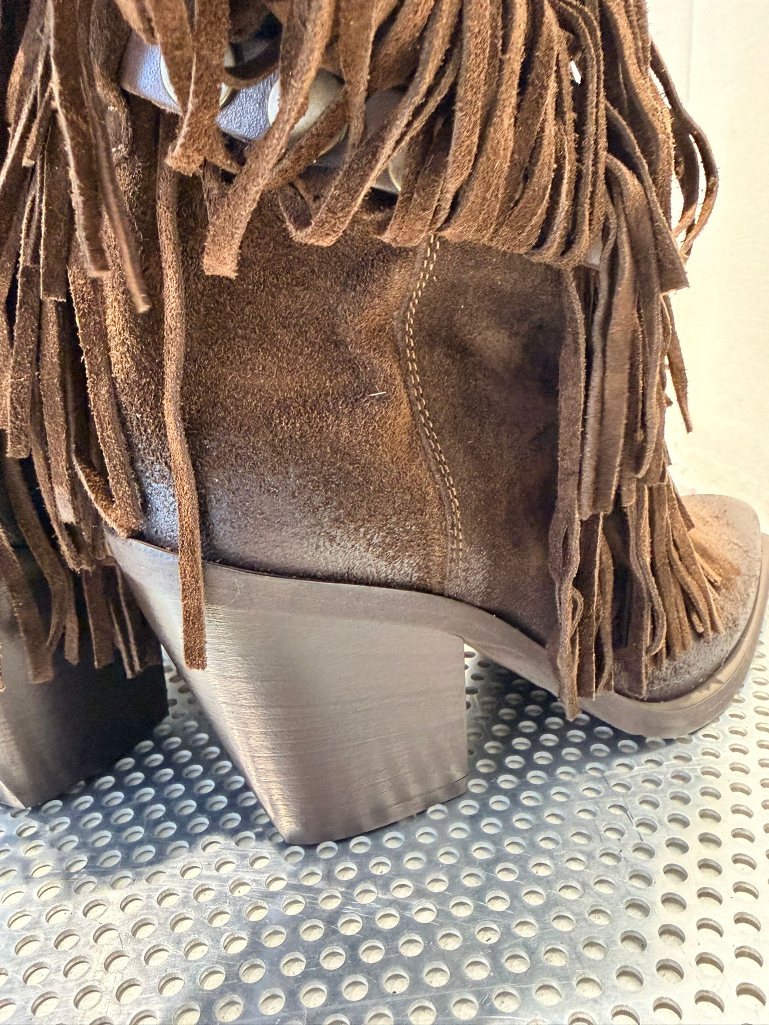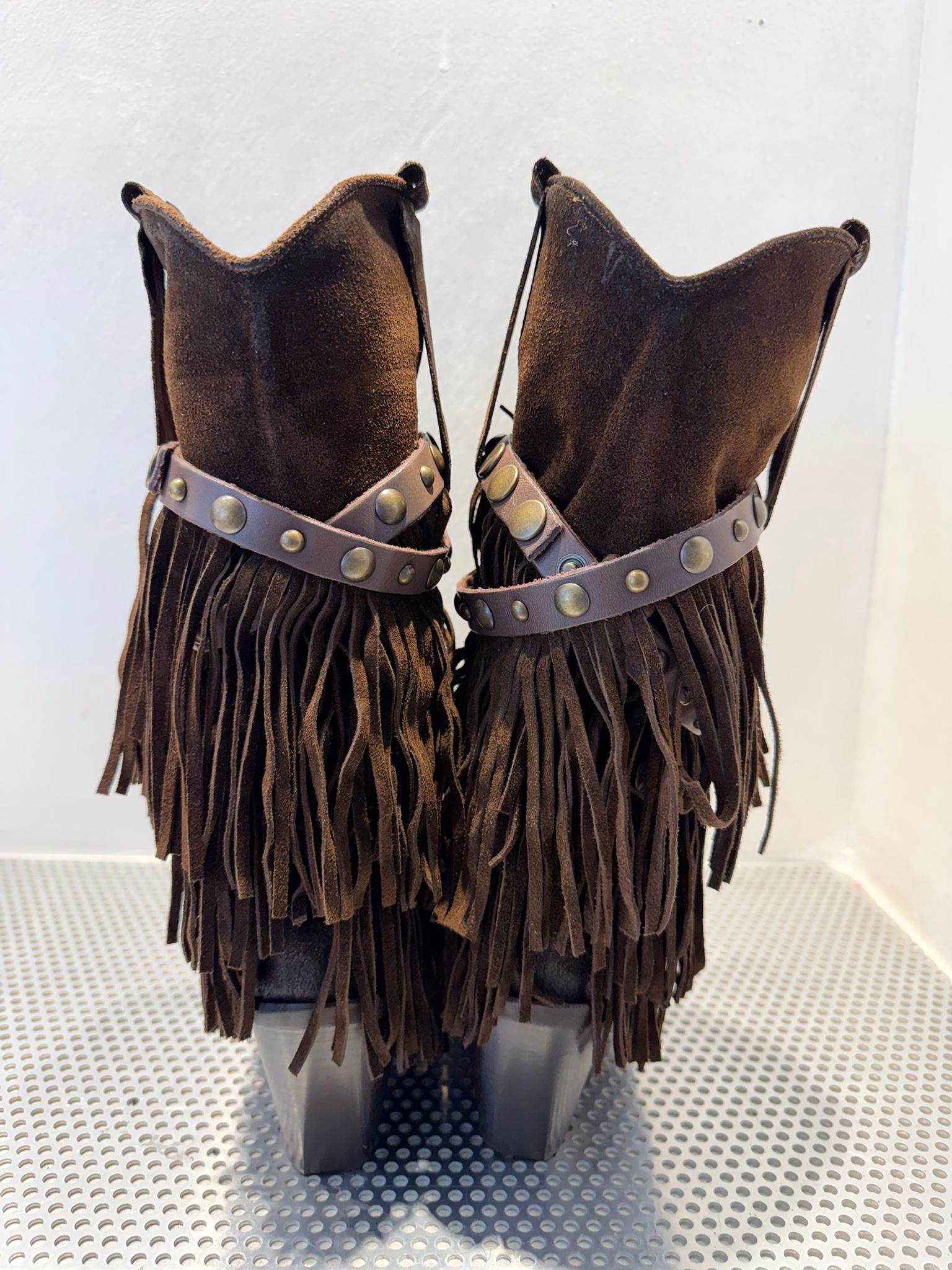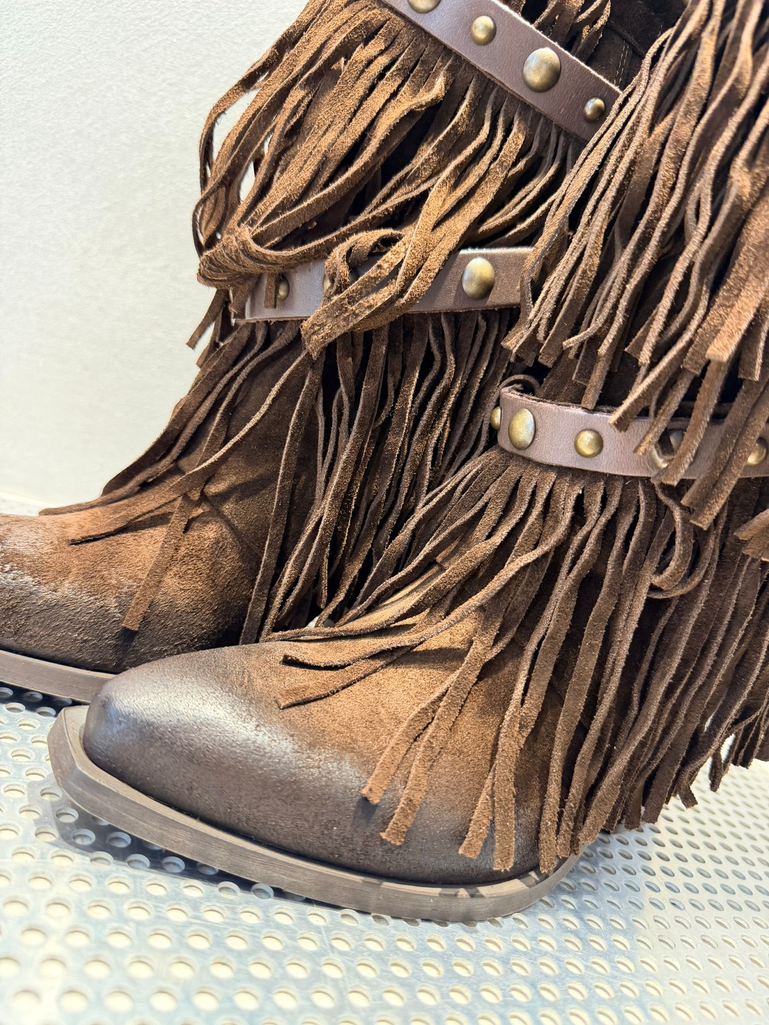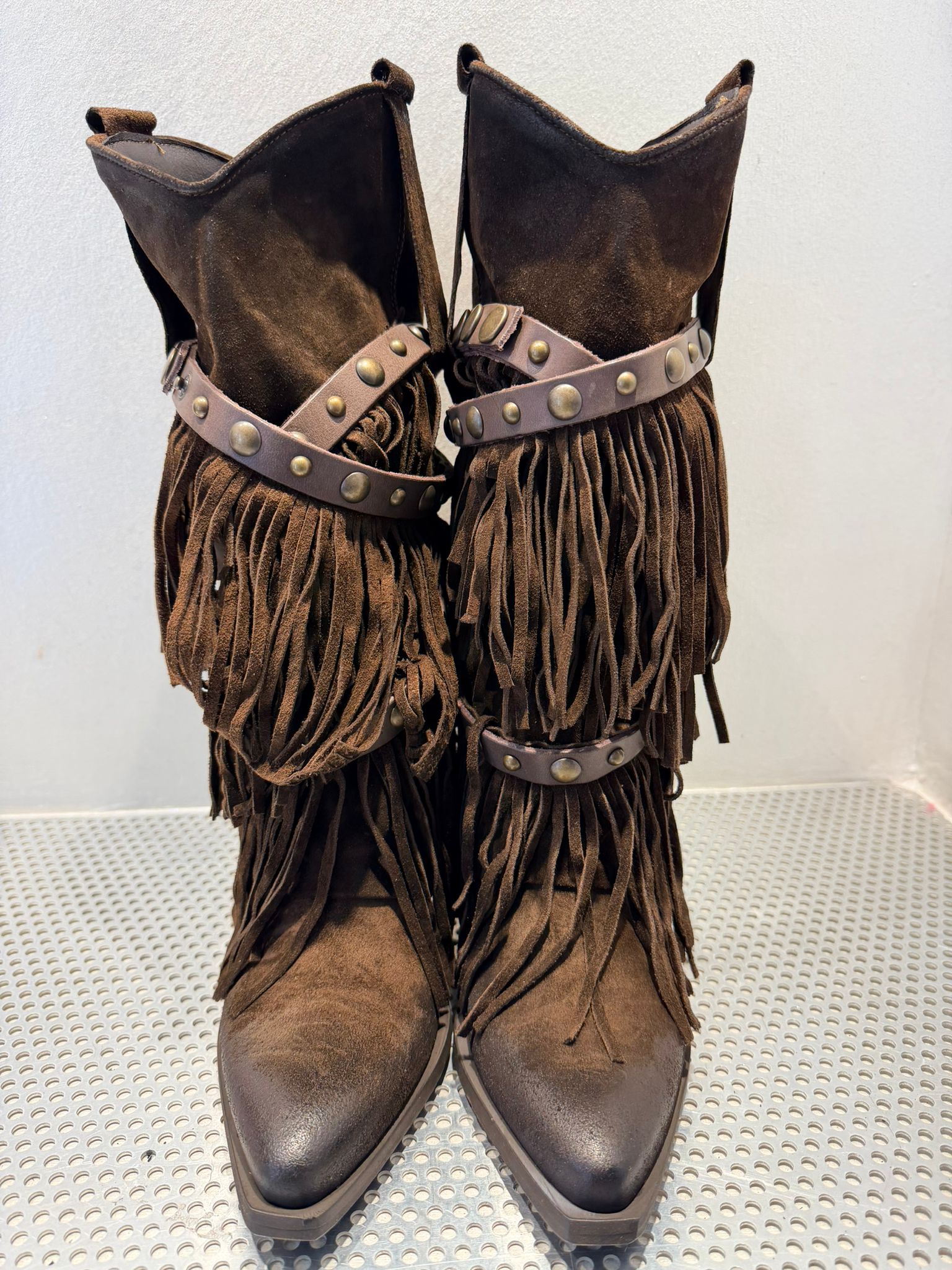 • Design: Modello alto con frange abbondanti su tutto il gambale e dettagli decorativi in pelle liscia con borchie in metallo bronzato.