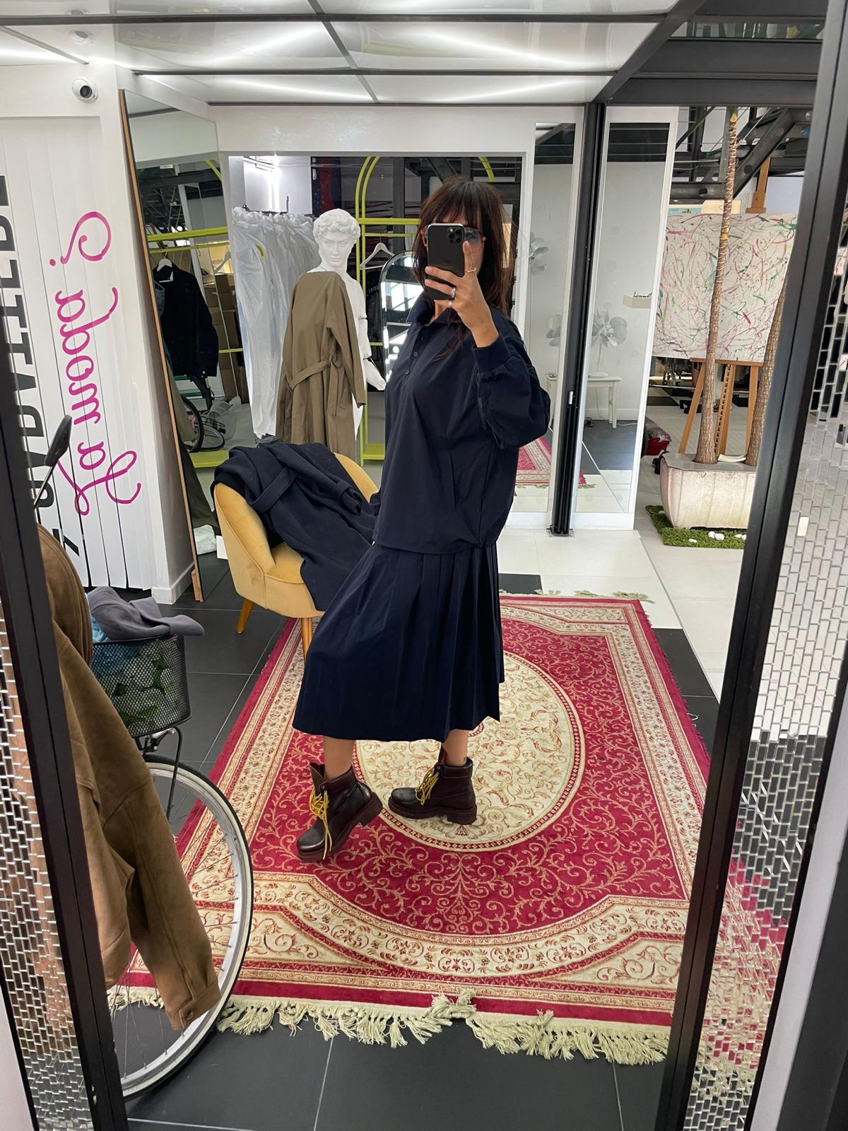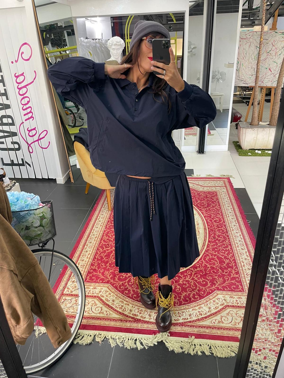 La gonna è lunga fino al polpaccio, con pieghe morbide che le danno movimento e leggerezza. Ha in vita un elastico regolato da un laccetto con estremità a contrasto, dettaglio che richiama lo stile pratico e informale.