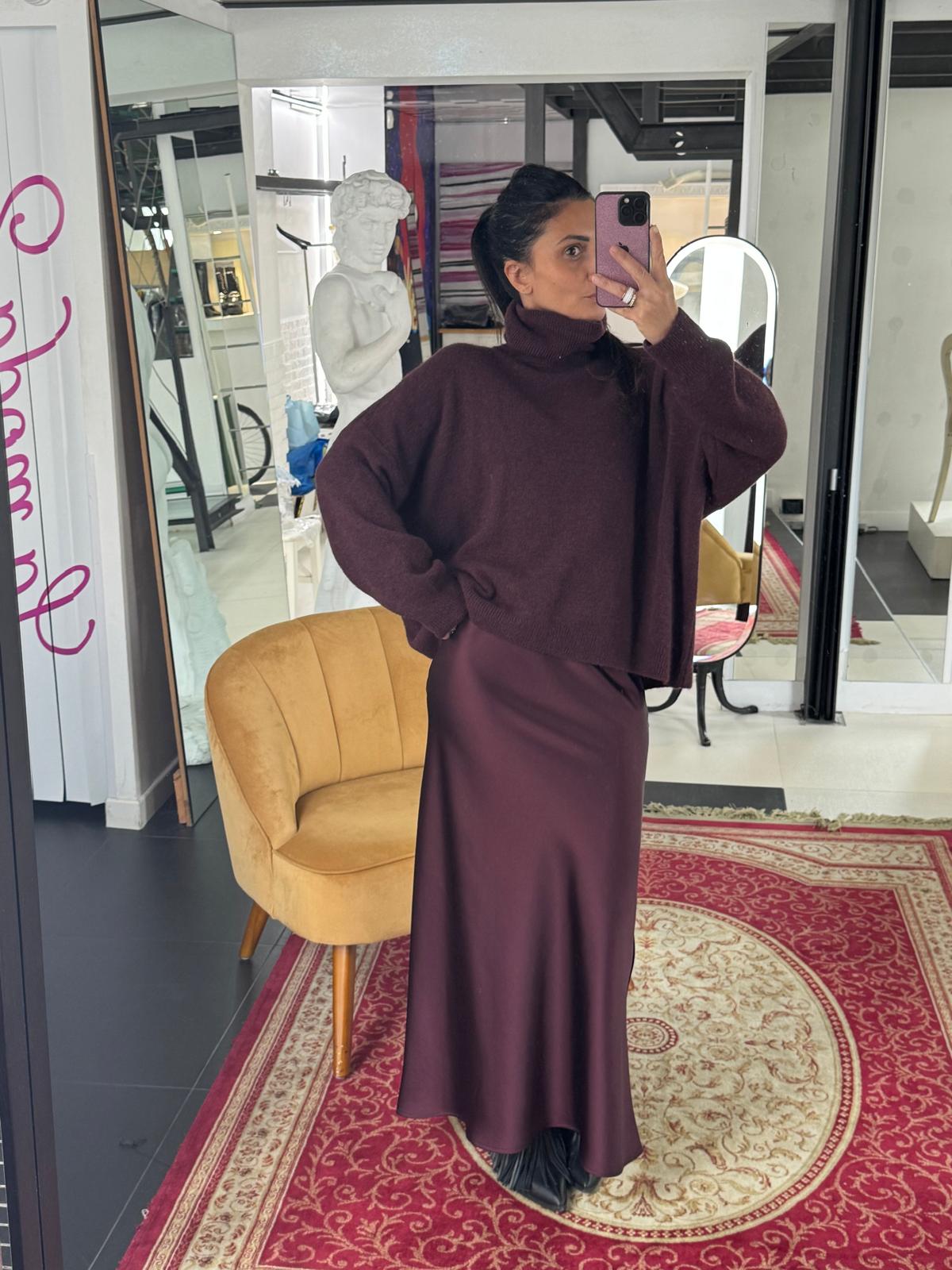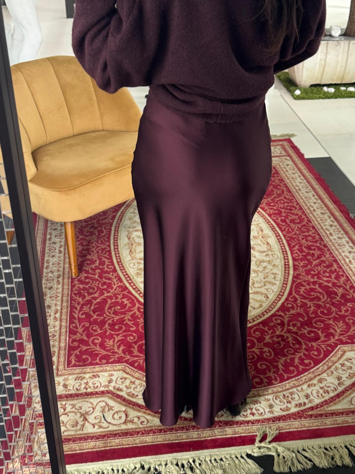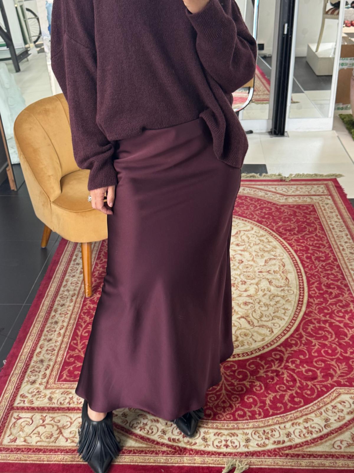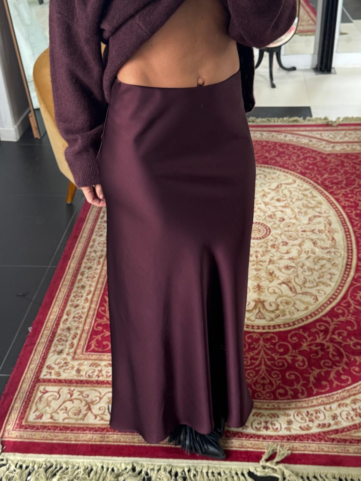 Elegante gonna lunga in raso color prugna, dal taglio svasato e fluido che valorizza la figura con raffinatezza. Il tessuto leggermente lucido crea un effetto morbido e femminile, perfetto sia per look da giorno con maglioni over, sia per outfit serali più sofisticati.