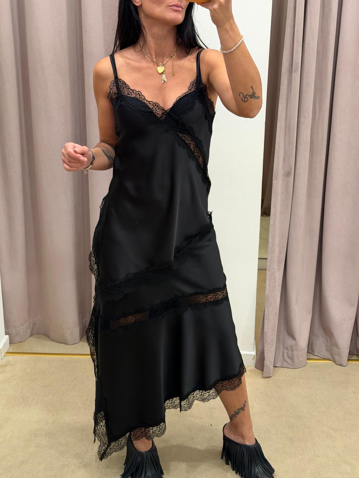 Gonna midi in raso saten effetto seta con inserti di pizzo nero che creano un elegante contrasto. Il taglio leggermente svasato e lo spacco laterale donano femminilità e movimento.