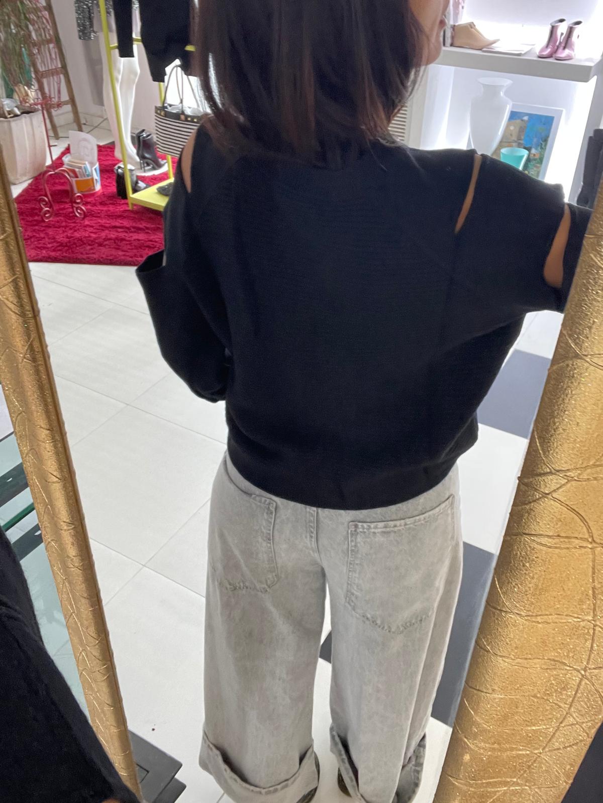 Il dettaglio delle spalle scoperte aggiunge un tocco audace e moderno, mentre le maniche lunghe leggermente svasate donano equilibrio e movimento alla silhouette.