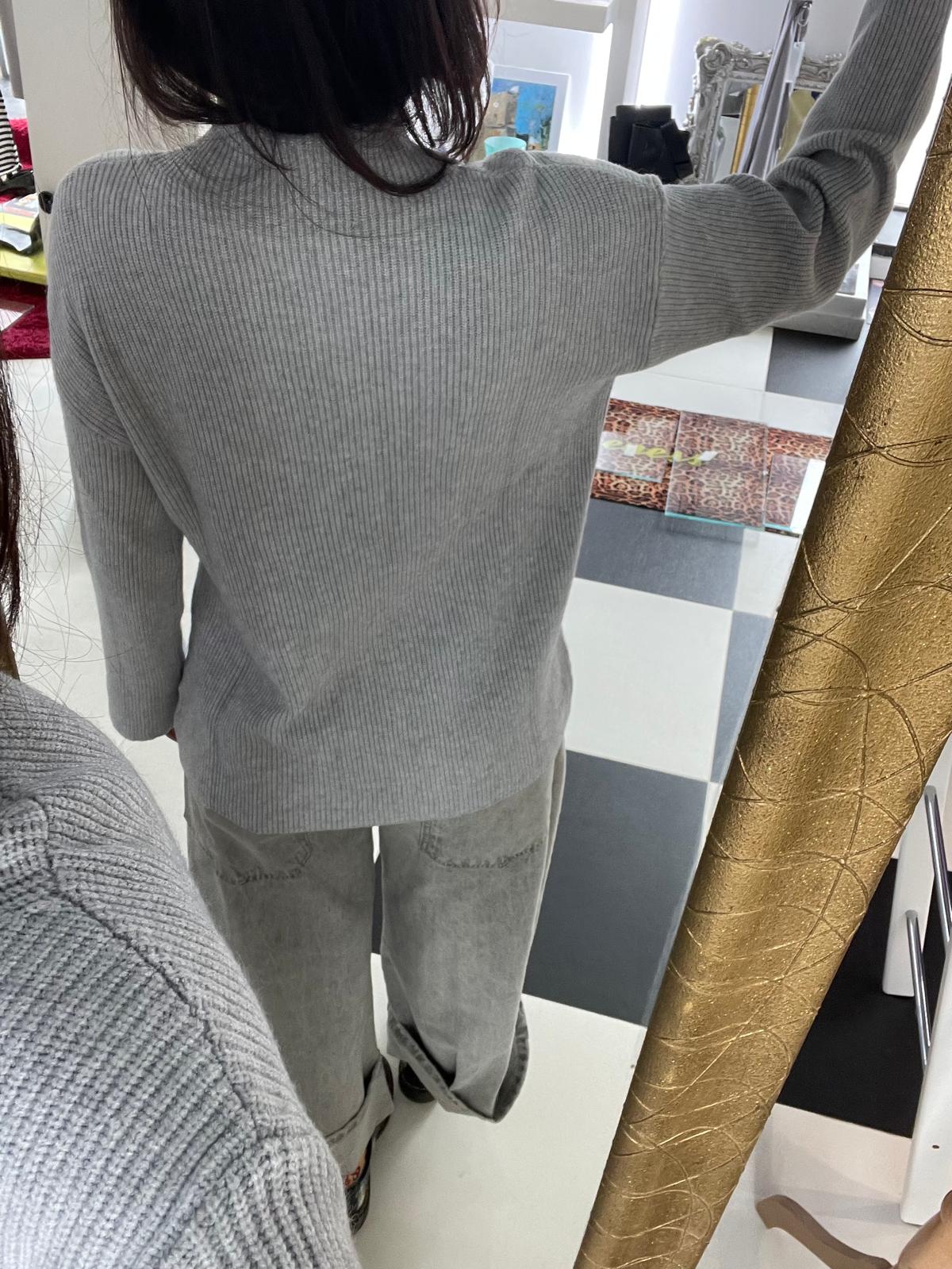 Questa maglia in maglia a coste color grigio perla unisce stile e praticità grazie al suo taglio asimmetrico con spacchi laterali, che dona movimento e slancia la figura. Il collo alto morbido aggiunge un tocco sofisticato, mentre le maniche lunghe leggermente svasate rendono il capo attuale e raffinato.