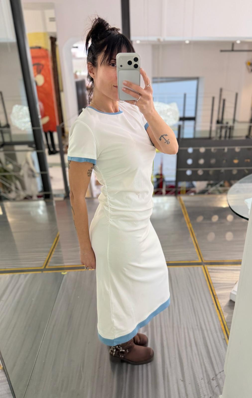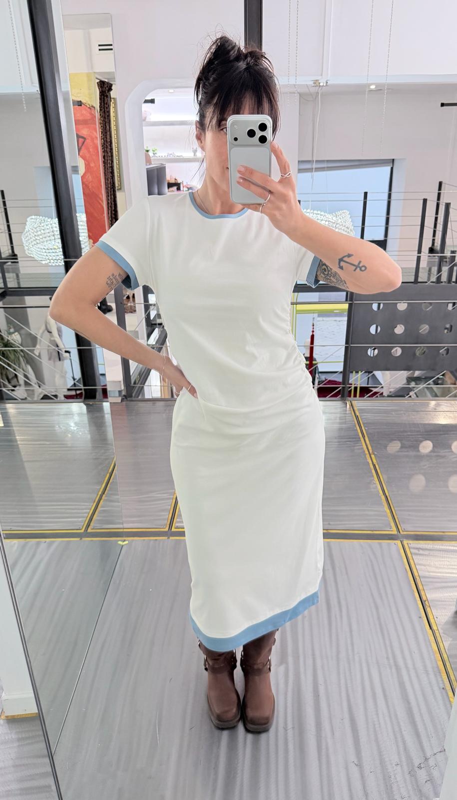 Abito a t-shirt midi a maniche corte, design lineare con profili a contrasto in azzurro polvere.