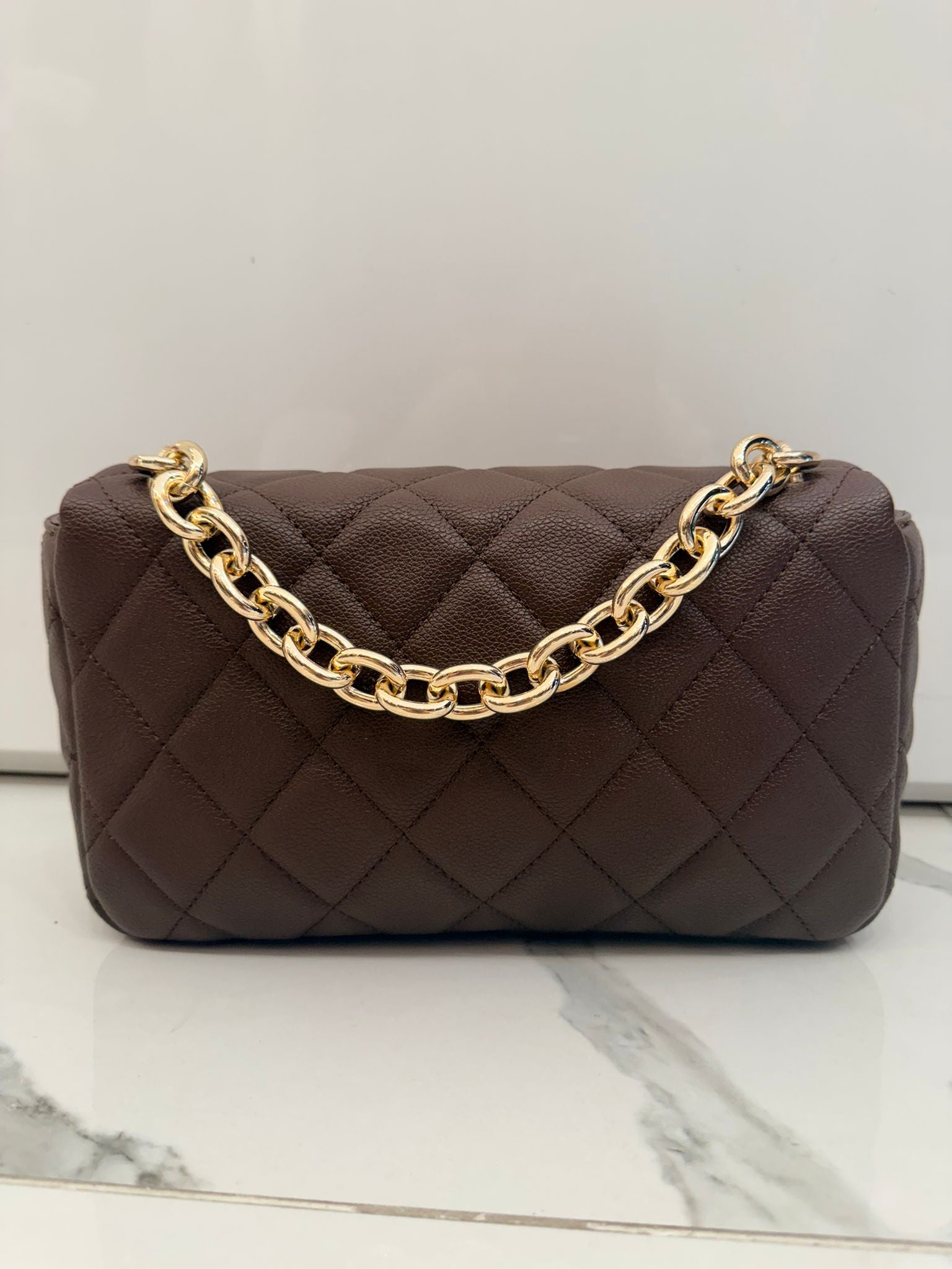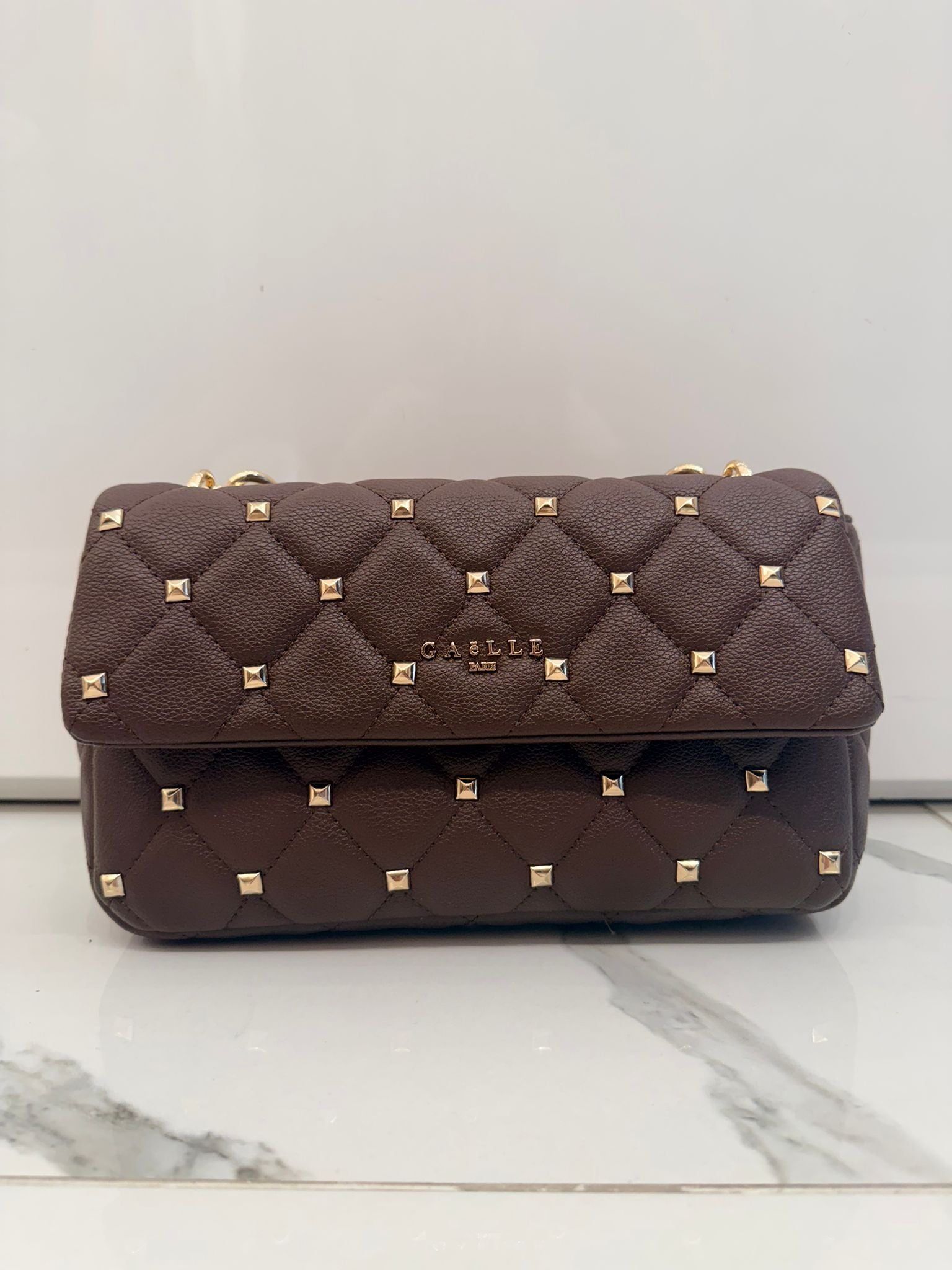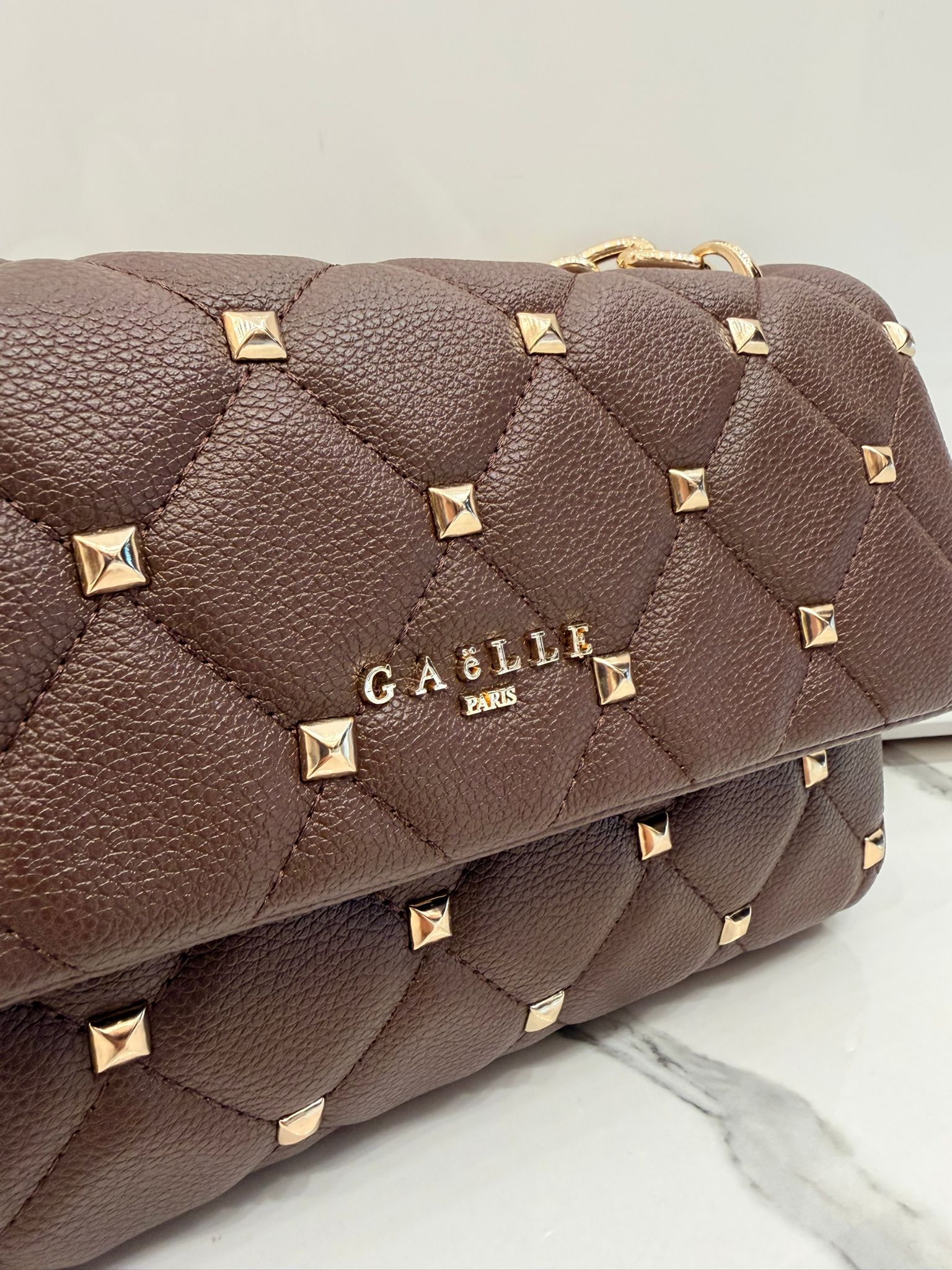 Borsa in ecopelle con lavorazione trapuntata e borchie dorate. Tracolla a catena e logo frontale Gaëlle. Elegante e versatile, ideale da giorno e da sera.