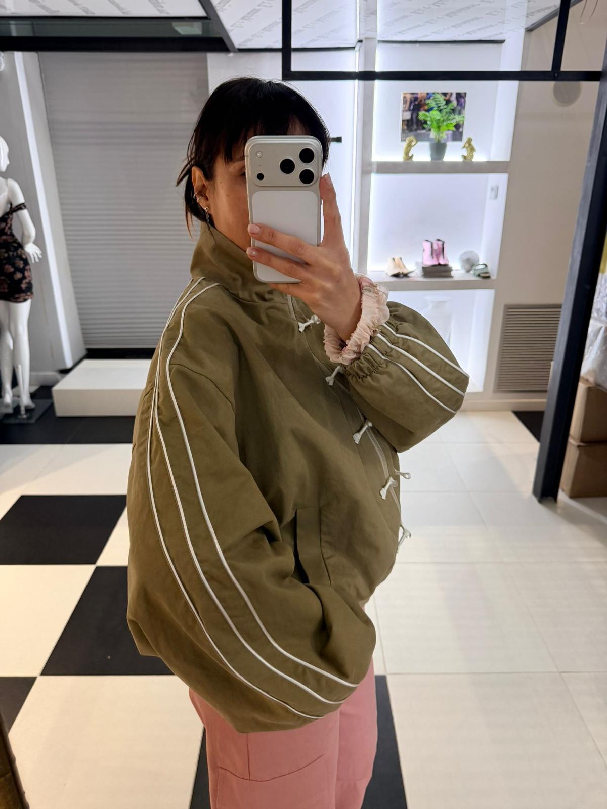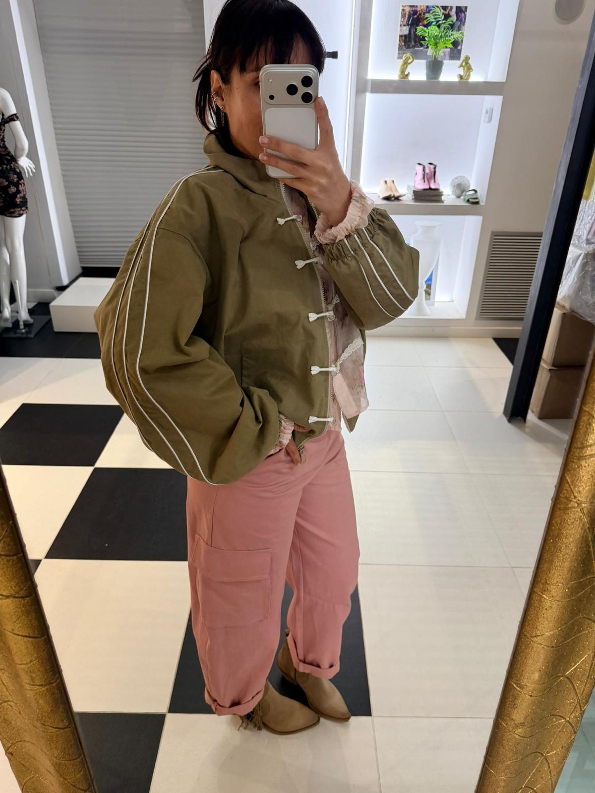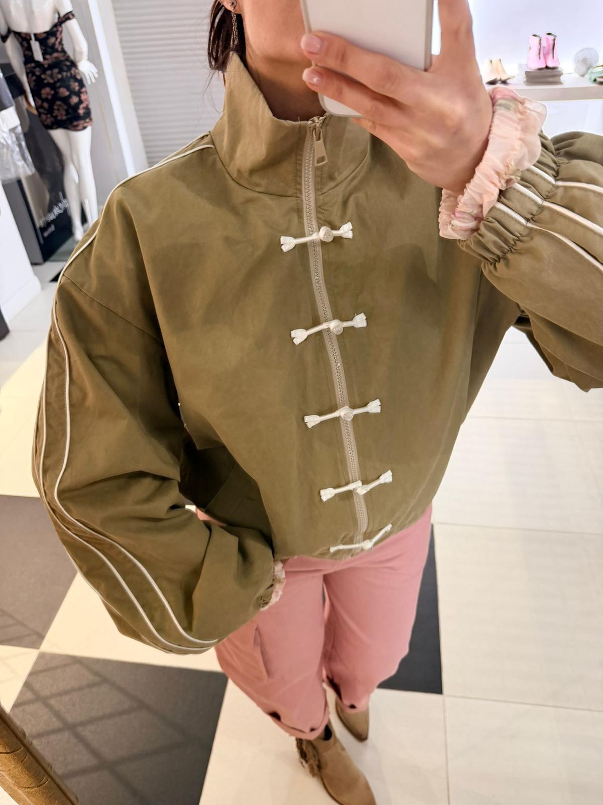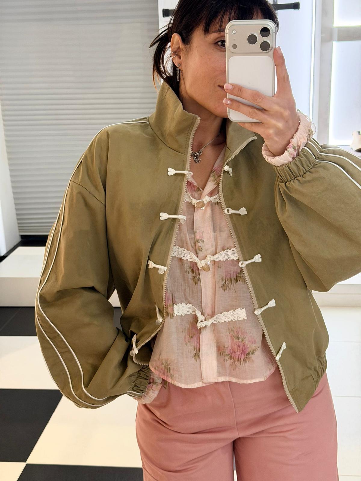 Giacca legegra stile bomber, presenta collo alto e chisura con zip frontale.