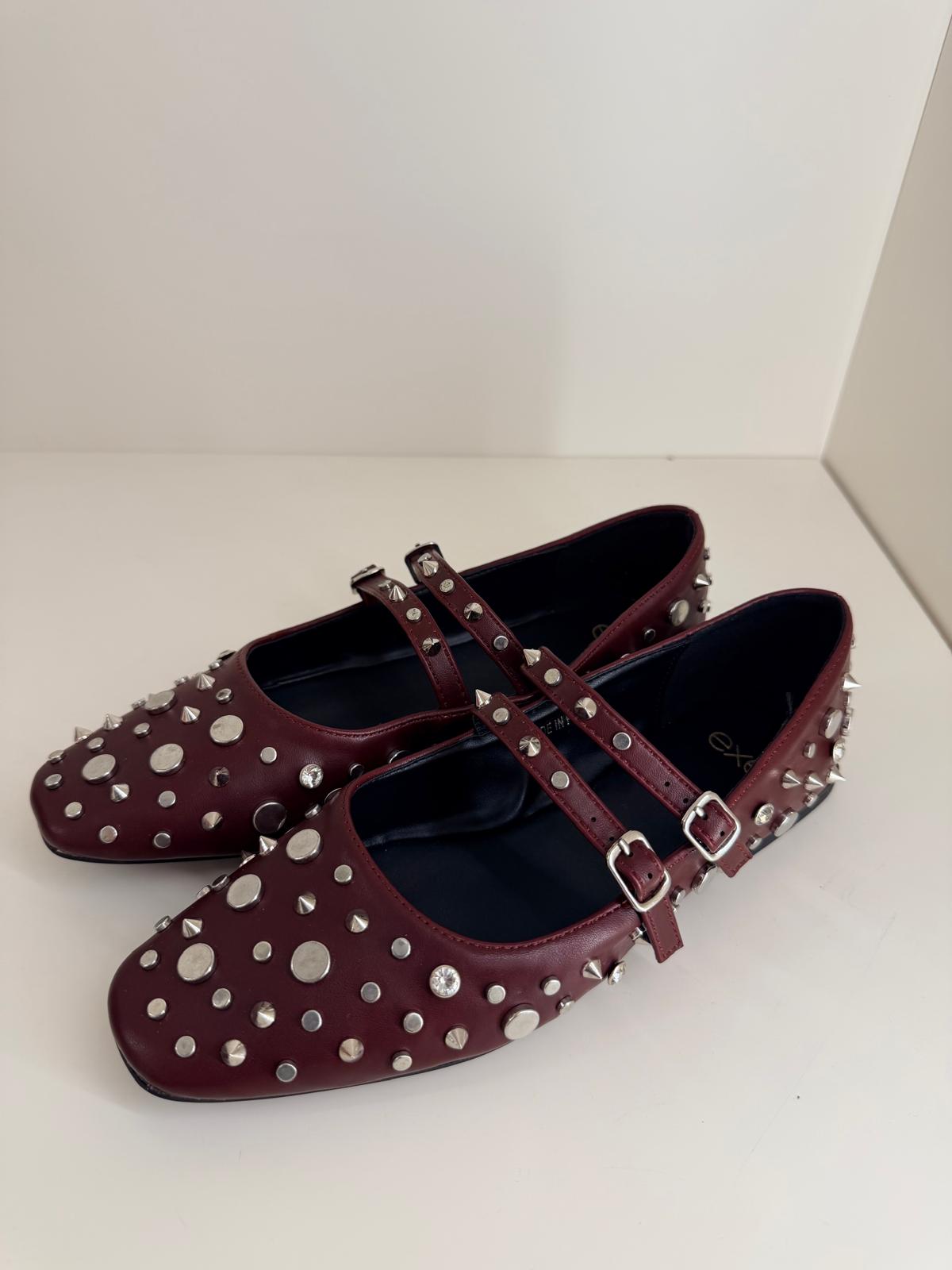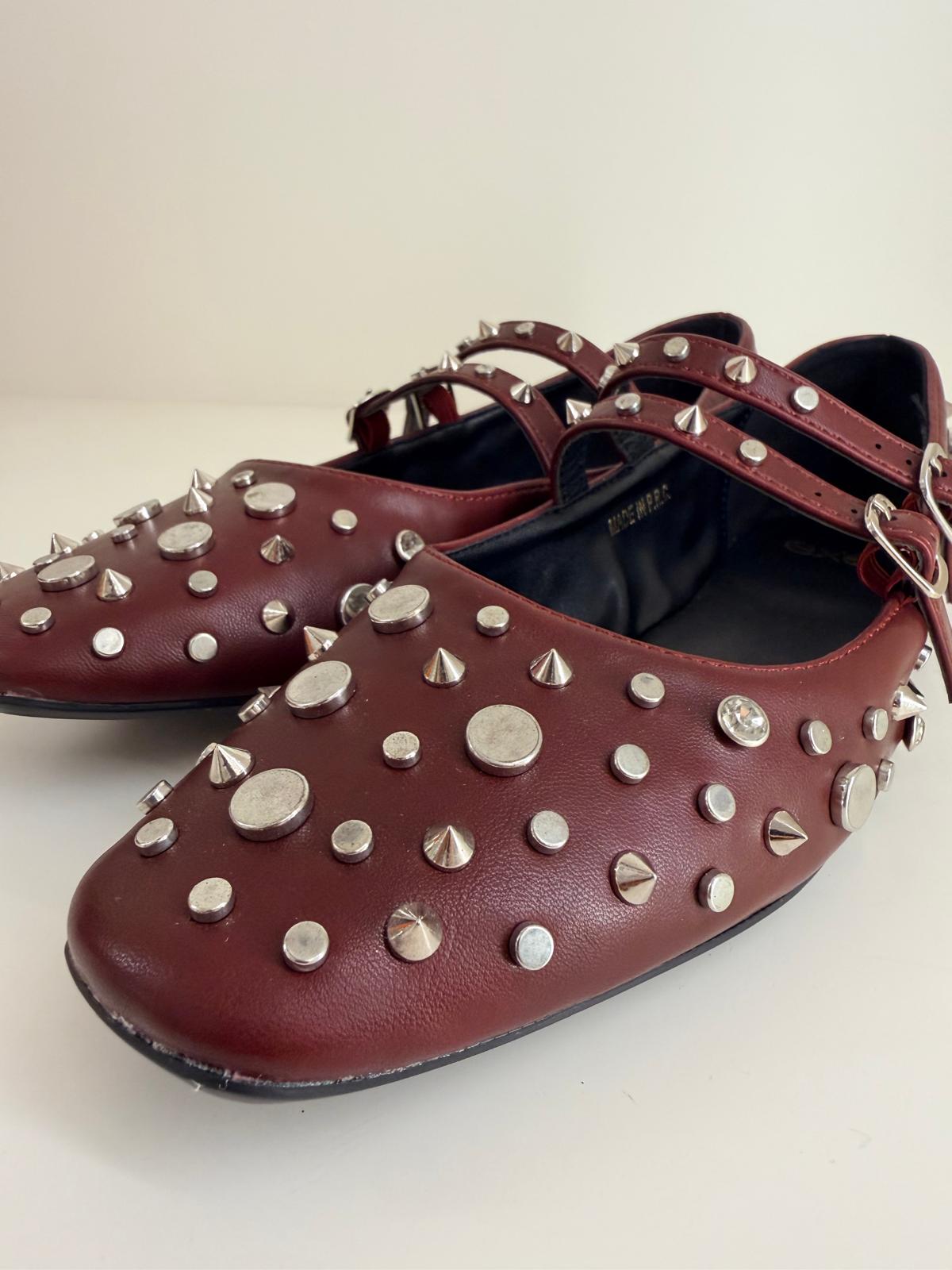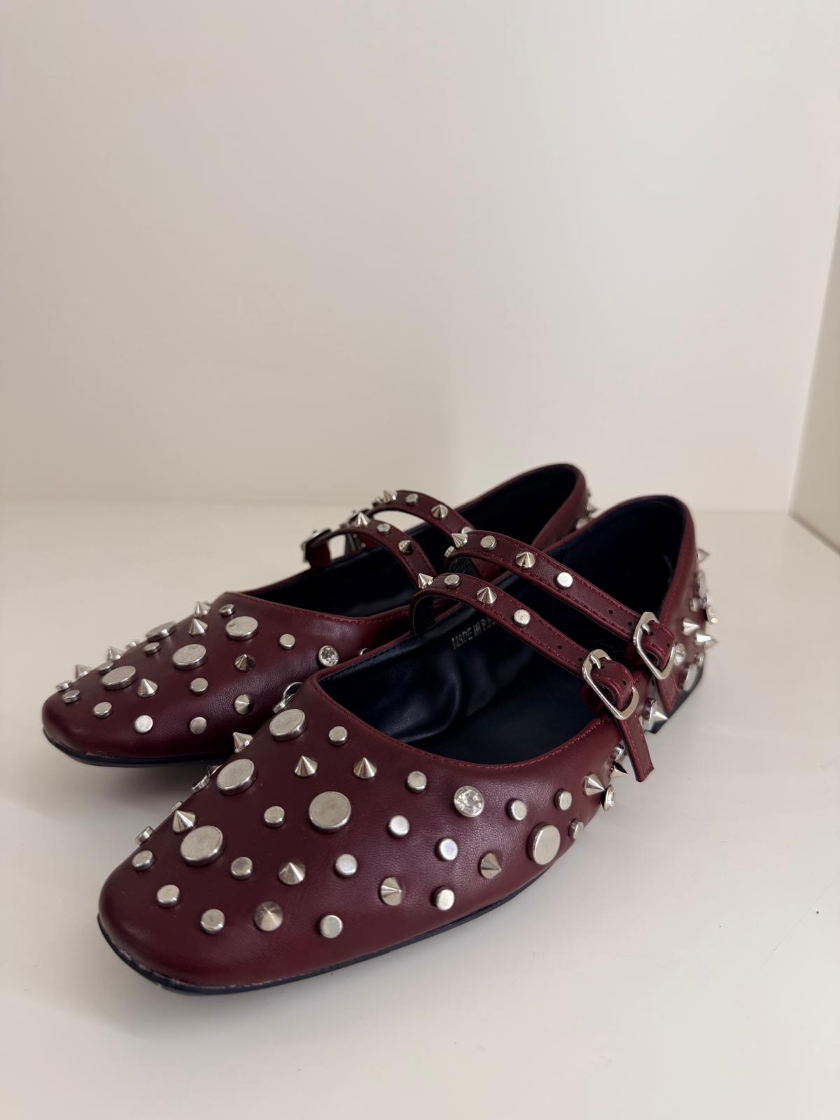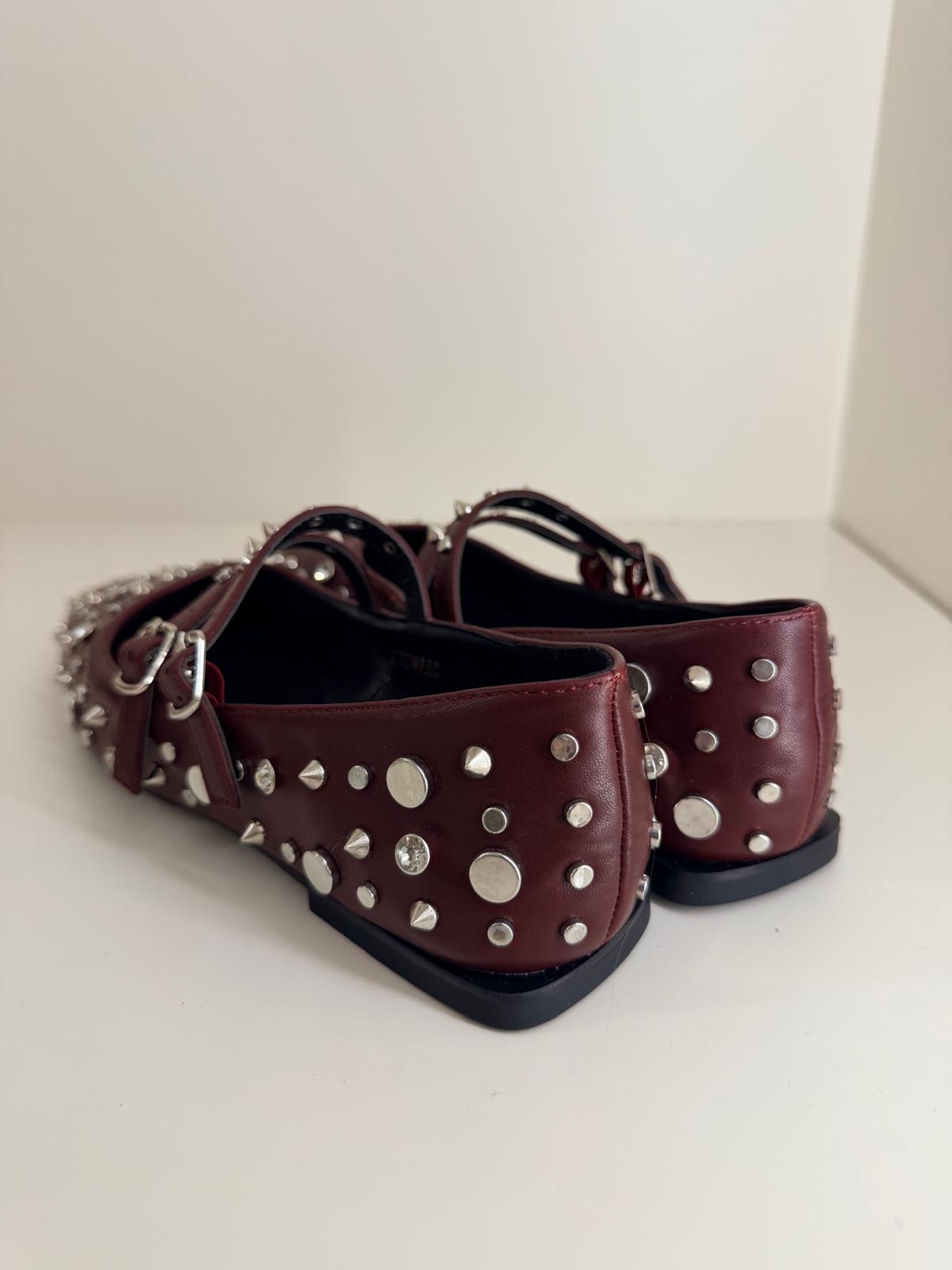 Dieser bordeauxrote Ballerina aus Öko-Leder besticht durch seine flächendeckende Verzierung mit Metallnieten in verschiedenen Formen und Größen, die ihm einen kühnen und modernen Charakter verleihen.