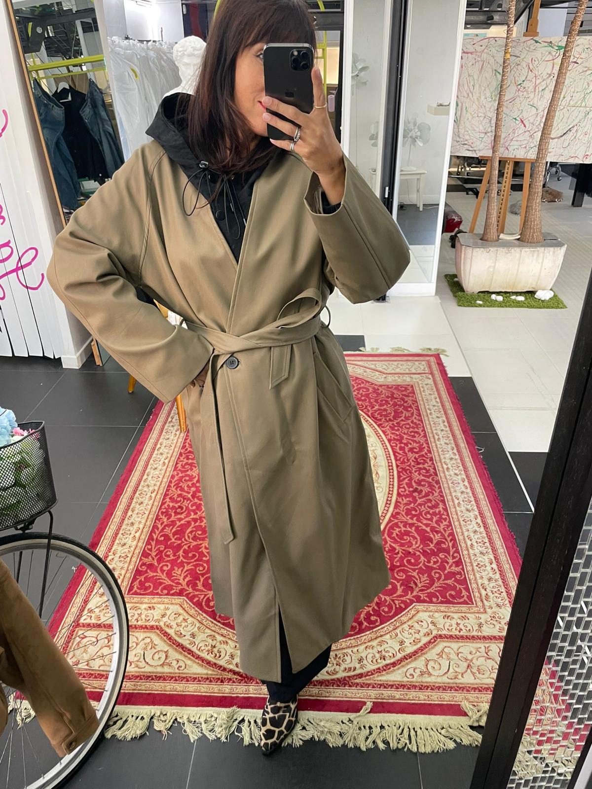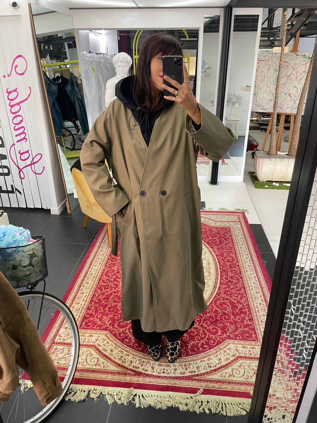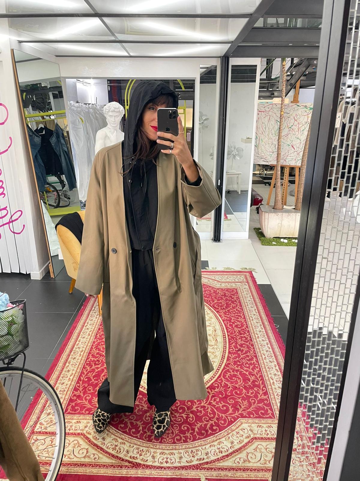 Der Mantel ist ein langes, bodenlanges Modell aus glattem Stoff.