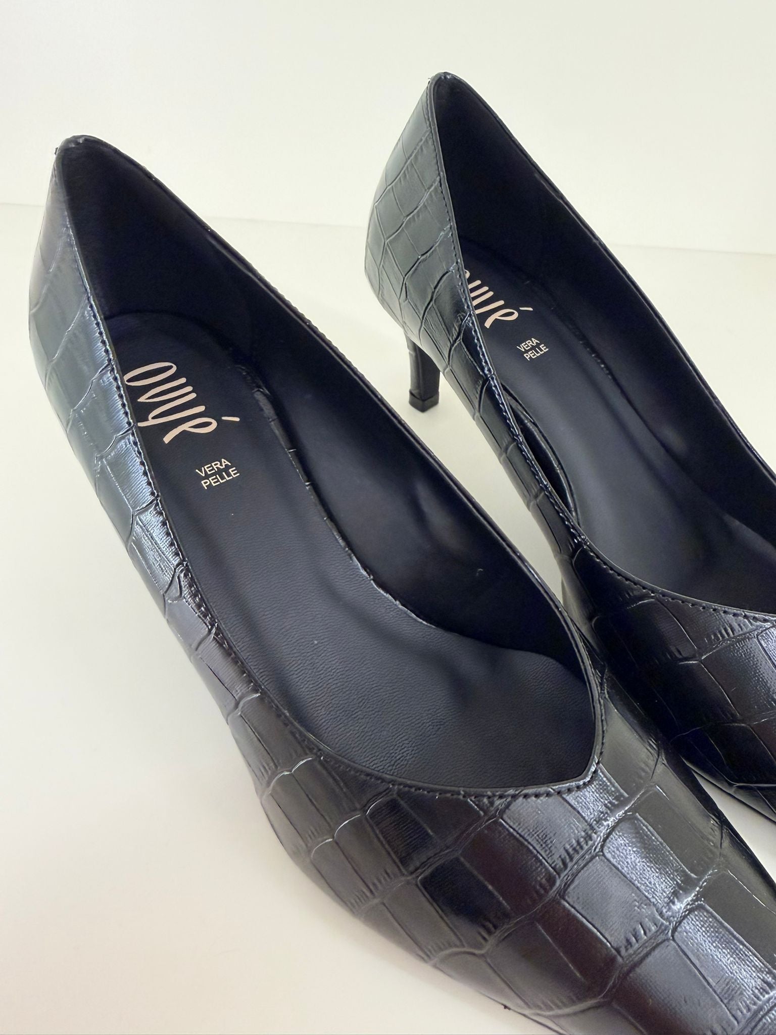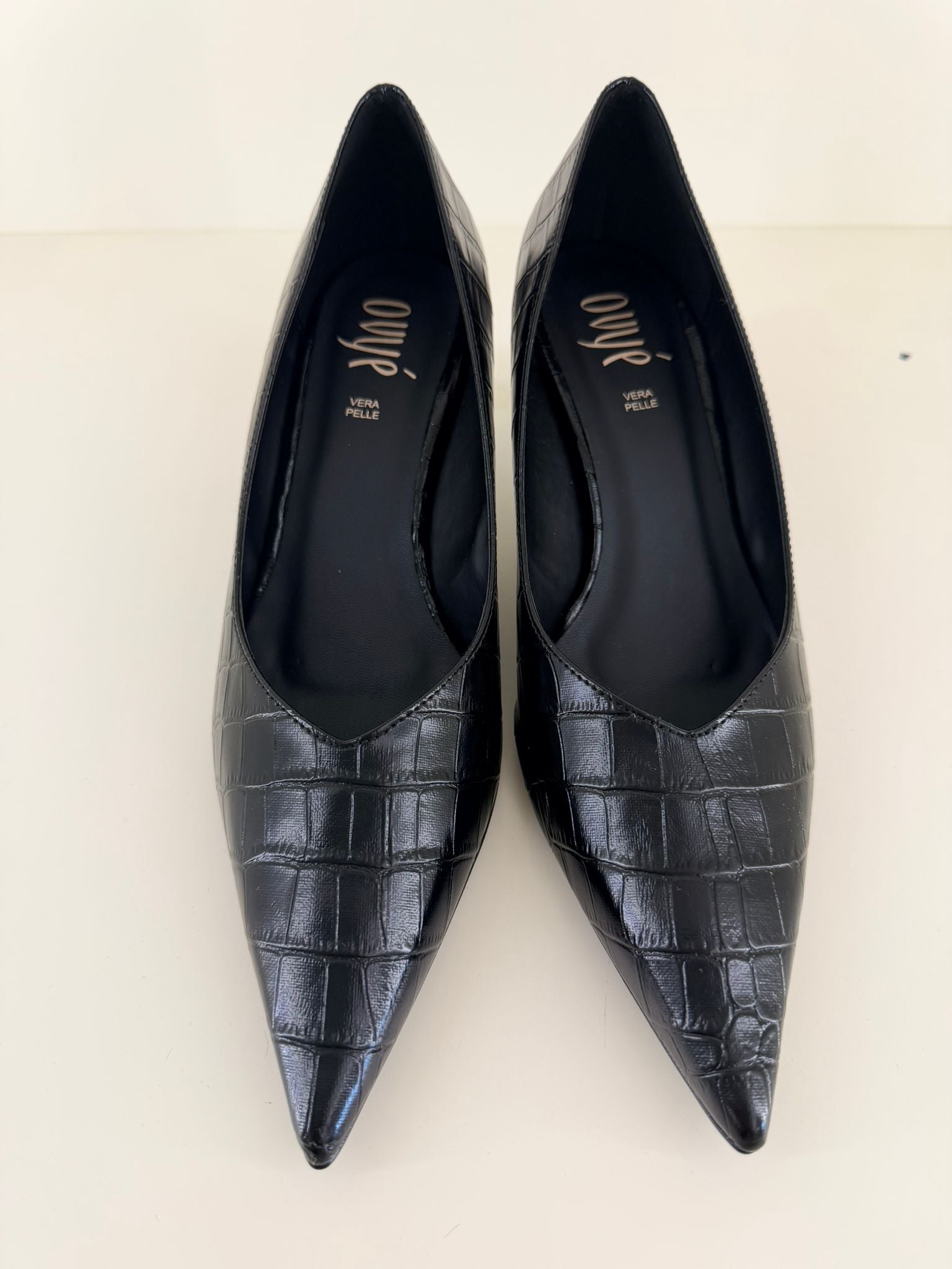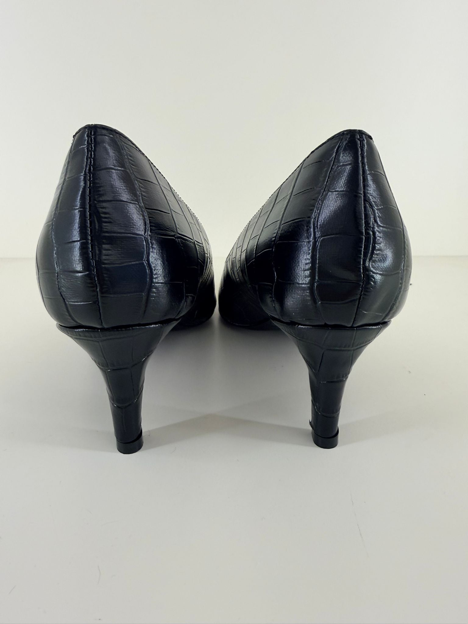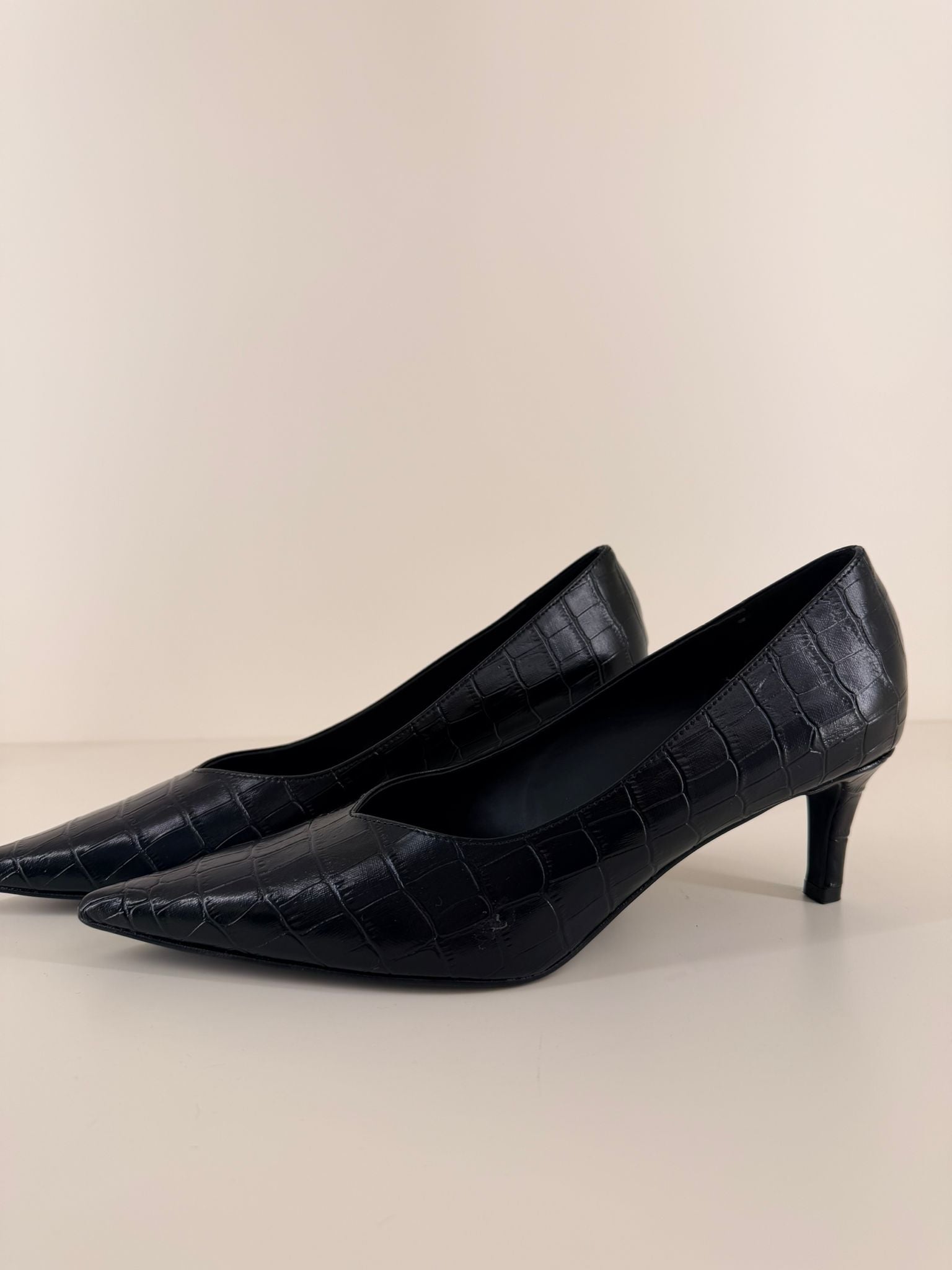 Queste décolleté a punta in ecopelle con elegante stampa effetto coccodrillo offrono un'alternativa chic al classico nero liscio.