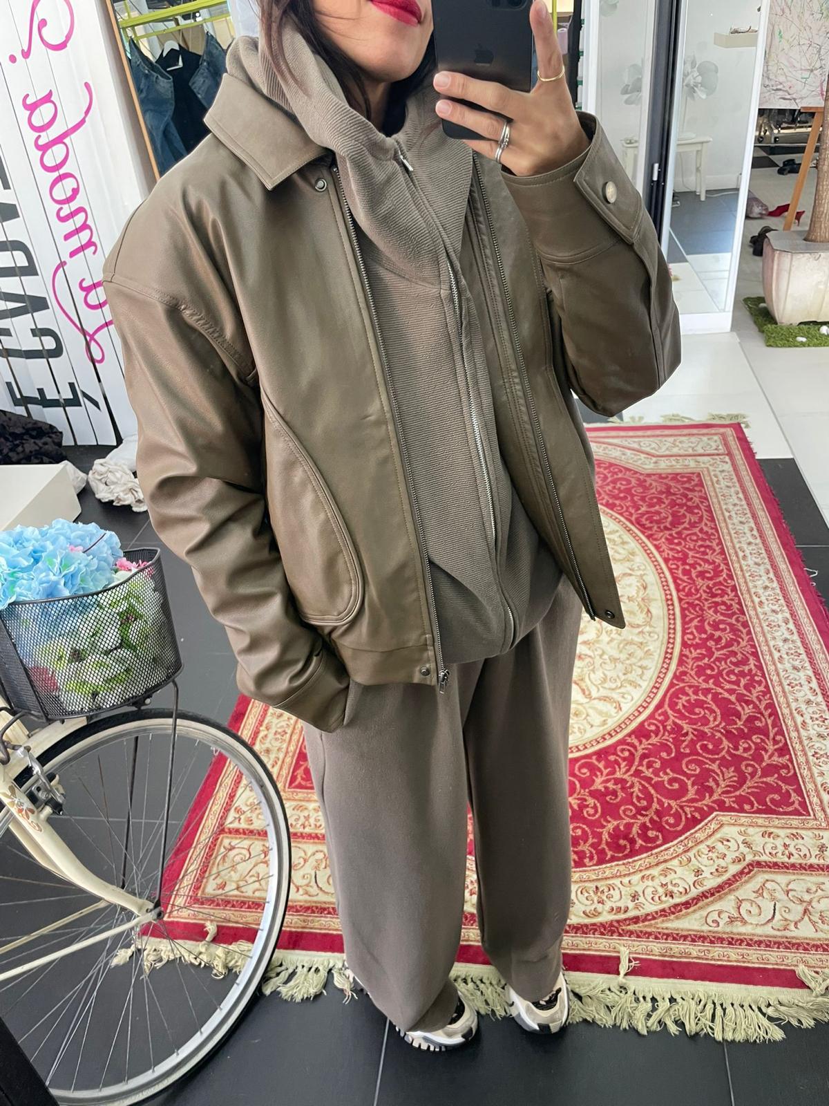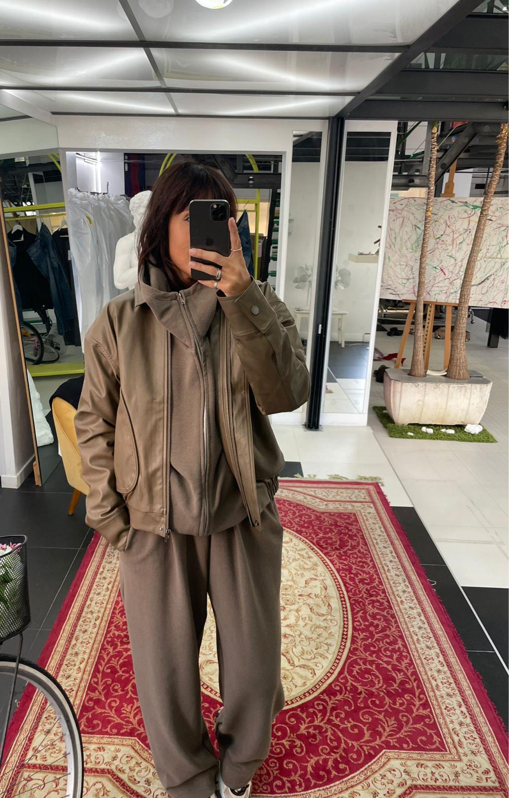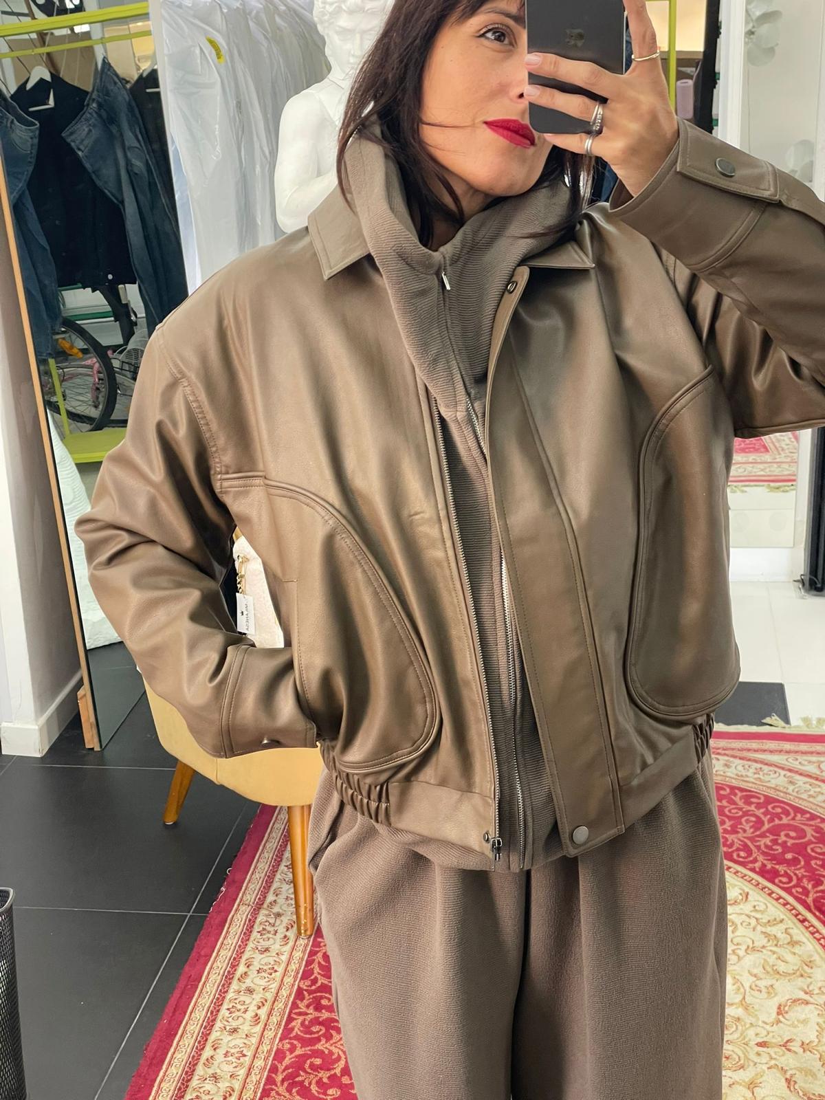 • Details: große, geschwungene Nähte, die die seitlichen Paspeltaschen definieren, geknöpfte Manschetten und Saum mit gerafftem Gummizug, der Volumen erzeugt und die Silhouette definiert.