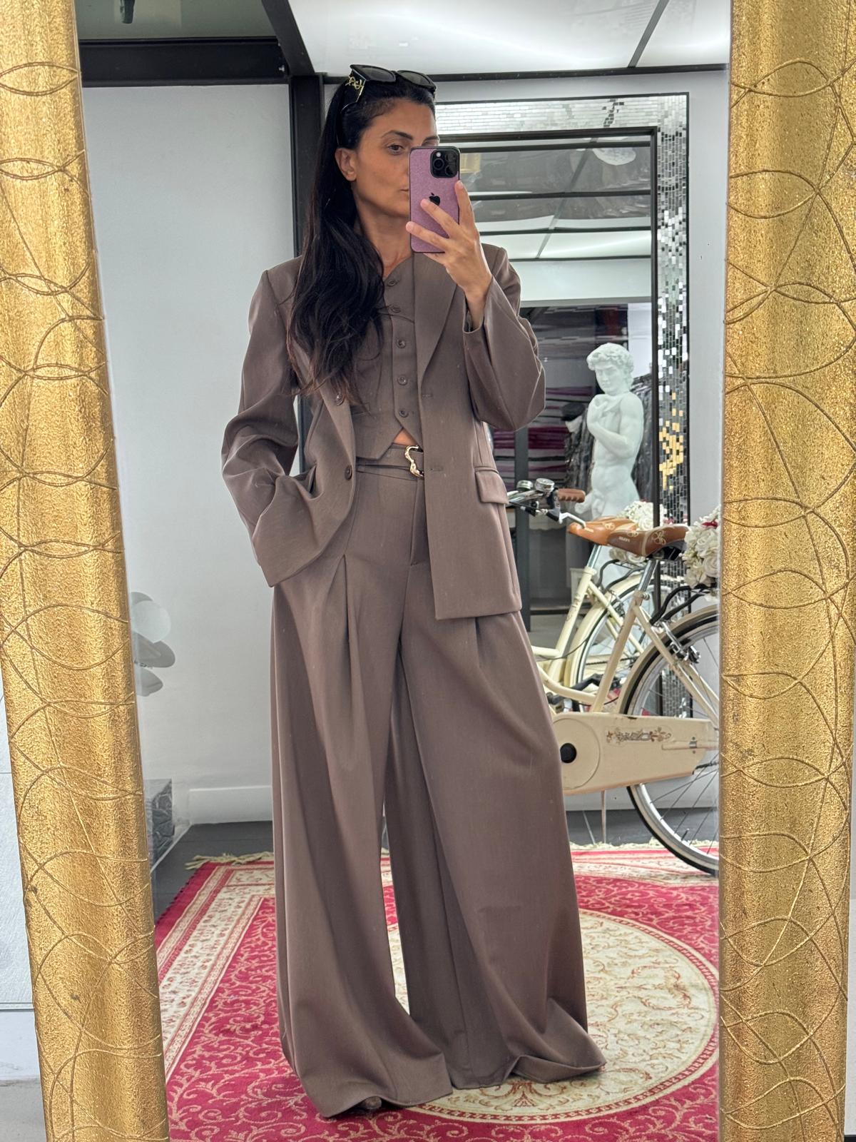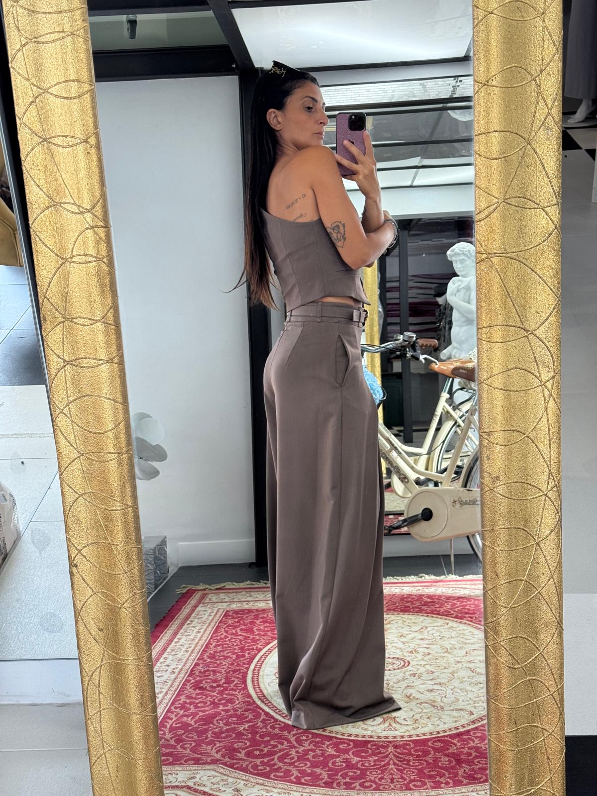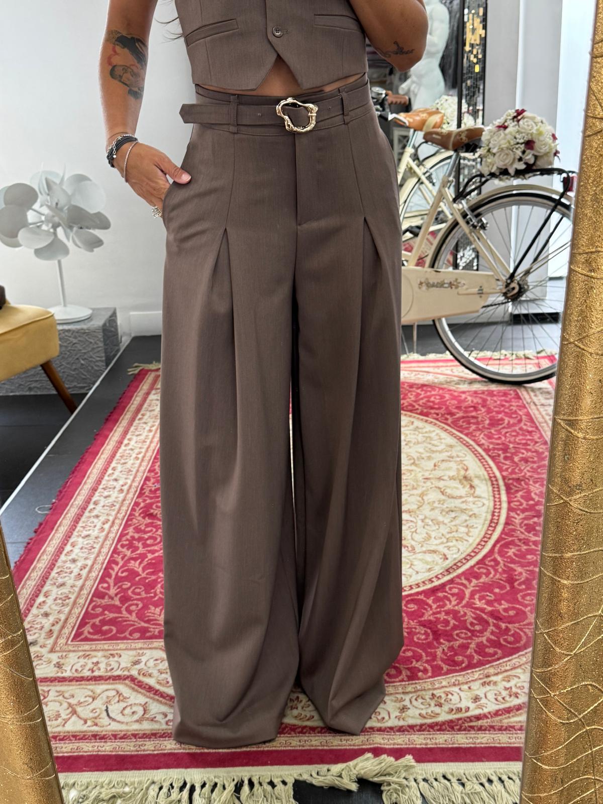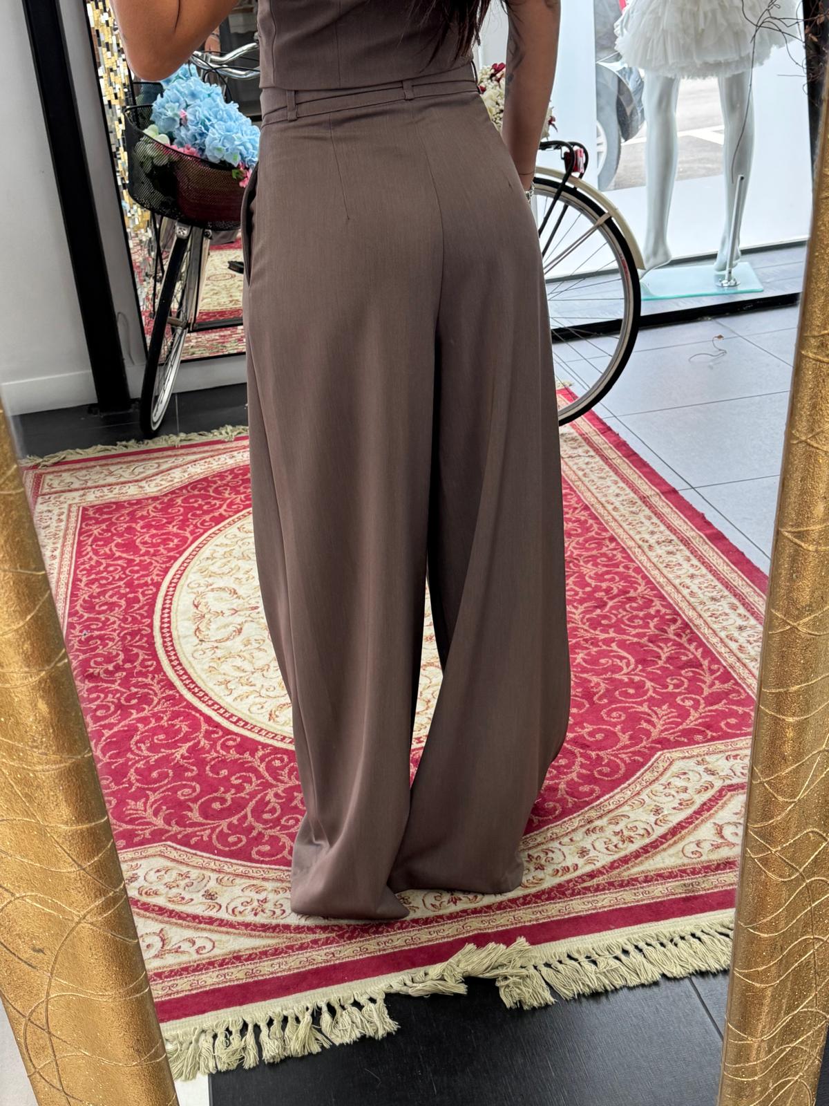 Hose: hochgeschnitten, mit Falten und weiten, fließenden Beinen.