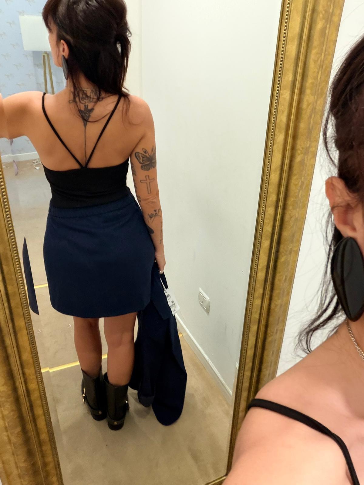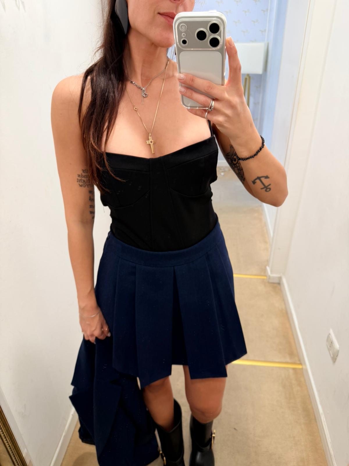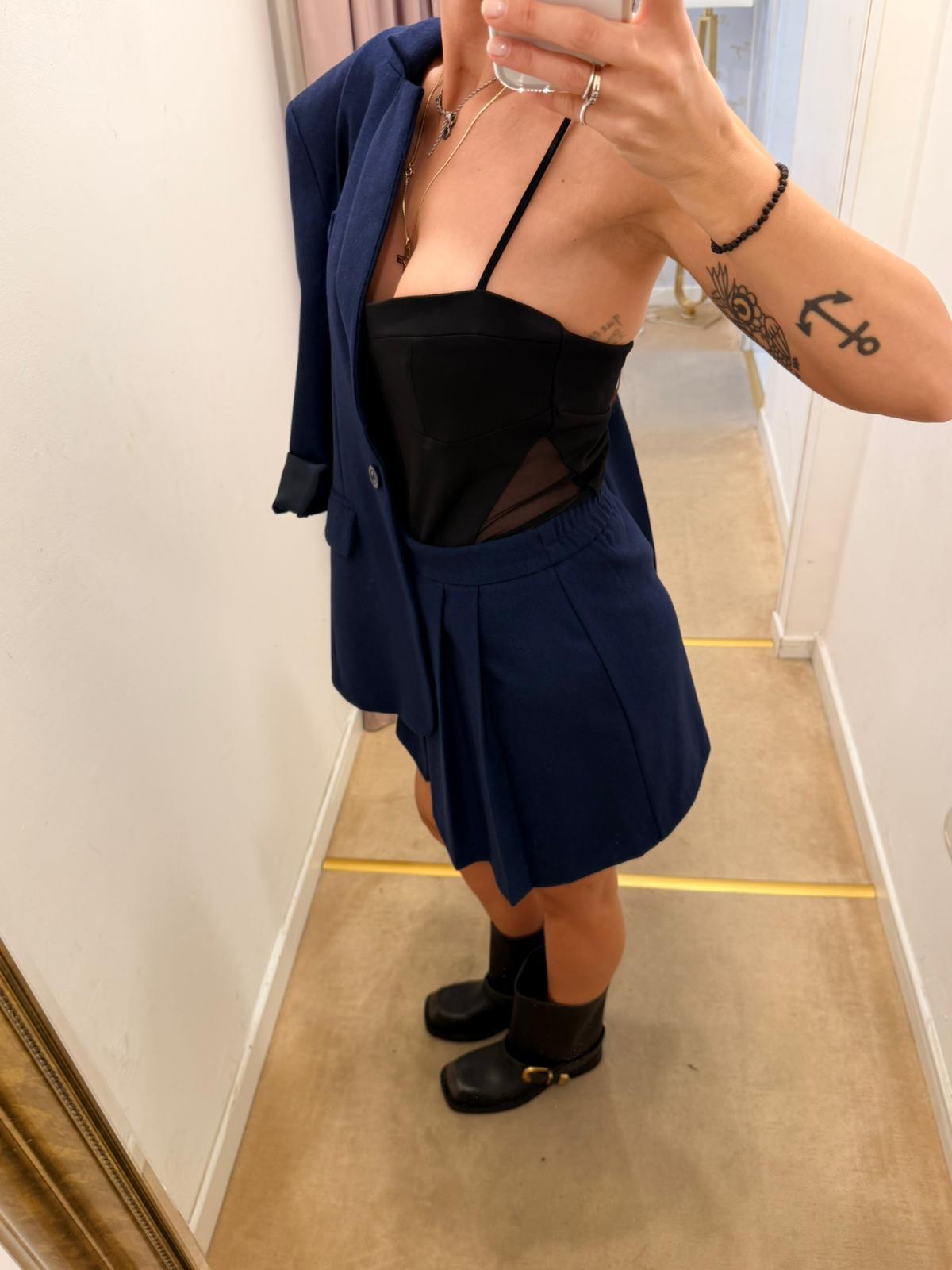 Minigonna blu dal taglio a portafoglio con pieghe sul davanti. Realizzata in tessuto strutturato, ha una linea svasata che dona movimento e femminilità. Perfetta da abbinare a blazer coordinato o capi più casual per un look moderno e versatile.