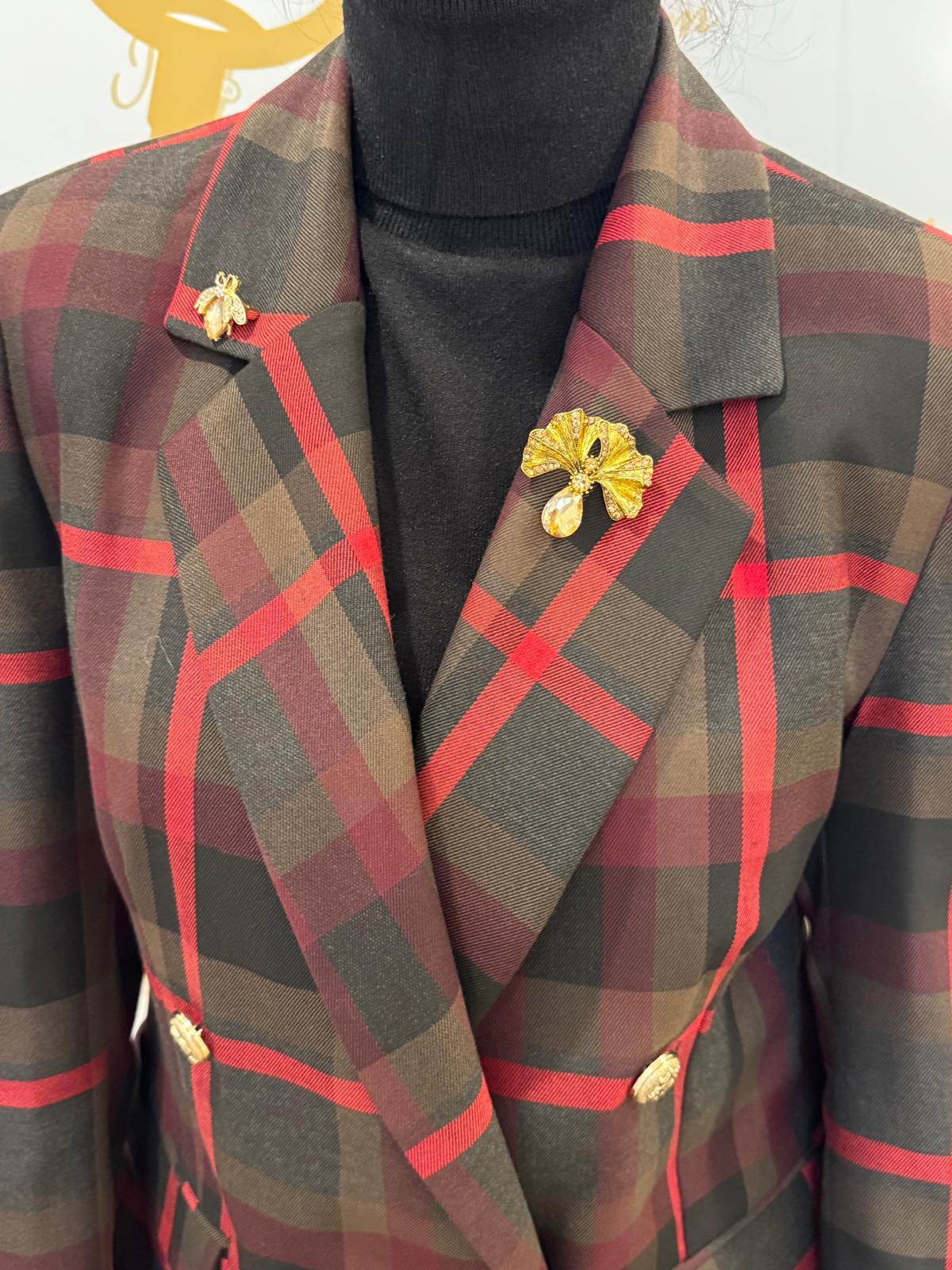 Dieser doppelreihige, karierte Blazer in Burgunderrot, Schwarz und Taubengrau zeichnet sich durch einen leicht taillierten Schnitt aus, der die Silhouette betont und gleichzeitig einen hohen Tragekomfort gewährleistet.