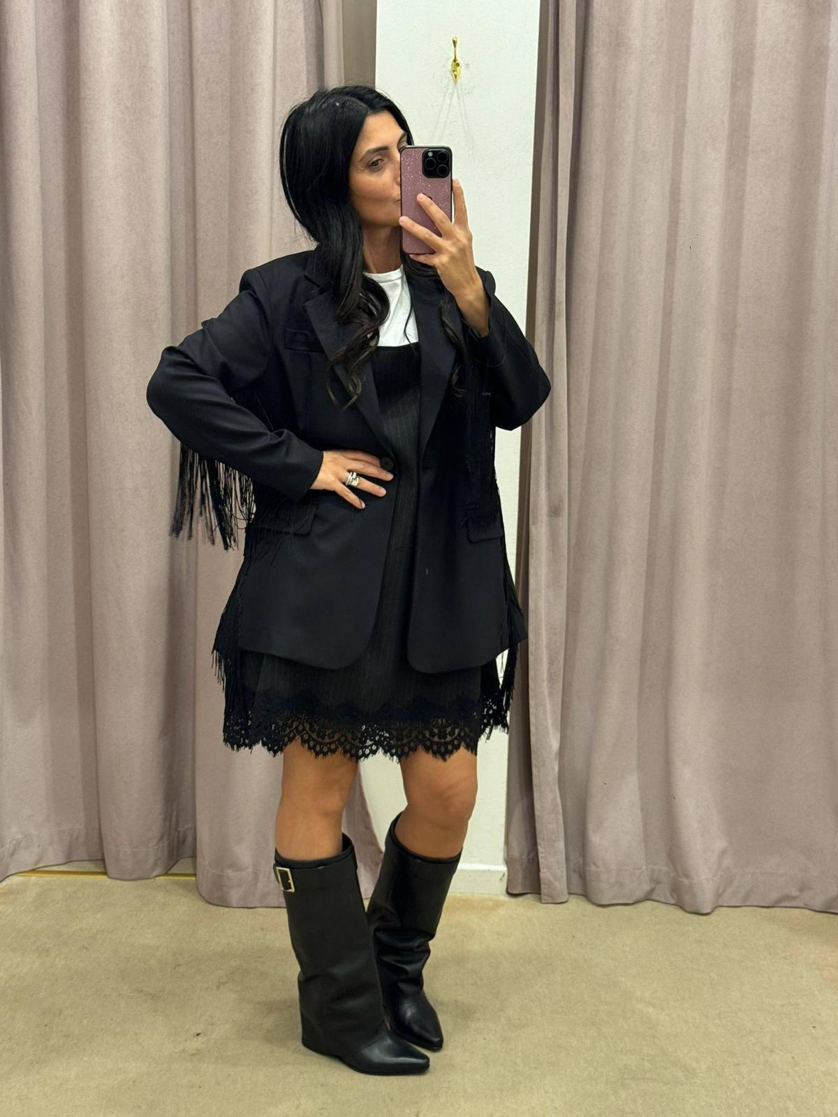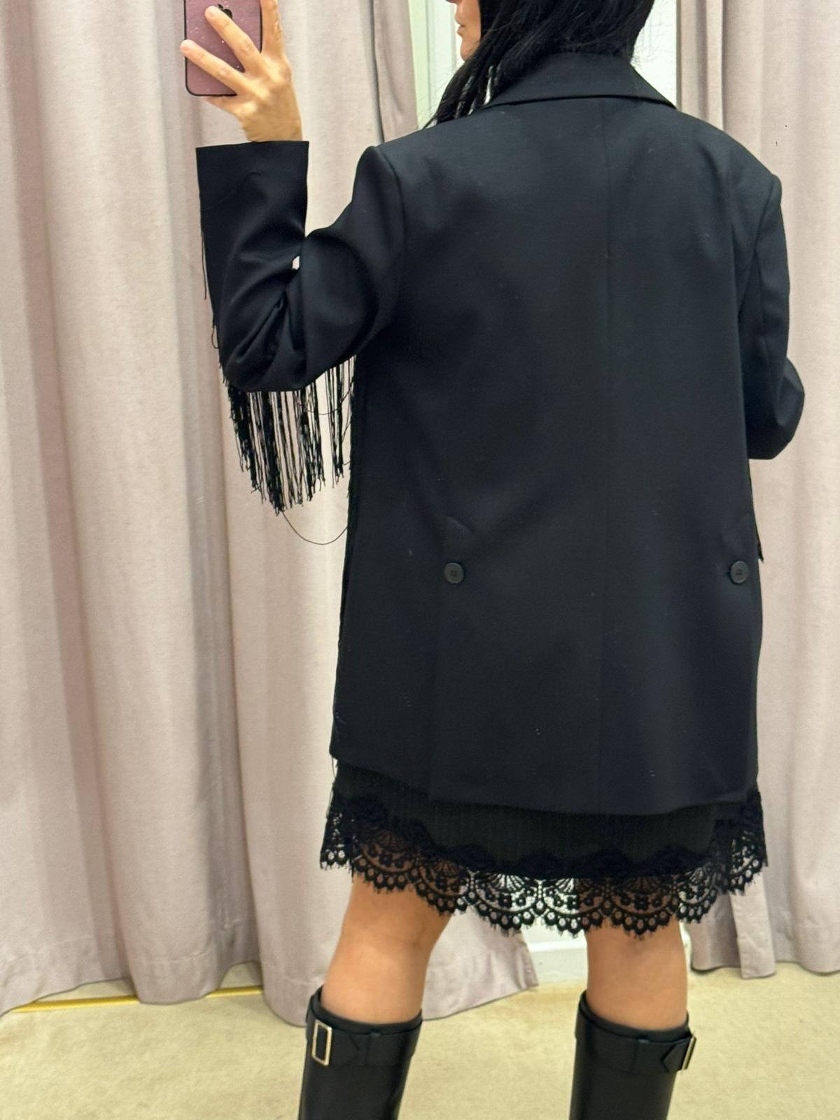 SCHWARZER BLAZER MIT SPANNUNGSFRANSEN IN