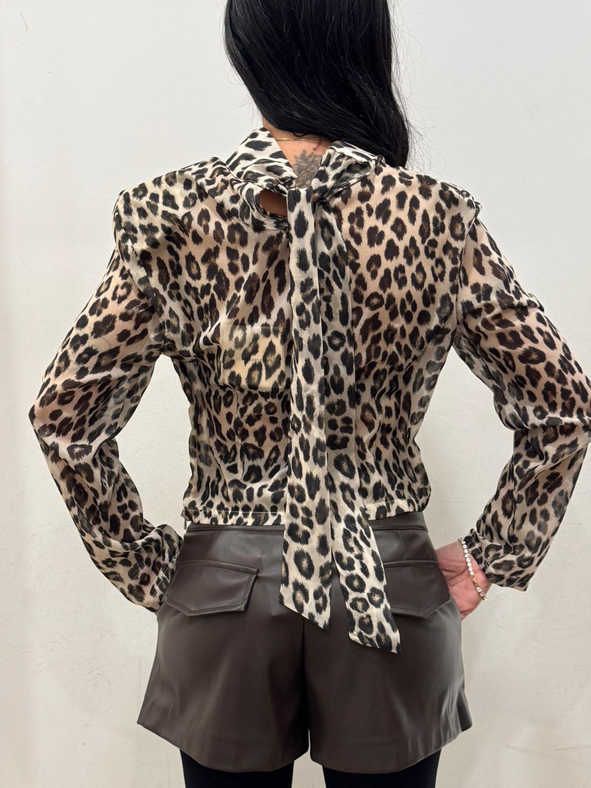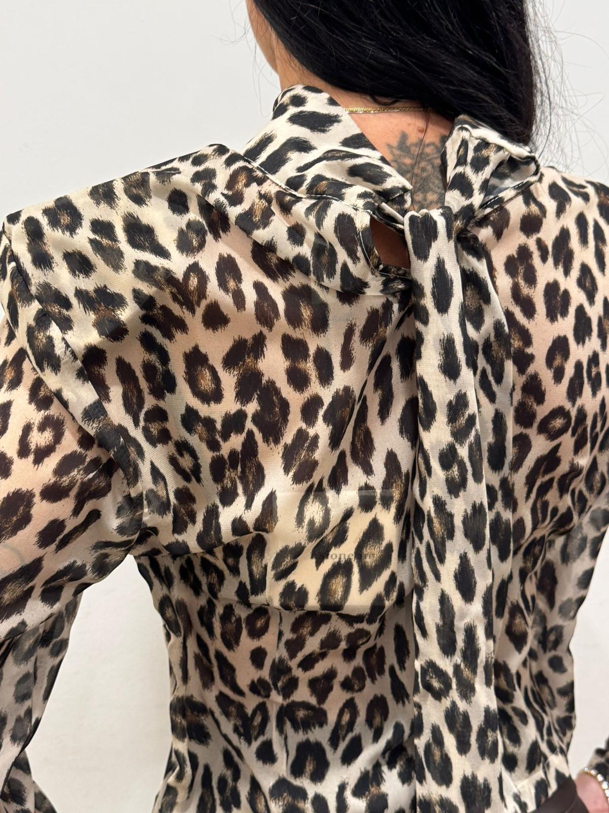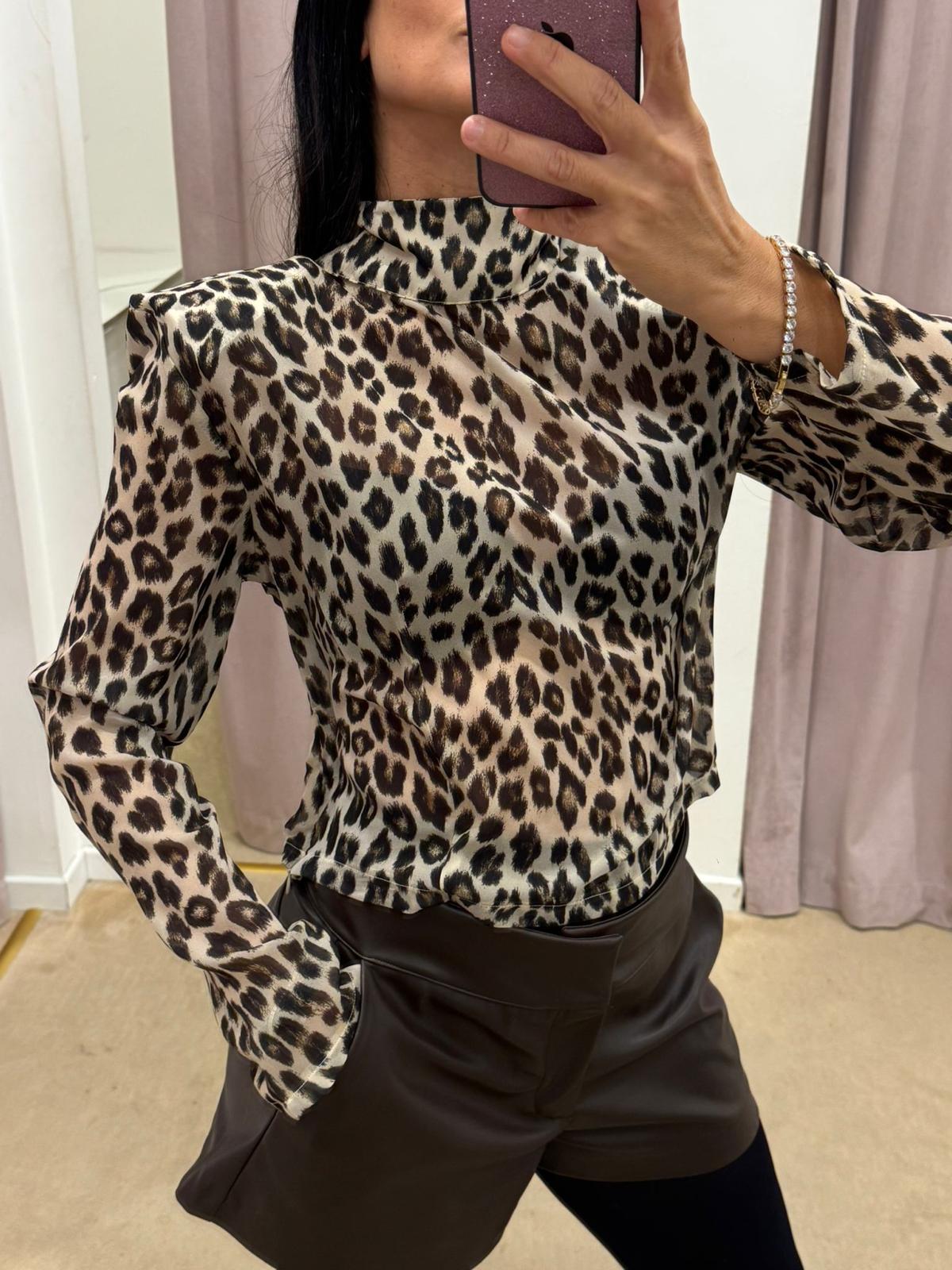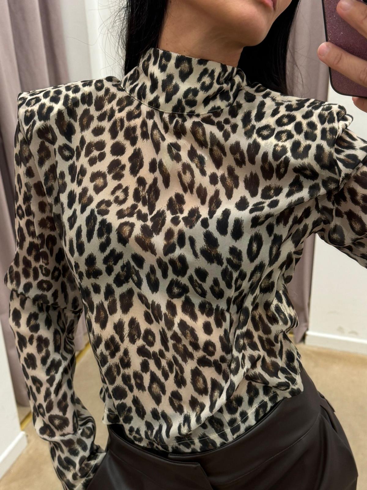 Das Kleidungsstück ist aus einem Satinstoff mit Tiermuster gefertigt und zeichnet sich durch einen leicht gerafften Stehkragen, strukturierte Schultern und lange Ärmel aus.