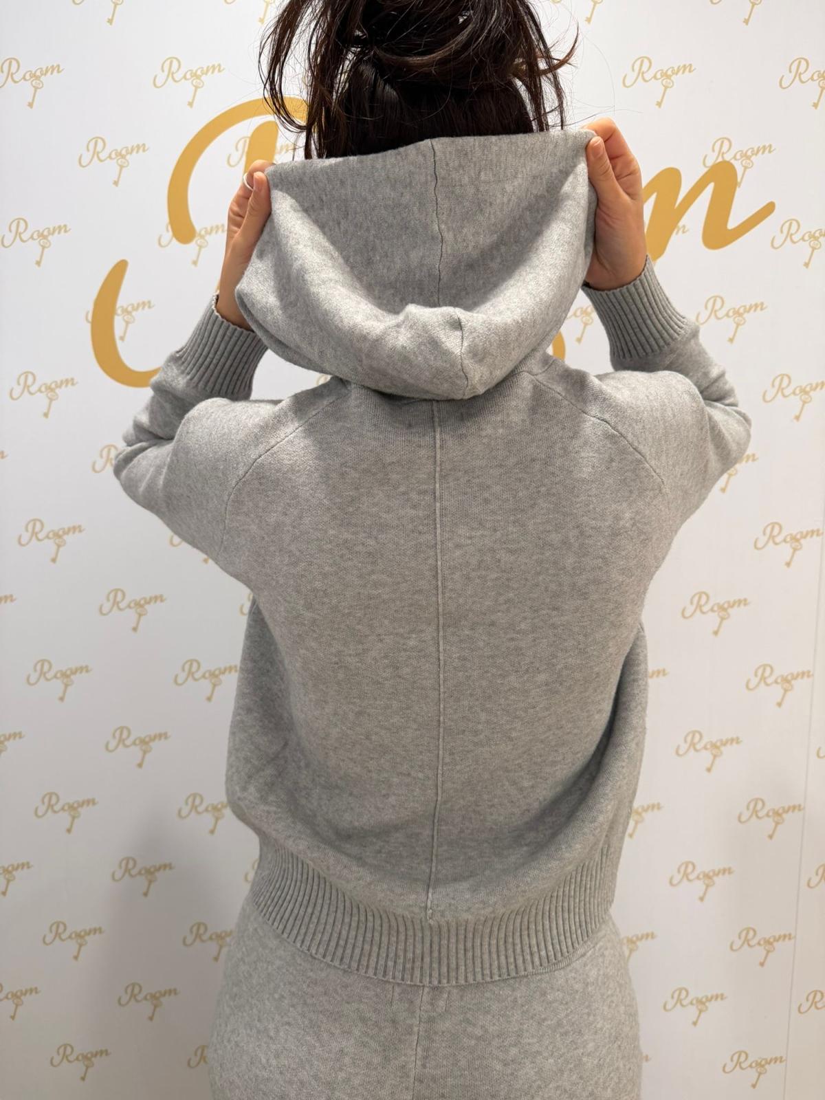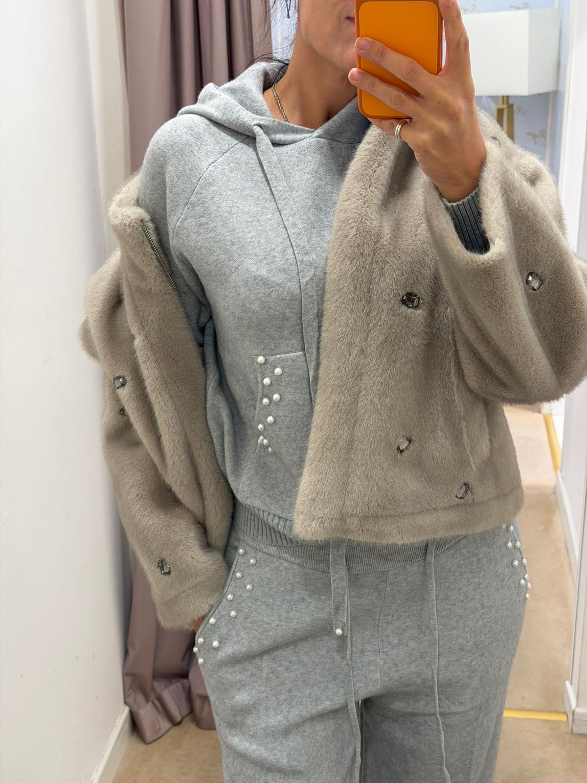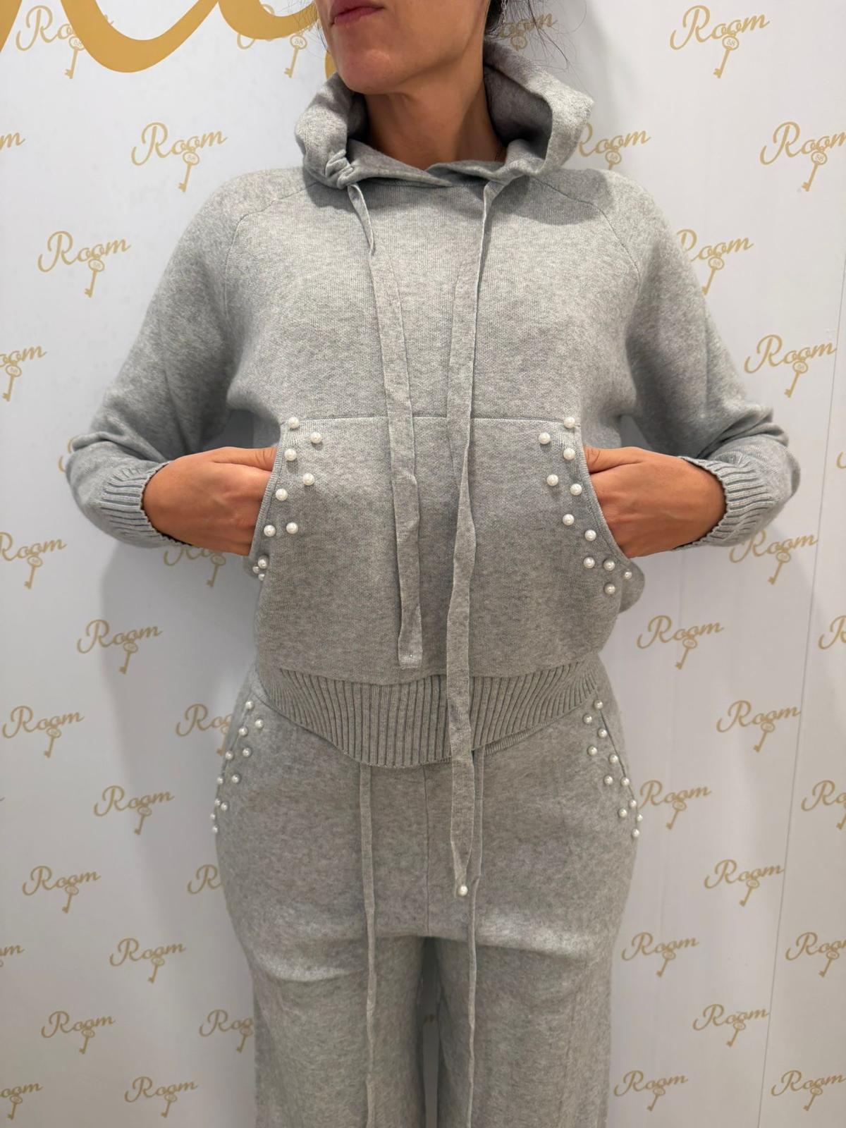 Das Modell verfügt über eine Kapuze mit Kordelzug, eine Kängurutasche und Perlenapplikationen, die die Vorderseite zieren und selbst den sportlichsten Looks eine elegante Note verleihen.